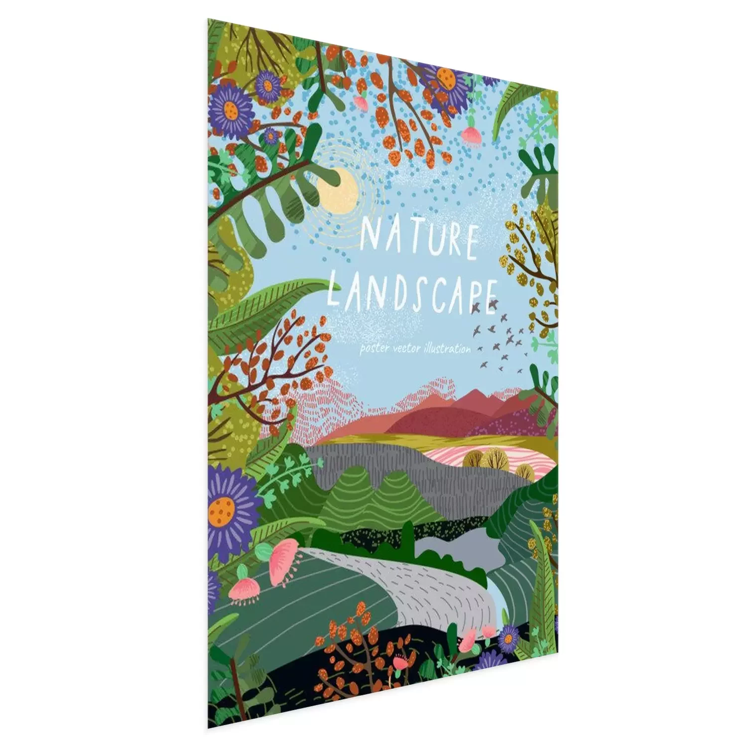 Poster Nature landscape. Vector background illustration with hills, road, plants and flowers. Summer or spring day