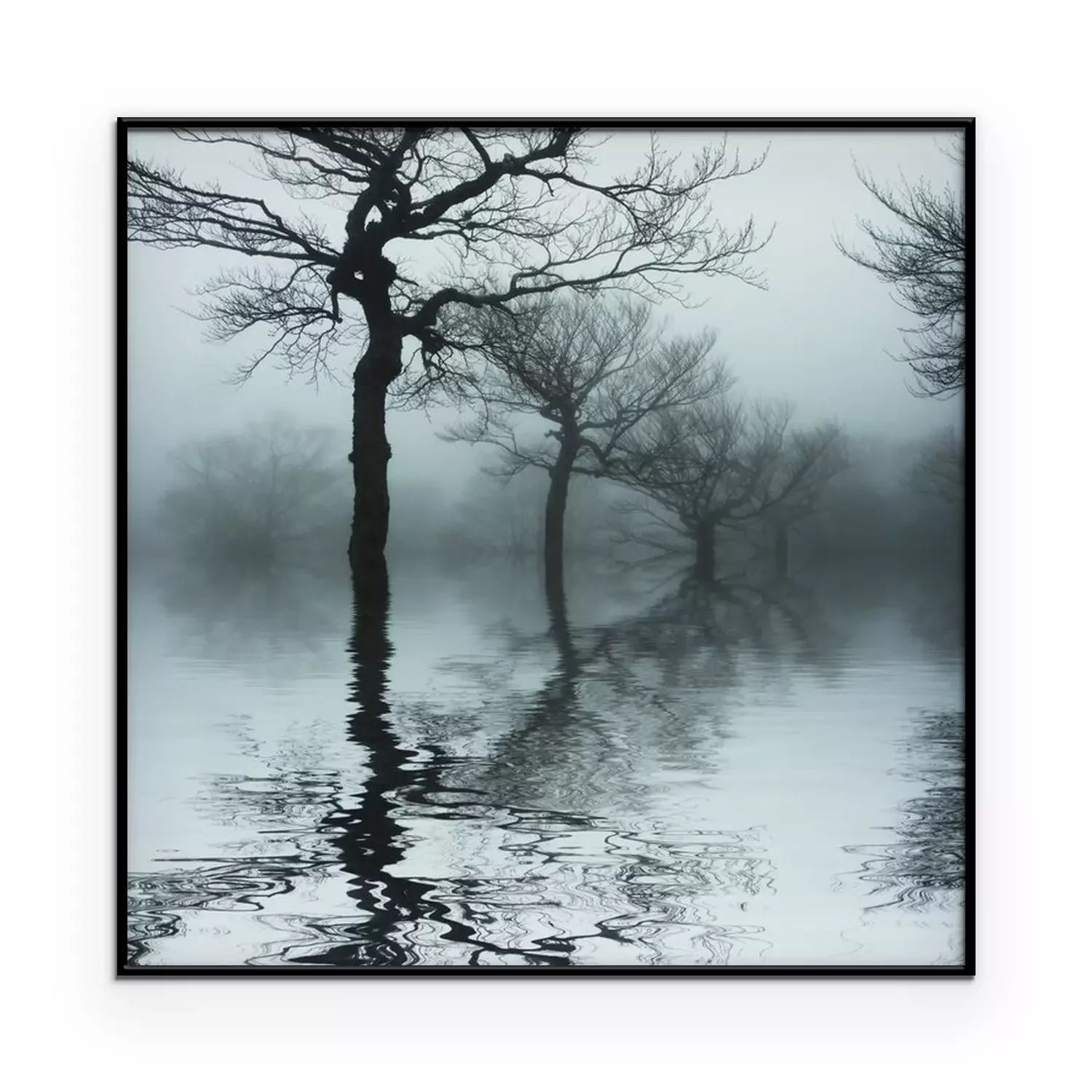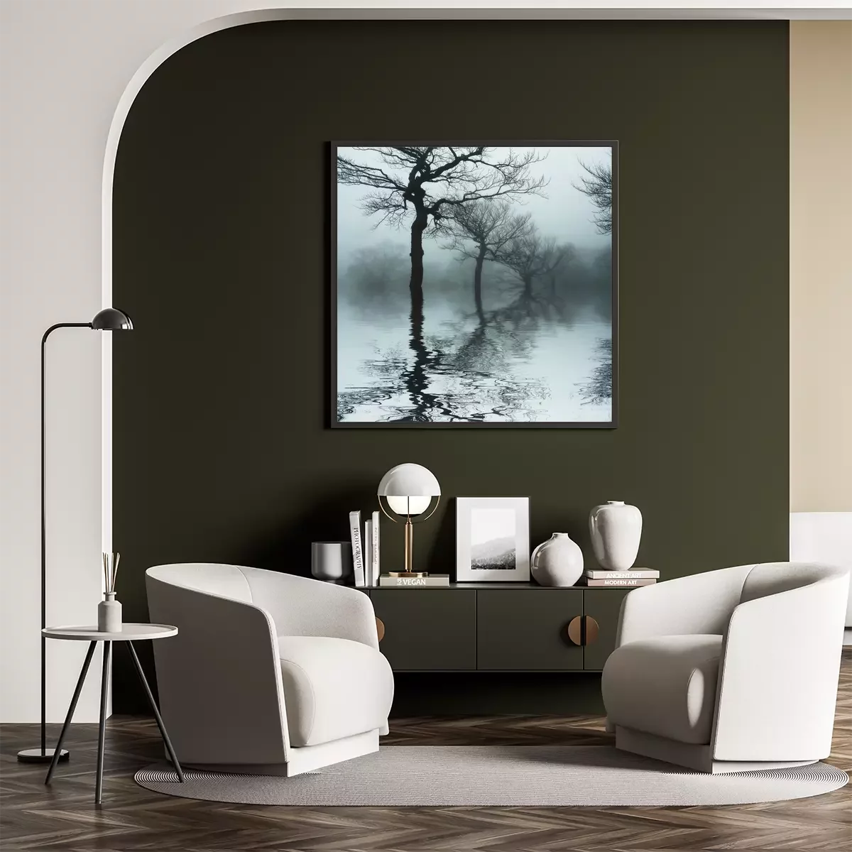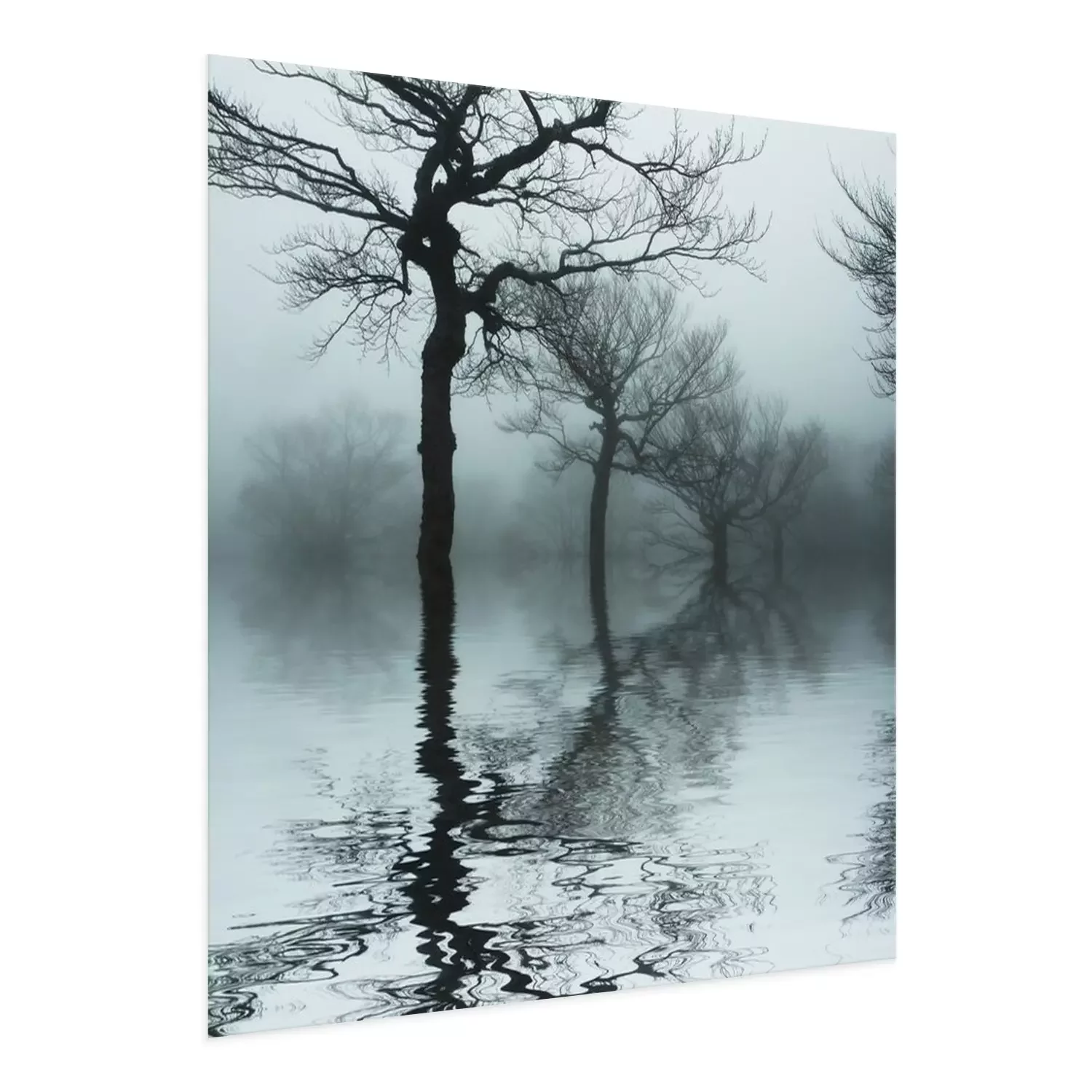 Poster: Natuur en landschappen van een mistig meer dat takken weerspiegelt