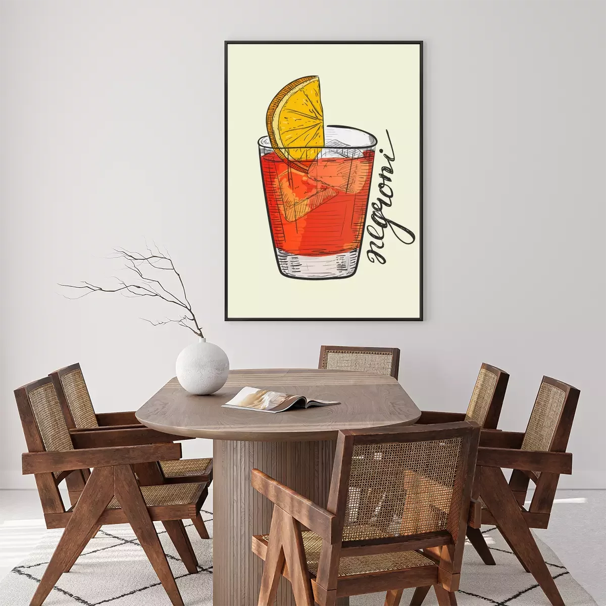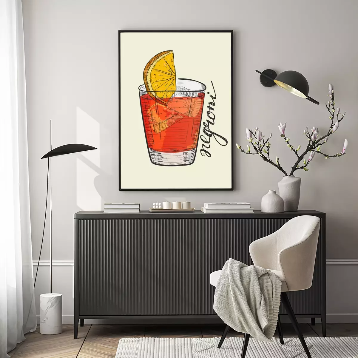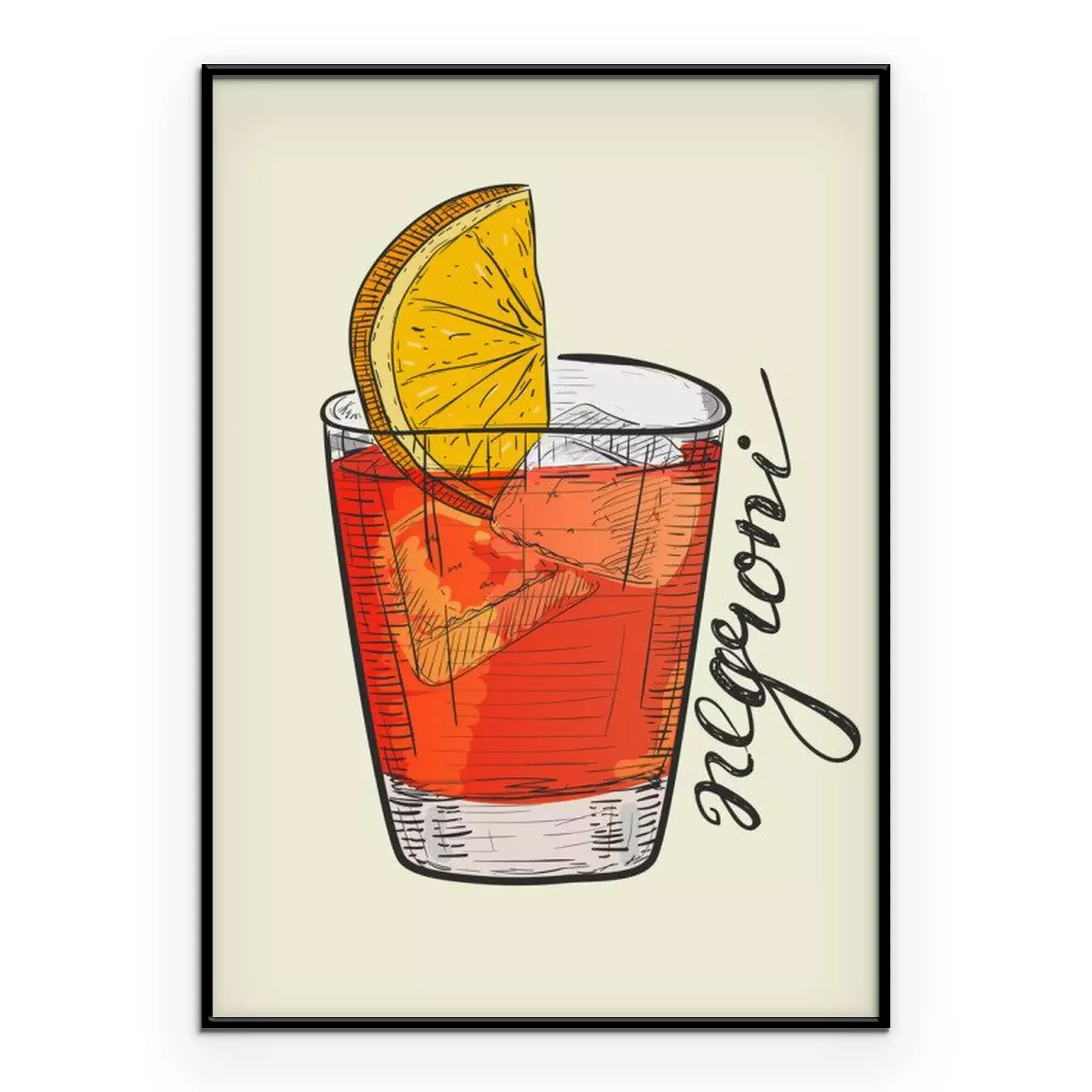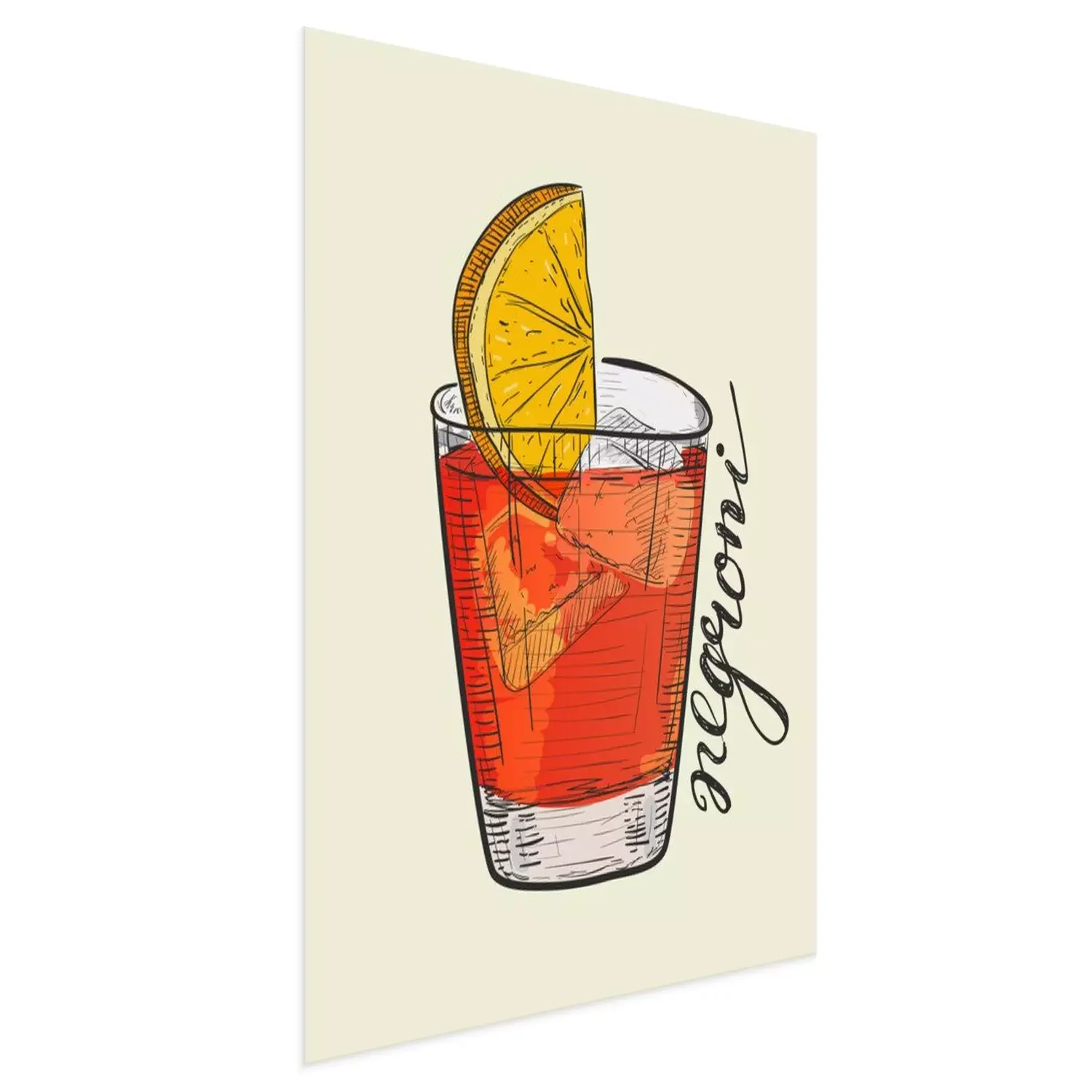 Poster: Negroni alcoholic cocktail. Hand drawn vector illustration in sketch style. Fashionable drink with orange and ice cubes