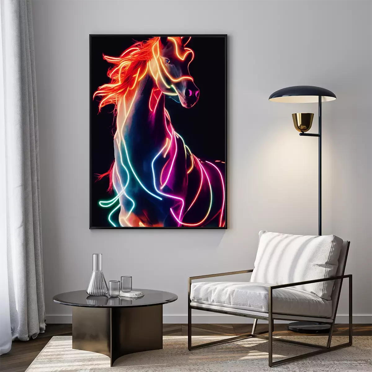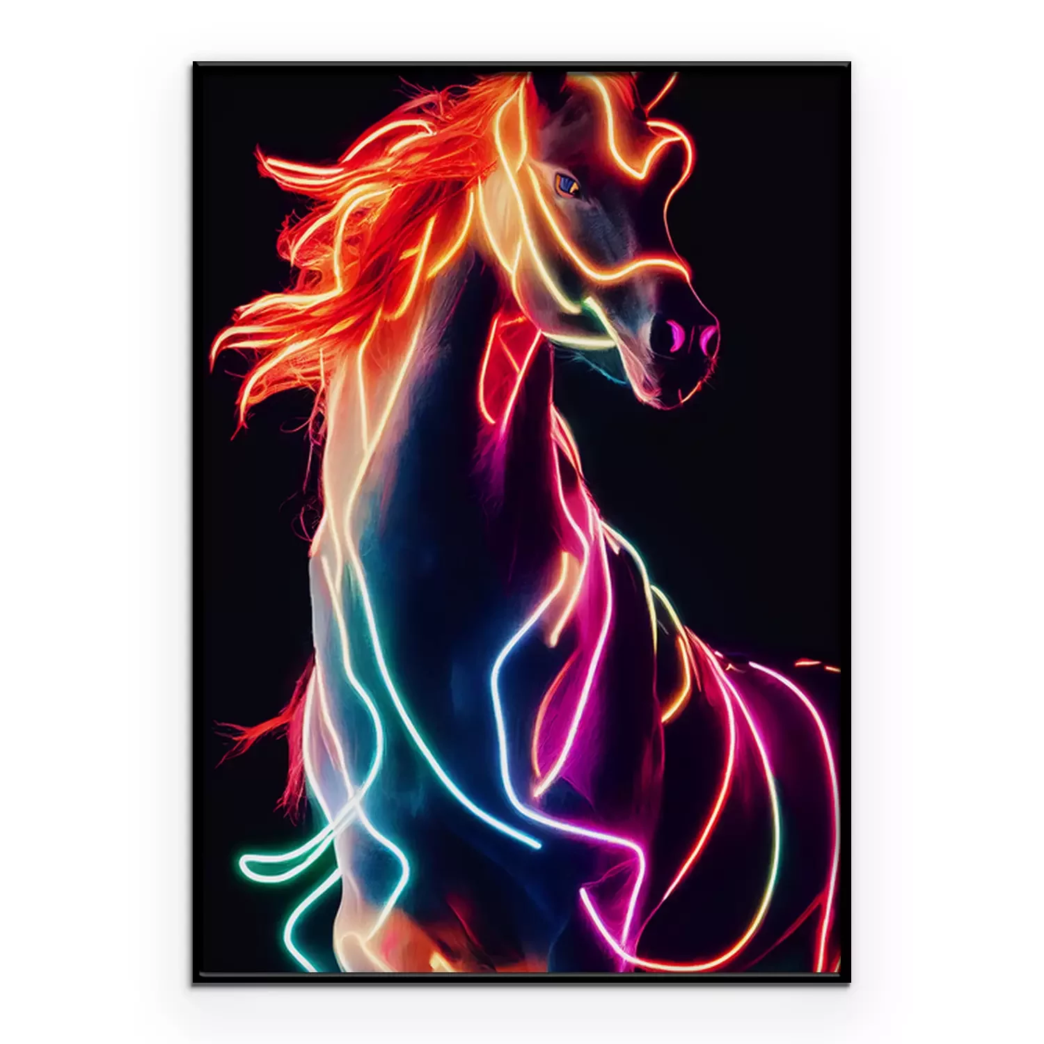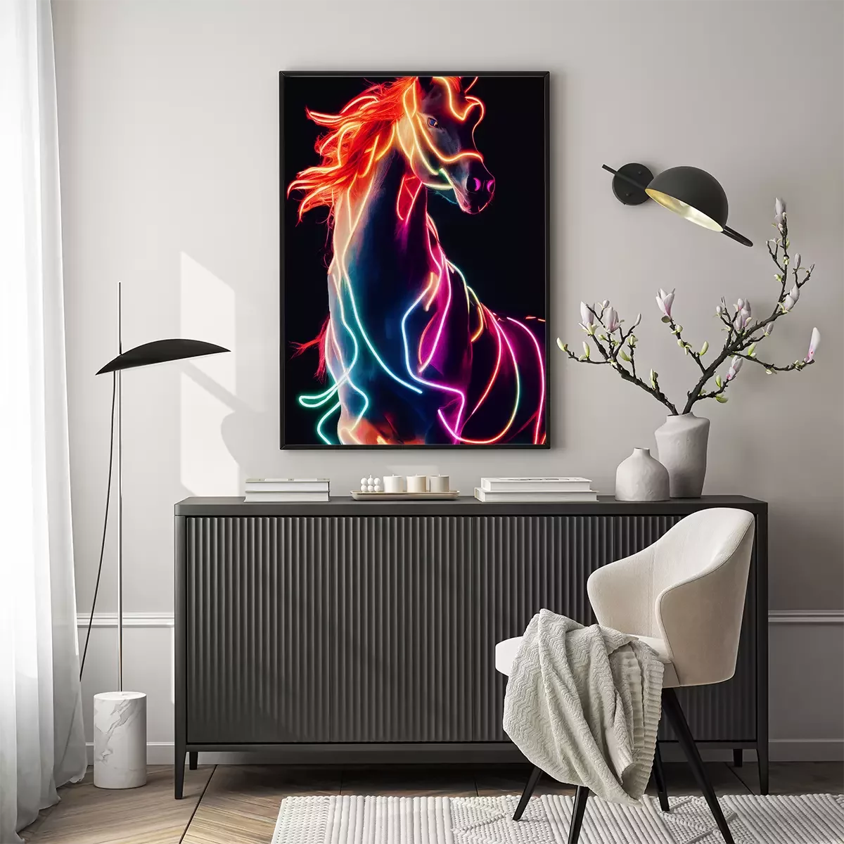 Posters met paarden zijn een voorbeeld van decoratie die zich onderscheidt door tijdloze elegantie en onvergankelijke schoonheid. Deze dieren werden graag geschilderd door bekende schilders over de hele wereld, dus je kunt er zeker van zijn dat dit een decoratief motief is dat aandacht verdient. Vooral omdat we voor jou een echt unieke paardenposterhebben gekozen. Het paard kan worden afgebeeld in galop of grazend in de wei, in zijn geheel of in portret, realistisch of modern. Wij hebben echter gekozen voor een originele en verrassende paardenposter. Het paard is omwikkeld met kleurrijke, neonbuizen die het op een magische manier verlichten en kleurrijke reflecties op zijn lichaam werpen. Doordat het een ongebruikelijke poster is, wordt het paard de nieuwe blikvanger in de inrichting en trekt het alle aandacht naar zich toe, waardoor de huidige opstelling verandert. Wat deze muurdecoratie zo bijzonder maakt, is de combinatie van het klassieke, bekende representatieve motief met een moderne manier van presenteren. Posters met een paard zijn populair in de wereld van interieurinrichting en vormen een bewezen manier om tijdloze decoratie te creëren die niet uit de mode raakt. Onze paardenposter gemaakt met fluorescerende neonlichten bieden een geheel nieuwe kijk op het onderwerp, waardoor de inrichting waarin ze zich bevinden, lichtheid, frisheid en scherpte krijgt, hoewel ze nog steeds verwijzen naar de klassieke portretten van deze dieren. In welke interieurs passen paardenposter goed? Het is een perfect idee om een modern en minimalistisch ingerichte woonkamer nieuw leven in te blazen. Opgehangen boven de bank geeft het de ruimte een eigenzinnig karakter. Op deze manier kun je ook de uitstraling van de hal veranderen, waardoor deze plek, die meestal niet uitgesproken is, een opvallende visitekaartje van je woning wordt. Dergelijke kleurrijke posters met paarden zijn ook een schot in de roos voor een jeugdige inrichting. In combinatie met textiel in neonkleuren zal de kamer bruisen van leven! Naar onze mening zullen dergelijke paardenposters voor aan de muur ook uitstekend passen in een thuiskantoor. Paarden aan de muur - twee of drie ontwerpen met zo'n neonmotief - zullen de ruimte die is toegewezen voor werk stimuleren tot creatief en innovatief denken. Wees niet bang voor veranderingen in de inrichting en kies voor onze poster - een paard in neonstijl zal je interieur veranderen!