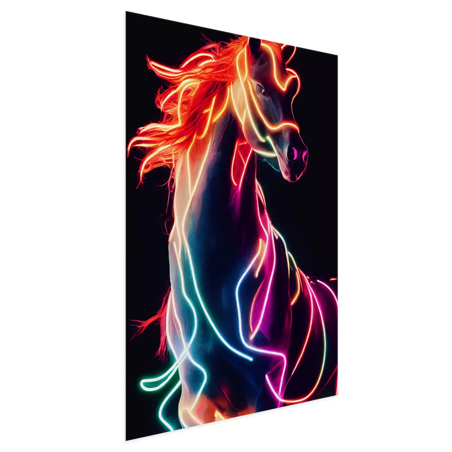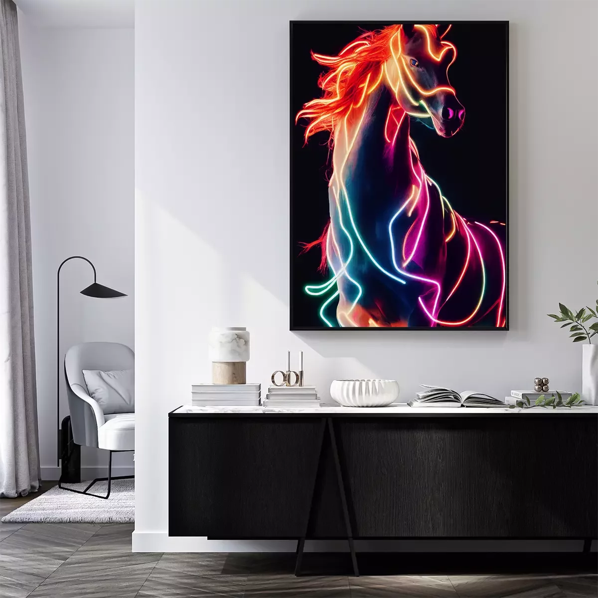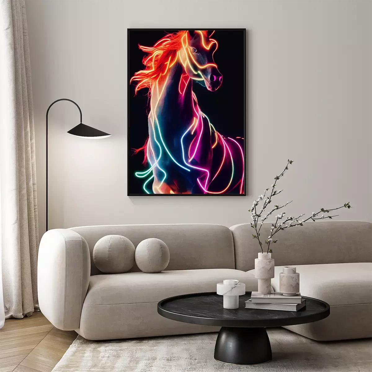 Posters met paarden zijn een voorbeeld van decoratie die zich onderscheidt door tijdloze elegantie en onvergankelijke schoonheid. Deze dieren werden graag geschilderd door bekende schilders over de hele wereld, dus je kunt er zeker van zijn dat dit een decoratief motief is dat aandacht verdient. Vooral omdat we voor jou een echt unieke paardenposterhebben gekozen. Het paard kan worden afgebeeld in galop of grazend in de wei, in zijn geheel of in portret, realistisch of modern. Wij hebben echter gekozen voor een originele en verrassende paardenposter. Het paard is omwikkeld met kleurrijke, neonbuizen die het op een magische manier verlichten en kleurrijke reflecties op zijn lichaam werpen. Doordat het een ongebruikelijke poster is, wordt het paard de nieuwe blikvanger in de inrichting en trekt het alle aandacht naar zich toe, waardoor de huidige opstelling verandert. Wat deze muurdecoratie zo bijzonder maakt, is de combinatie van het klassieke, bekende representatieve motief met een moderne manier van presenteren. Posters met een paard zijn populair in de wereld van interieurinrichting en vormen een bewezen manier om tijdloze decoratie te creëren die niet uit de mode raakt. Onze paardenposter gemaakt met fluorescerende neonlichten bieden een geheel nieuwe kijk op het onderwerp, waardoor de inrichting waarin ze zich bevinden, lichtheid, frisheid en scherpte krijgt, hoewel ze nog steeds verwijzen naar de klassieke portretten van deze dieren. In welke interieurs passen paardenposter goed? Het is een perfect idee om een modern en minimalistisch ingerichte woonkamer nieuw leven in te blazen. Opgehangen boven de bank geeft het de ruimte een eigenzinnig karakter. Op deze manier kun je ook de uitstraling van de hal veranderen, waardoor deze plek, die meestal niet uitgesproken is, een opvallende visitekaartje van je woning wordt. Dergelijke kleurrijke posters met paarden zijn ook een schot in de roos voor een jeugdige inrichting. In combinatie met textiel in neonkleuren zal de kamer bruisen van leven! Naar onze mening zullen dergelijke paardenposters voor aan de muur ook uitstekend passen in een thuiskantoor. Paarden aan de muur - twee of drie ontwerpen met zo'n neonmotief - zullen de ruimte die is toegewezen voor werk stimuleren tot creatief en innovatief denken. Wees niet bang voor veranderingen in de inrichting en kies voor onze poster - een paard in neonstijl zal je interieur veranderen!
