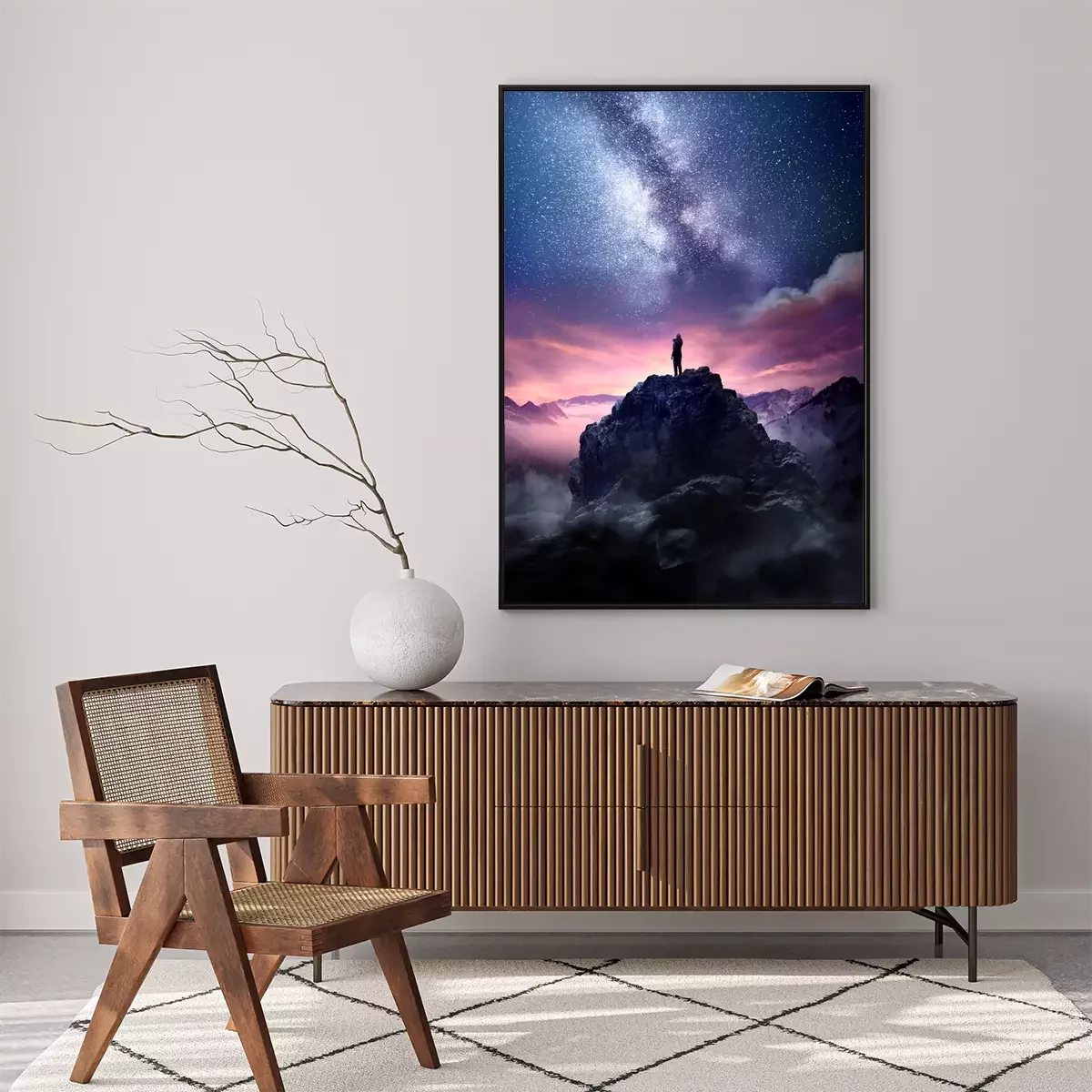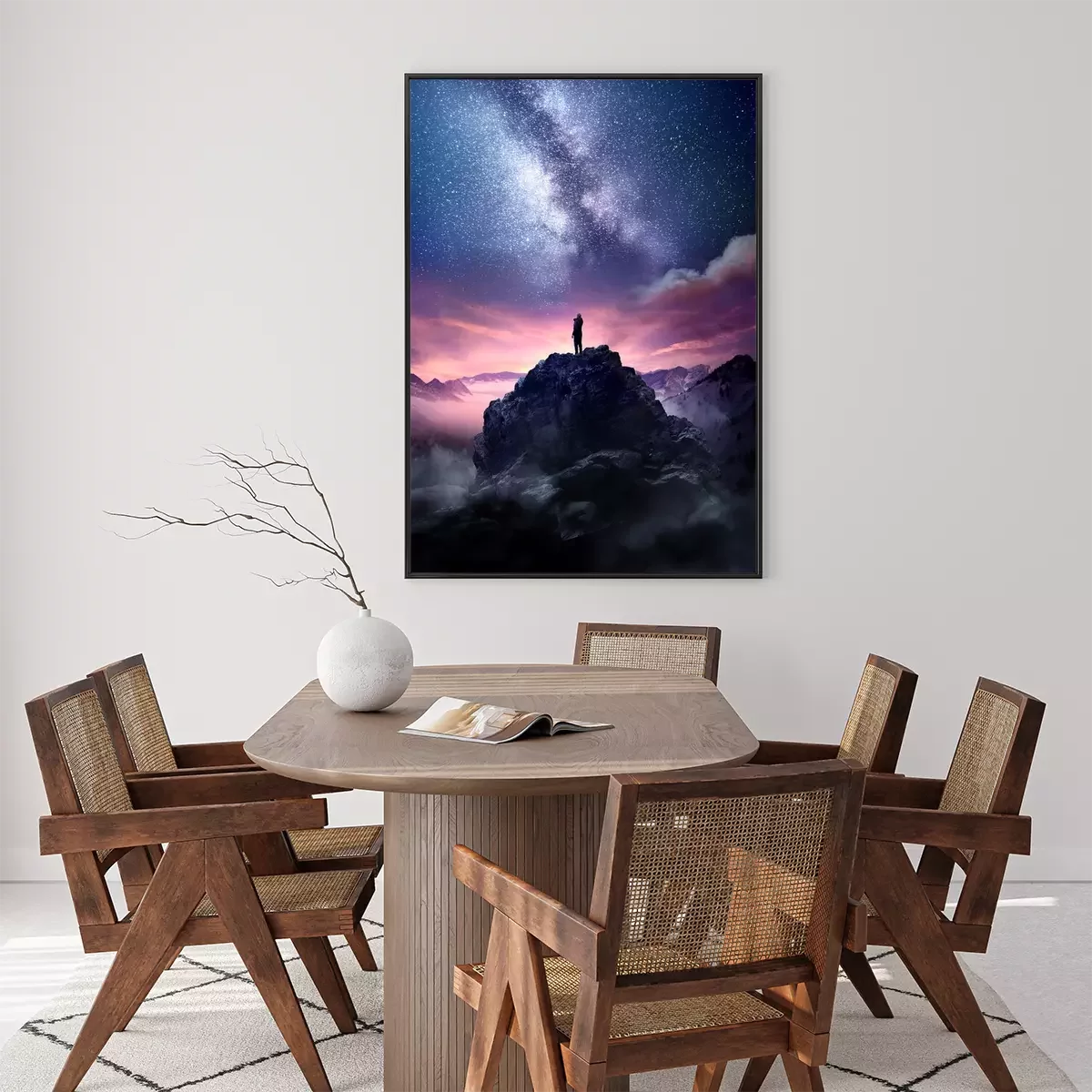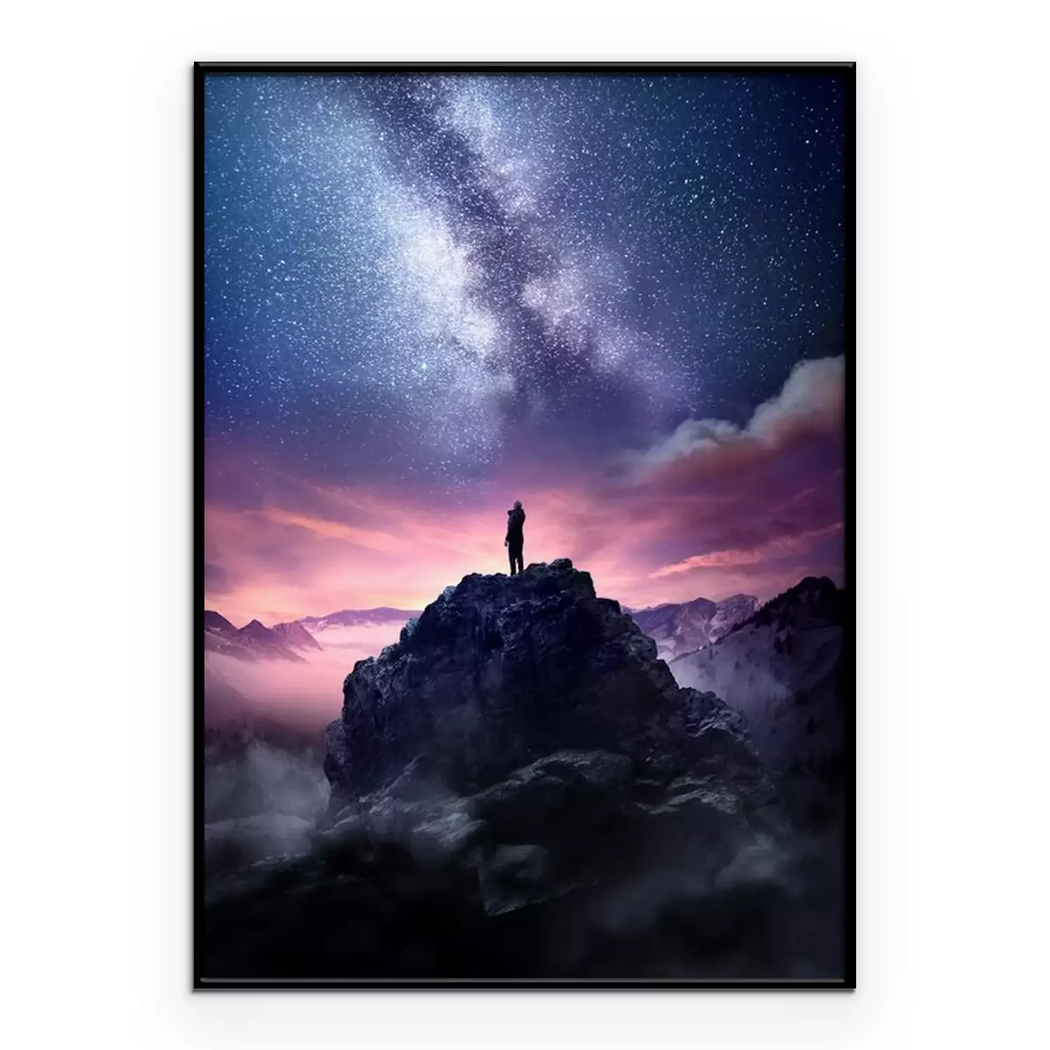 Poster: Night sky long exposure landscape. A man standing on a high rock watching the stars rise into the night sky. Photo composite.