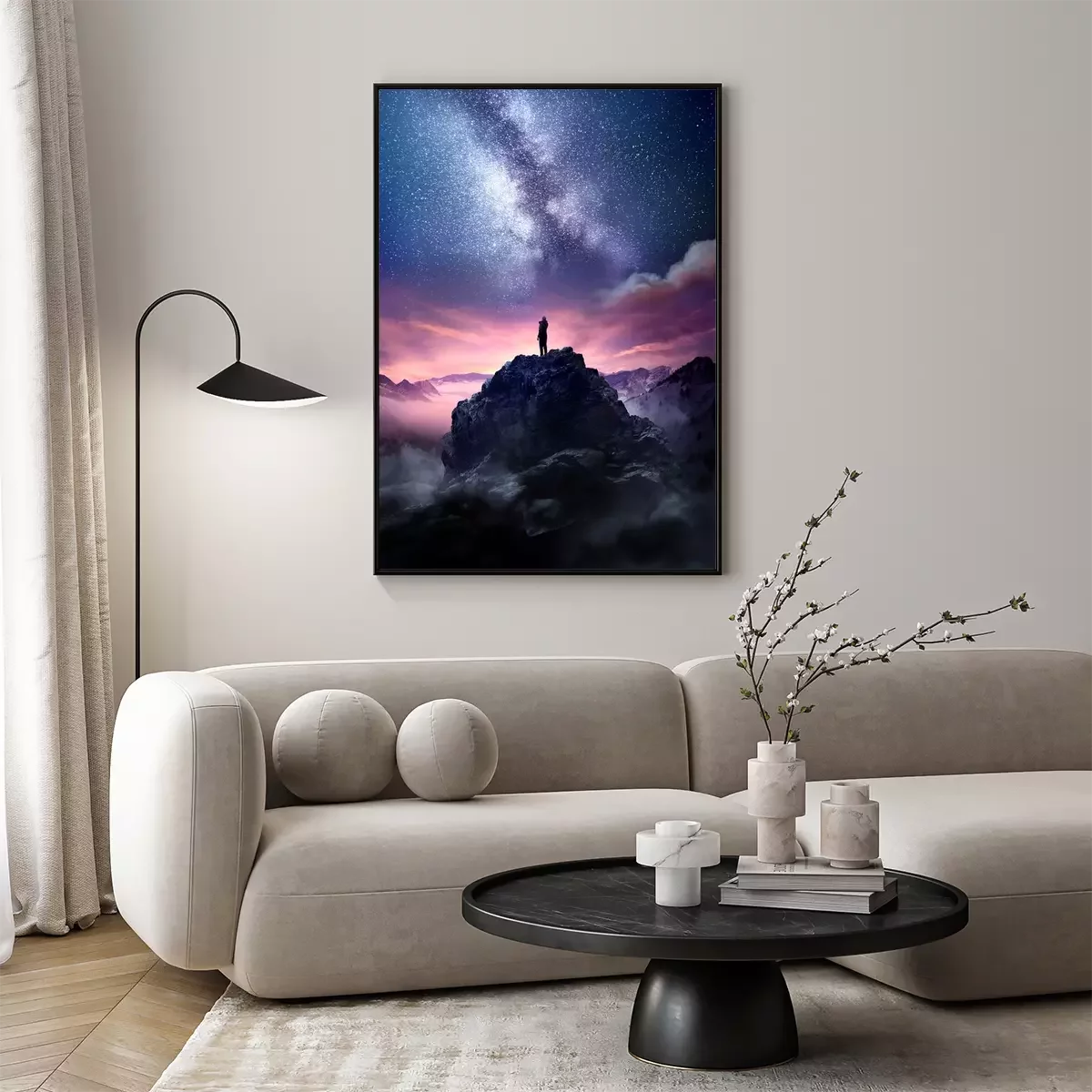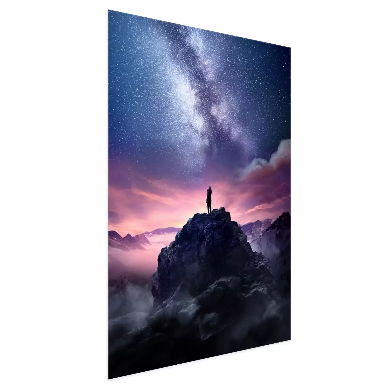 Poster Night sky long exposure landscape. A man standing on a high rock watching the stars rise into the night sky. Photo composite.