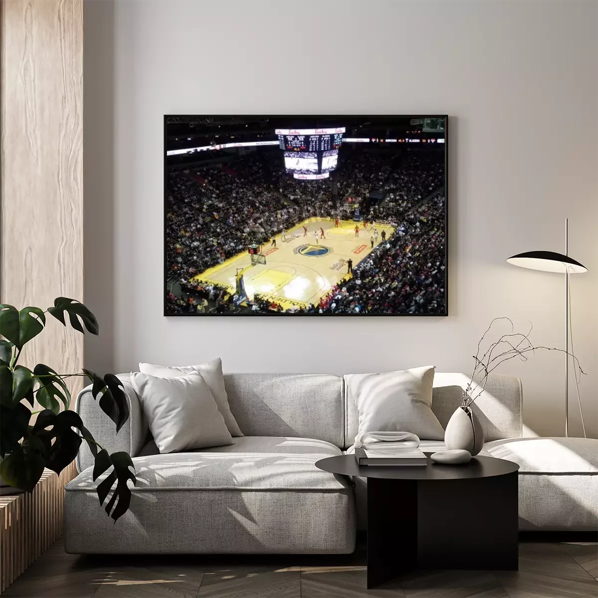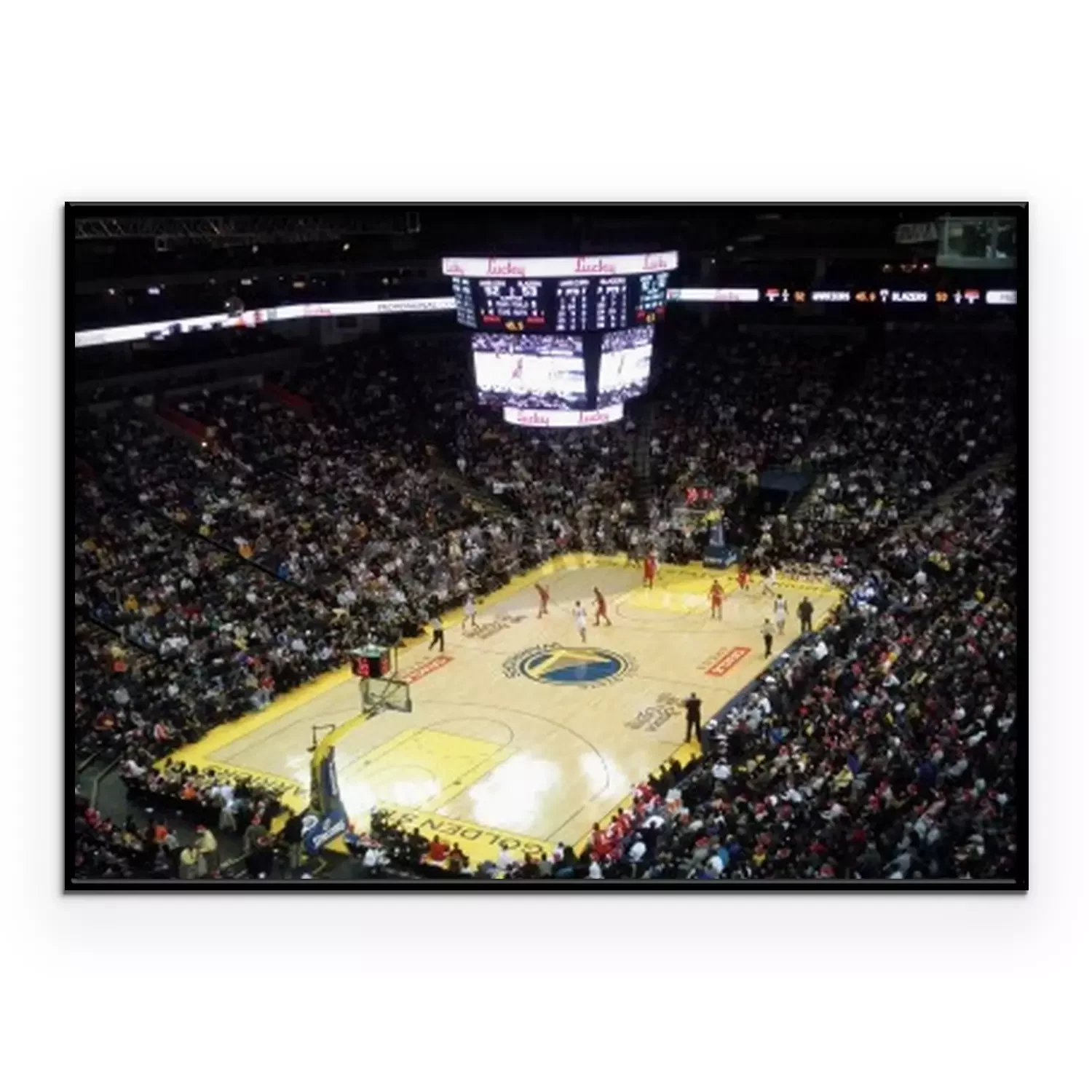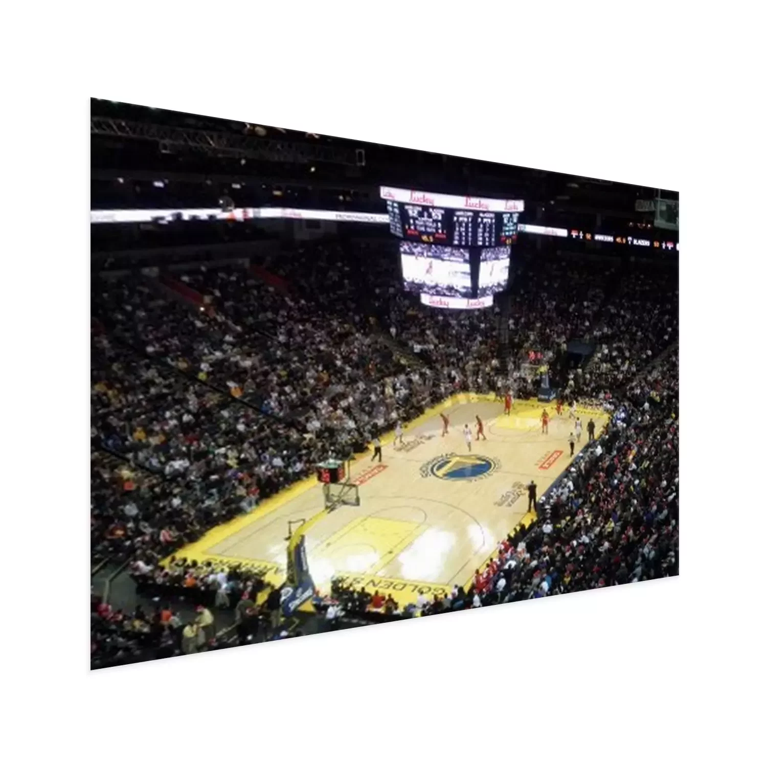 Poster: OAKLAND, CA - 25 december: Portland Blazers vs. Golden State Warriors: Warriors Monta Ellis neemt bal onderaan het hof als spelers bewegen in de juiste positie in de Oracle Arena genomen, 25 December
