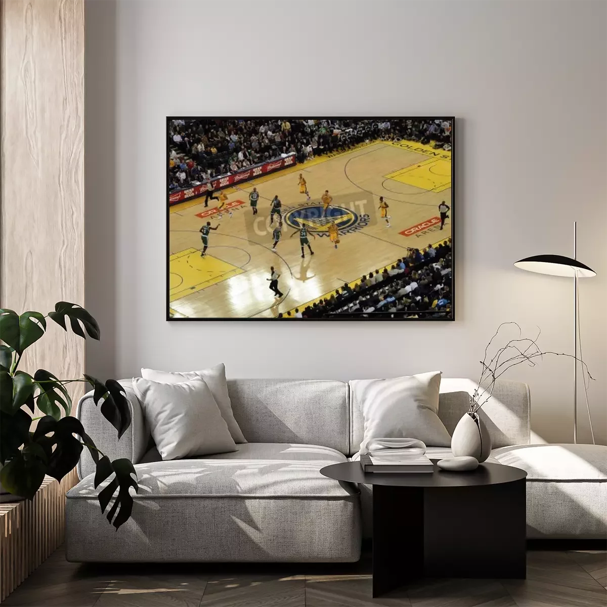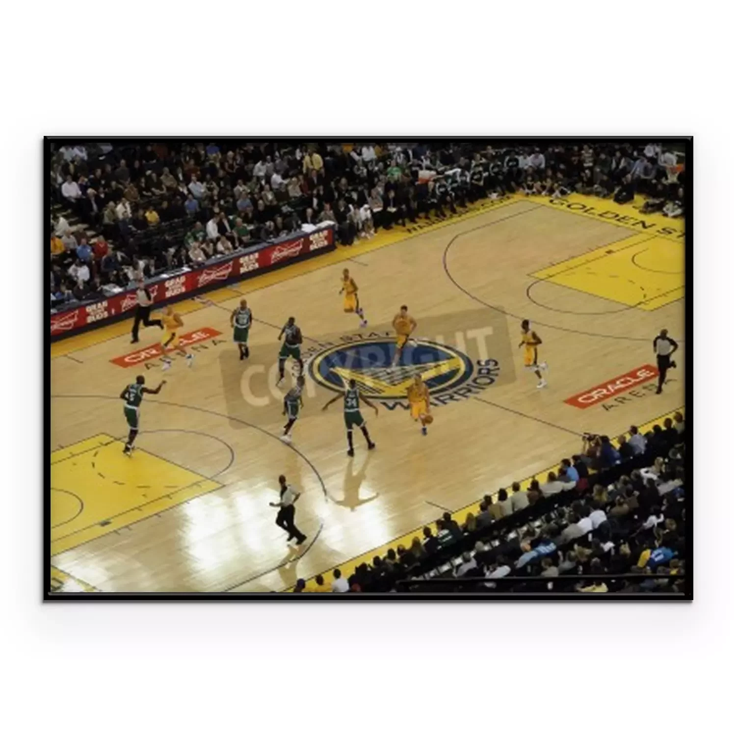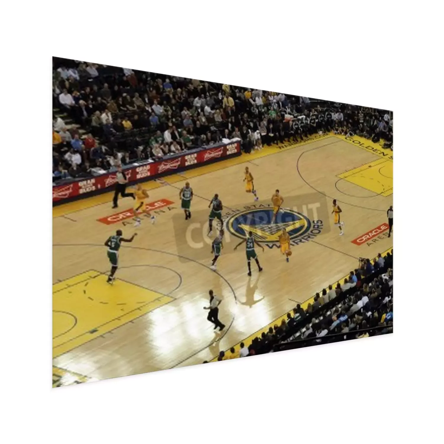 Poster OAKLAND, CA - FEBRUARI 22: Celtics versus Warriors: Warriors Stephen Curry beweegt bal van Hof in Oracle Arena genomen, 22 februari 2011 Oakland Californië.