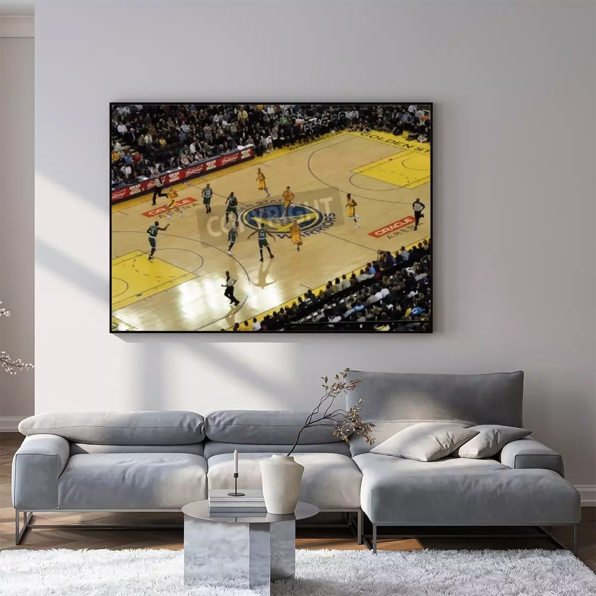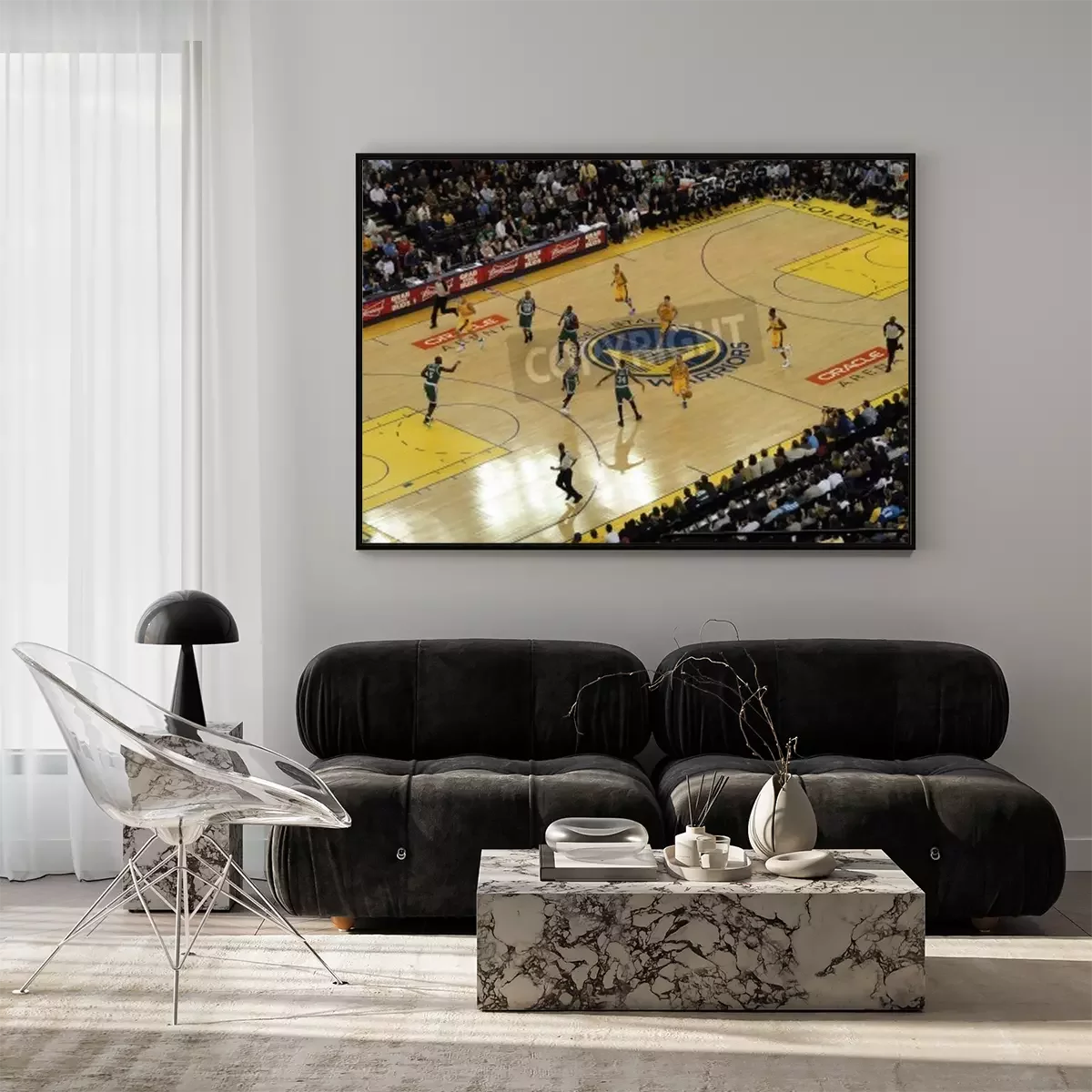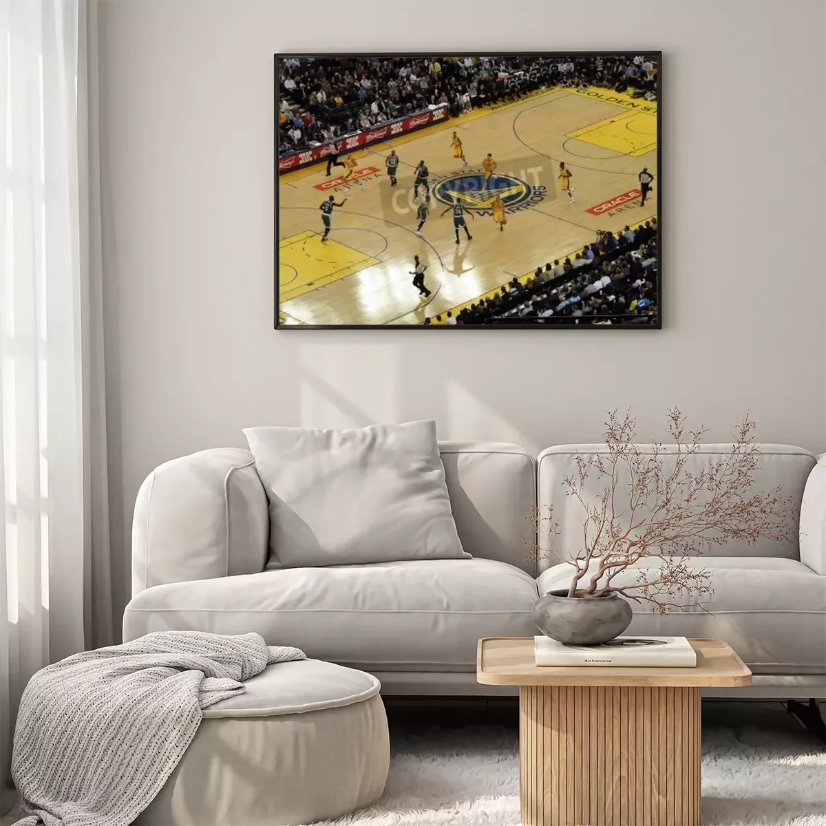 Poster OAKLAND, CA - FEBRUARI 22: Celtics versus Warriors: Warriors Stephen Curry beweegt bal van Hof in Oracle Arena genomen, 22 februari 2011 Oakland Californië.