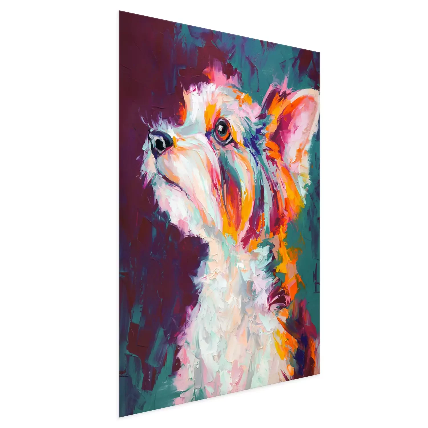 Poster Oil dog portrait painting in multicolored tones. Conceptual abstract painting of a biewer terrier muzzle. Closeup of a painting by oil and palette knife on canvas.
