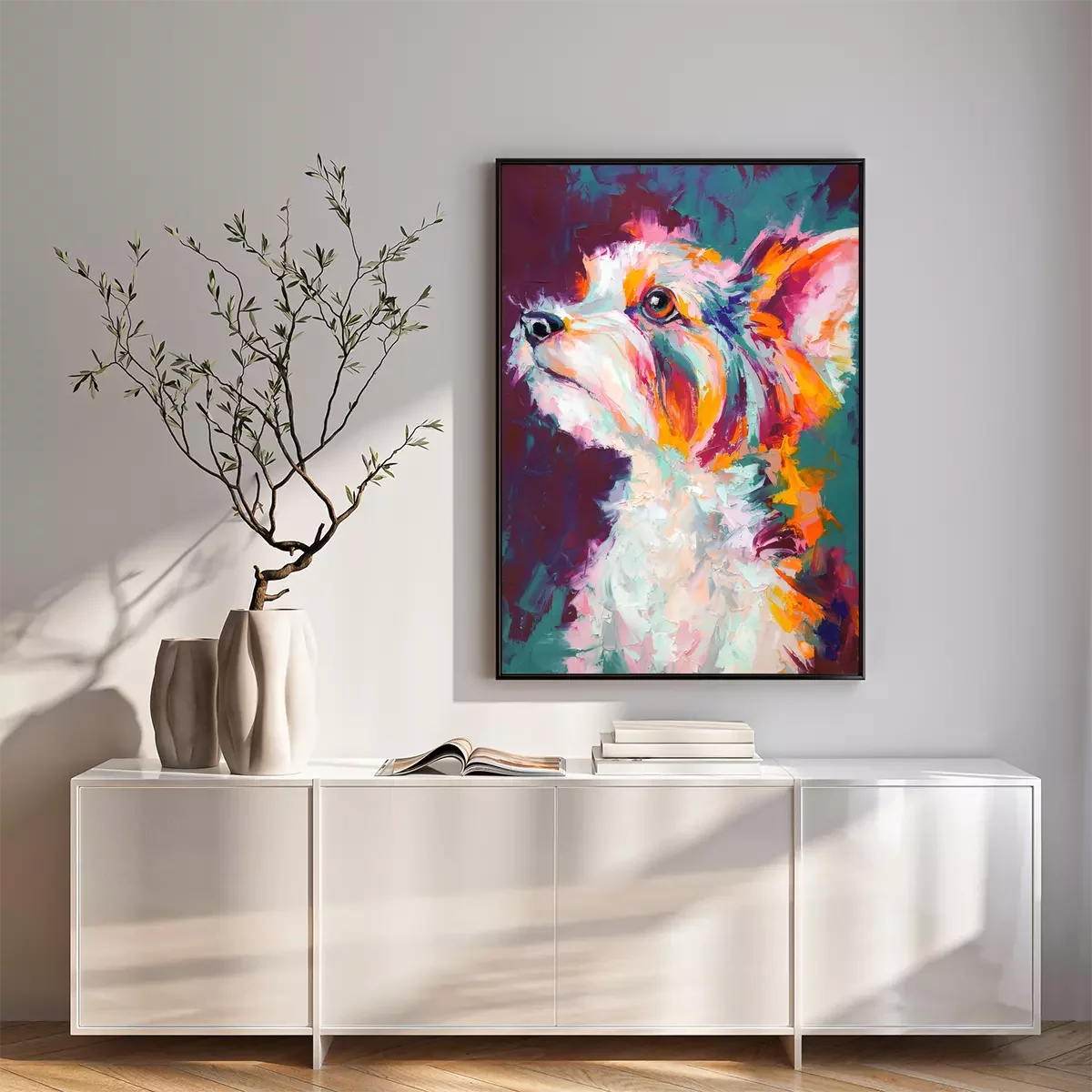 Poster: Oil dog portrait painting in multicolored tones. Conceptual abstract painting of a biewer terrier muzzle. Closeup of a painting by oil and palette knife on canvas.
