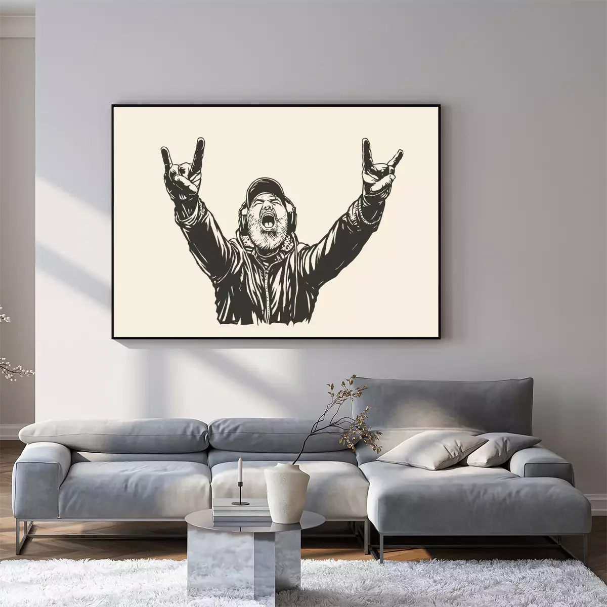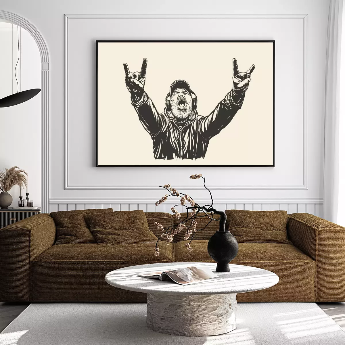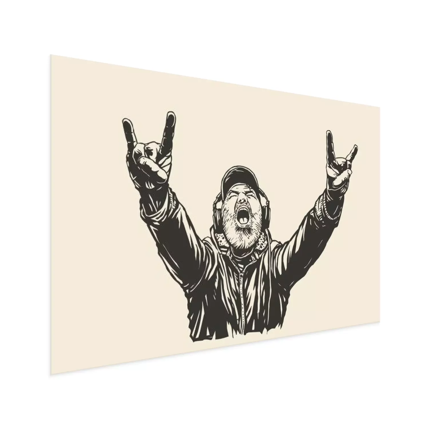 Poster Old bearded  Rocker Shows Sign Of The Horns Symbol.  An elderly man in headphones listens to rock and shows a characteristic heavy metal hand gesture. Vector Illustration.