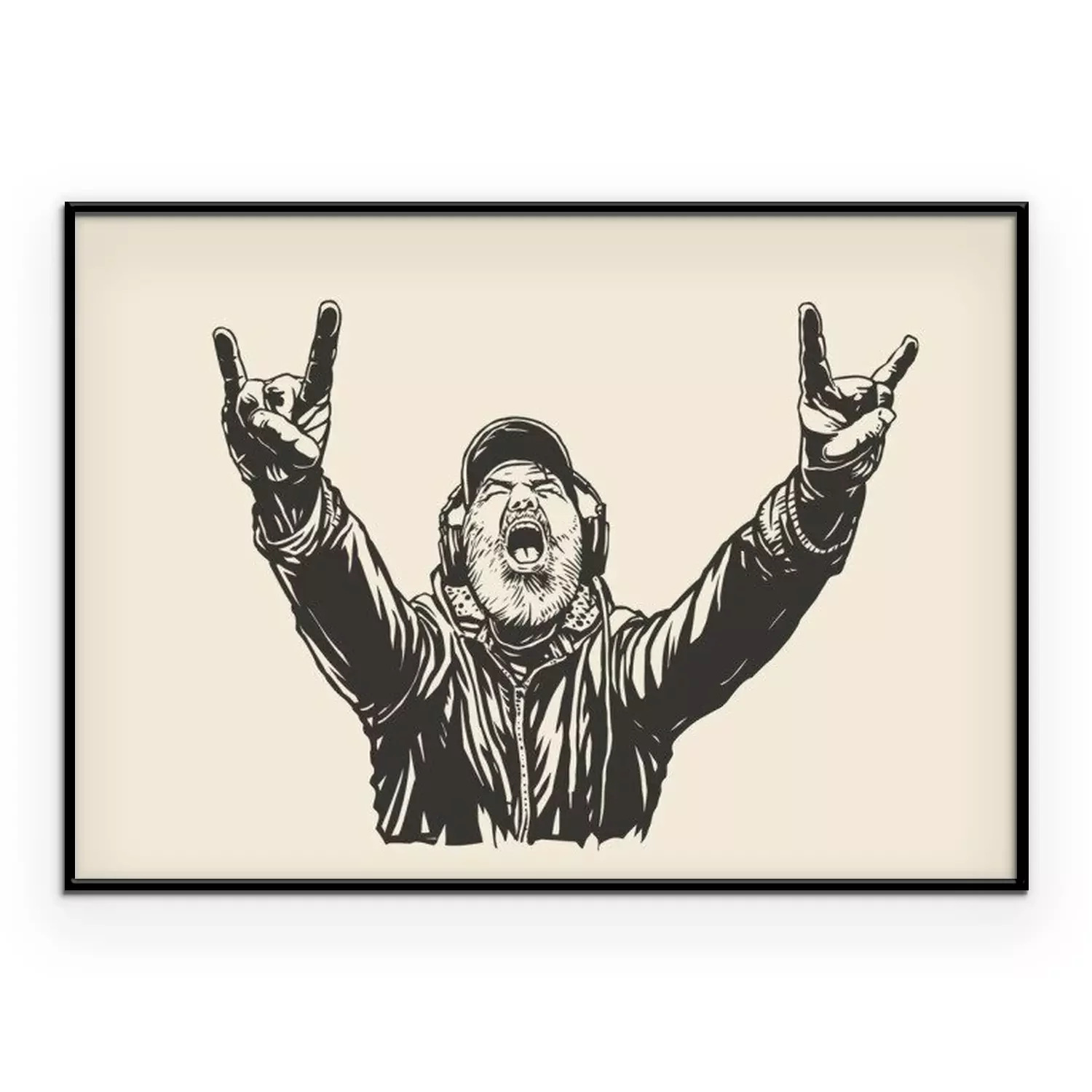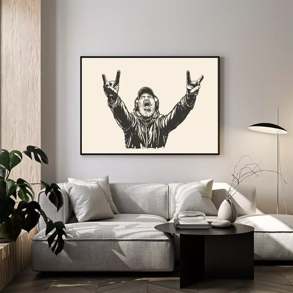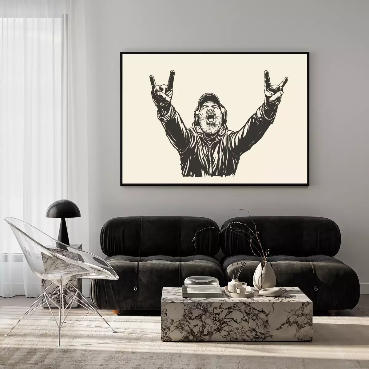 Poster Old bearded  Rocker Shows Sign Of The Horns Symbol.  An elderly man in headphones listens to rock and shows a characteristic heavy metal hand gesture. Vector Illustration.