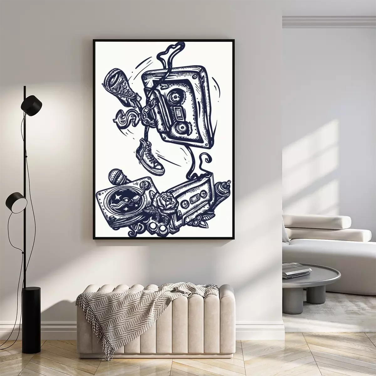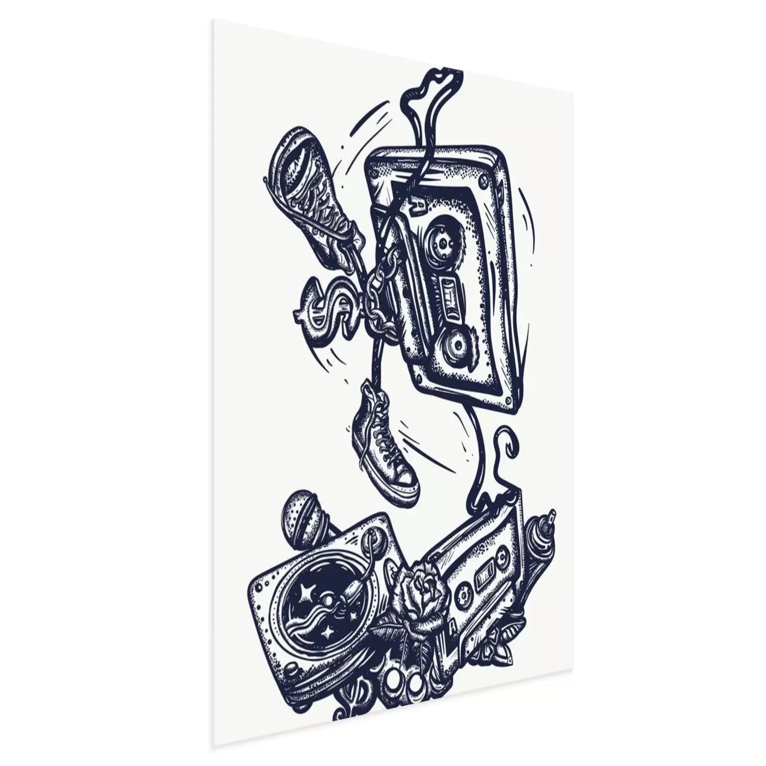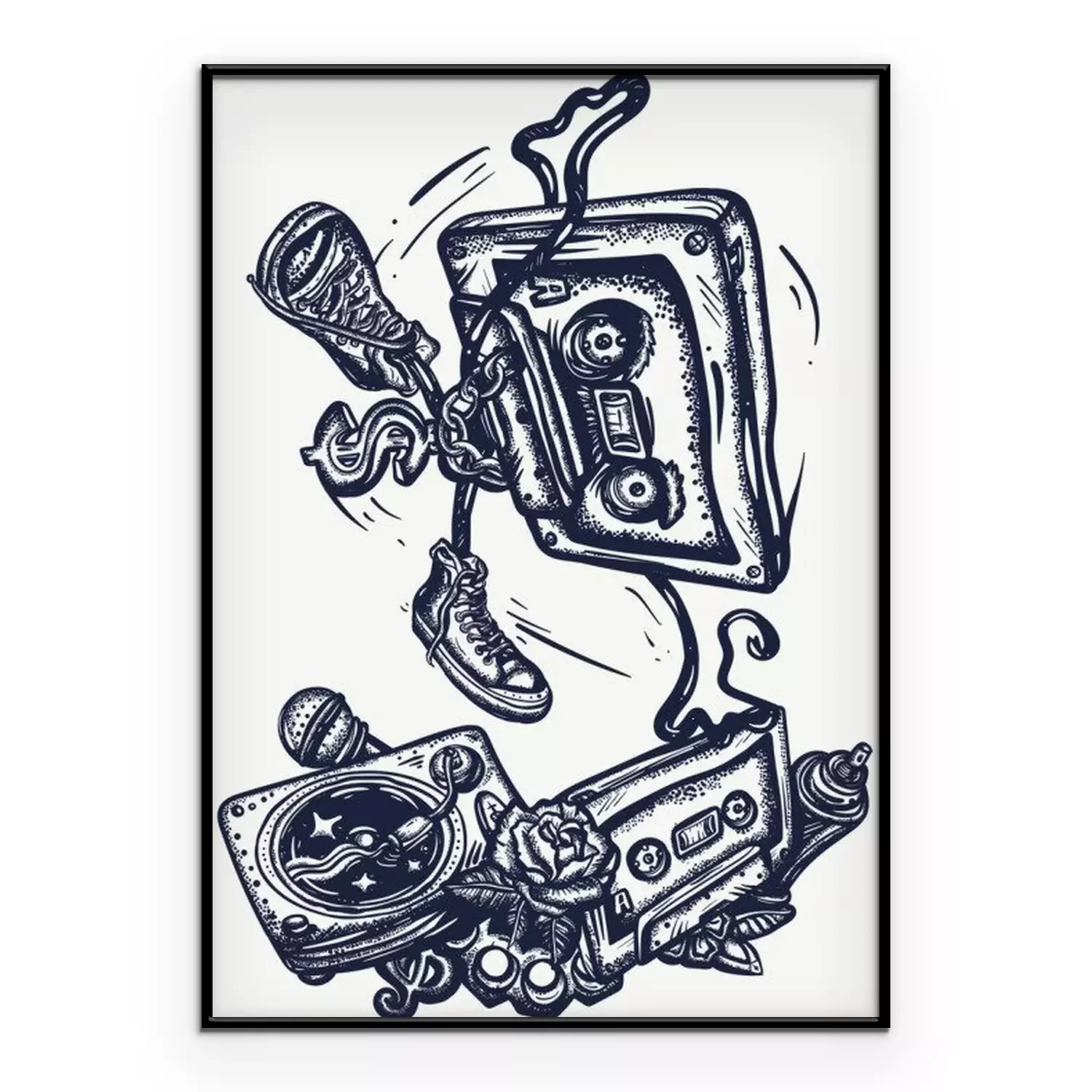 Poster Old school music. Audio cassette dances break dance. Funny art. Musical street culture. Cool hip hop break dancer. Tattoo and t-shirt design. Vinyl, microphone, rap battle