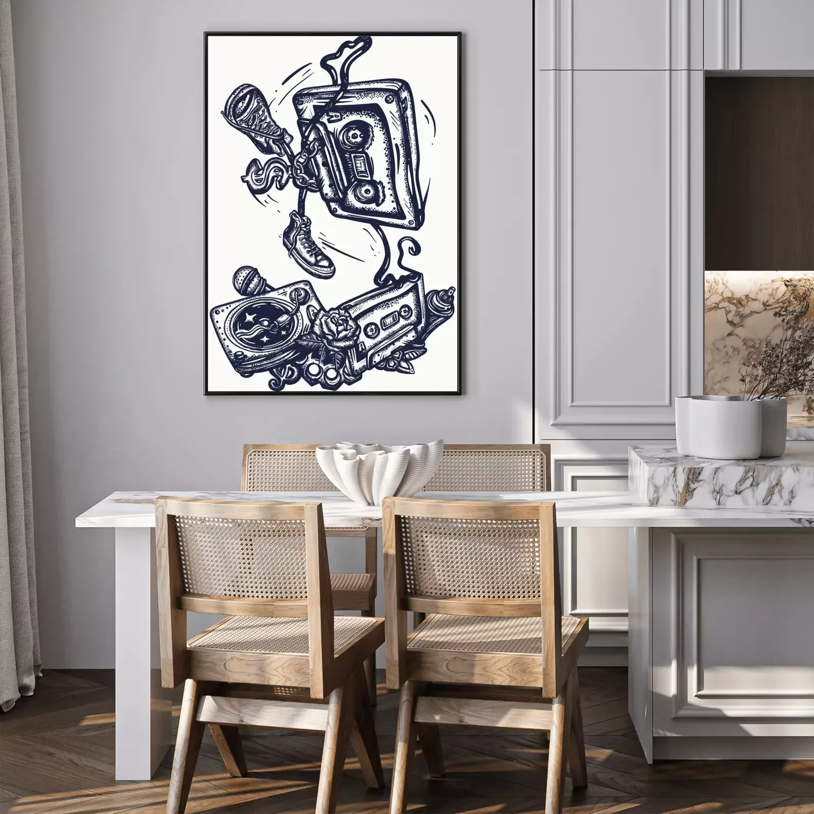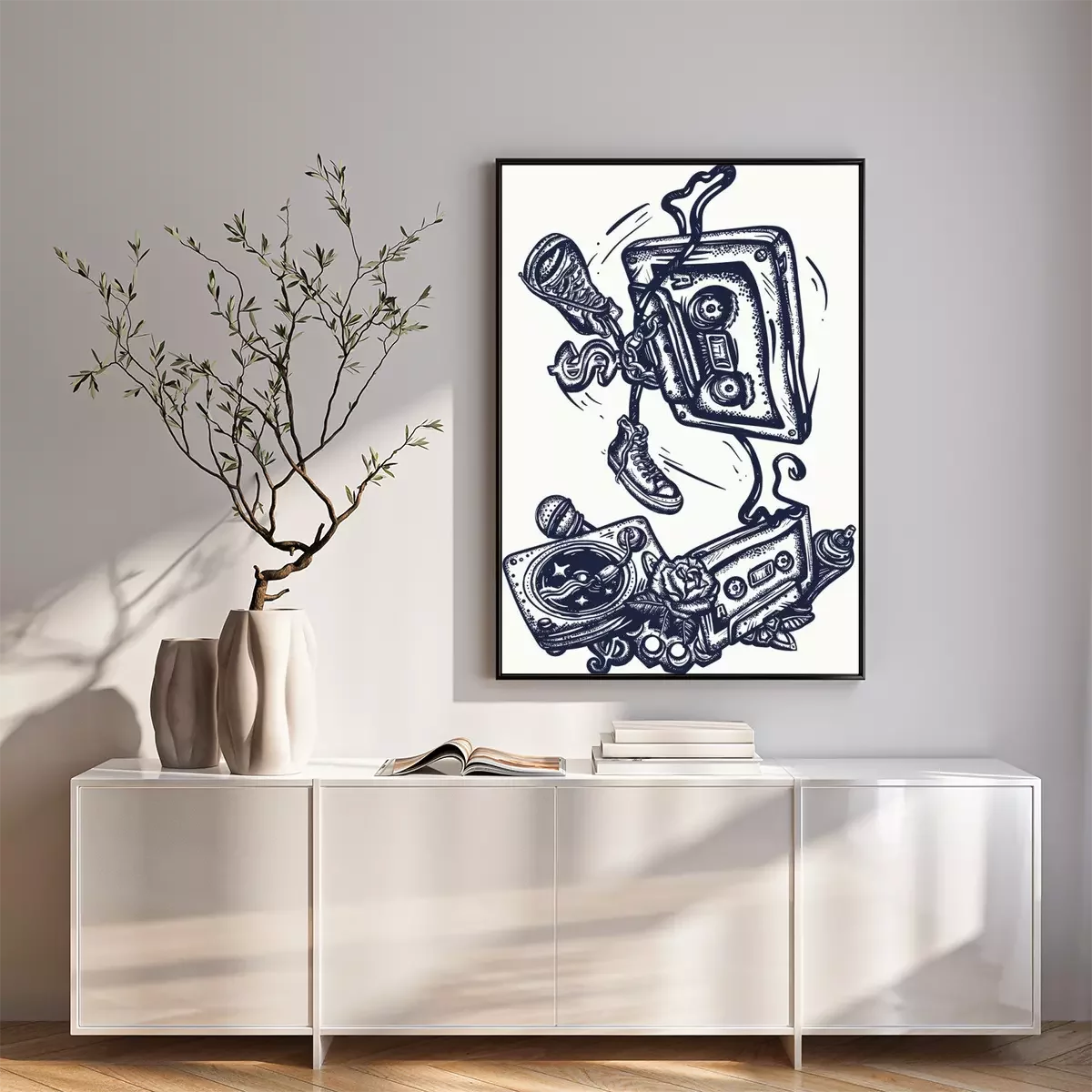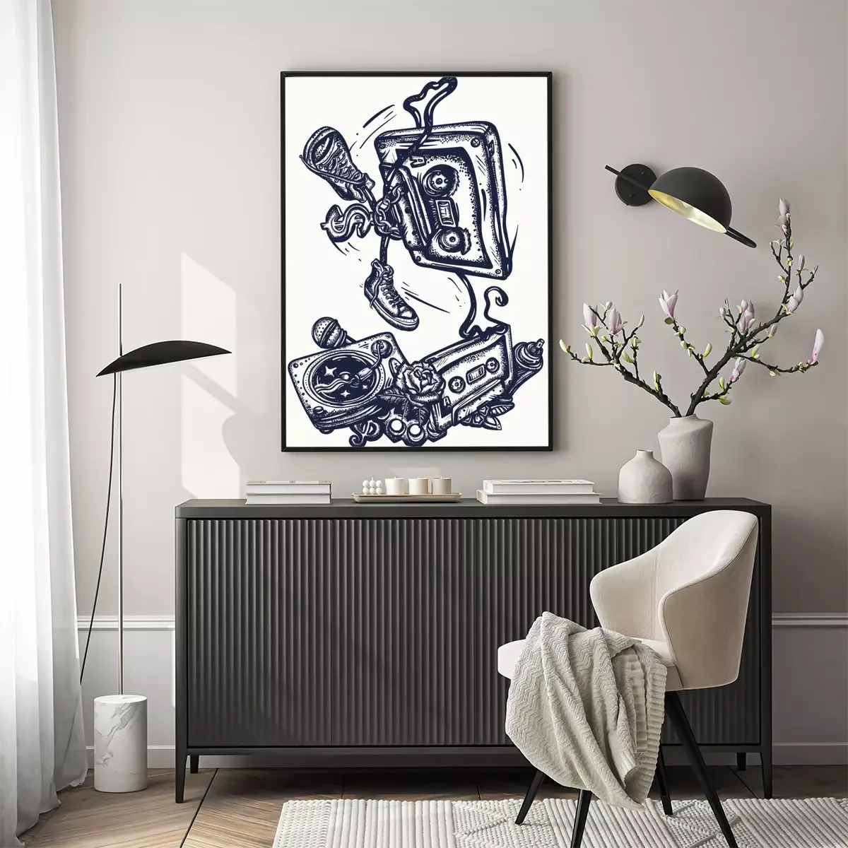 Poster: Old school music. Audio cassette dances break dance. Funny art. Musical street culture. Cool hip hop break dancer. Tattoo and t-shirt design. Vinyl, microphone, rap battle