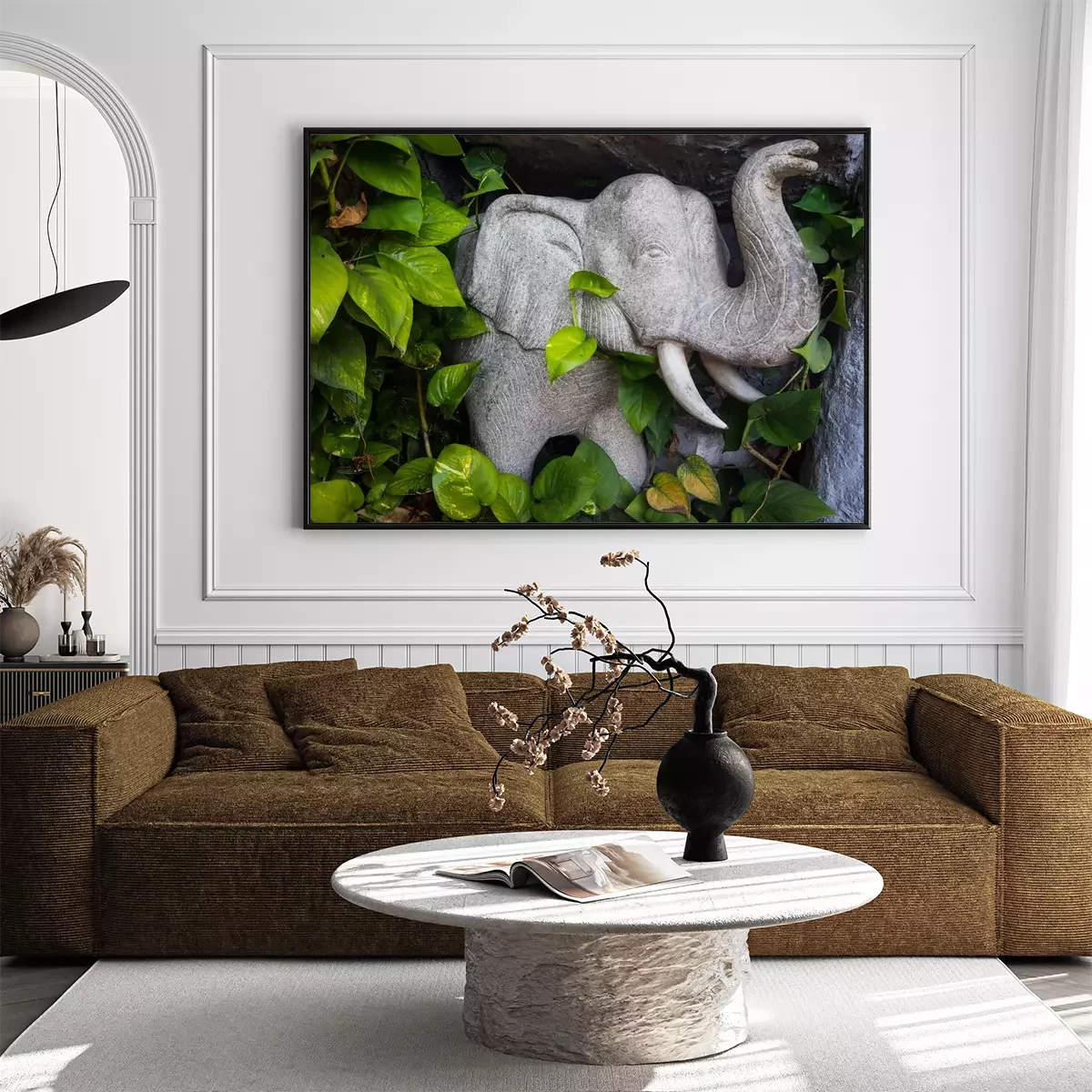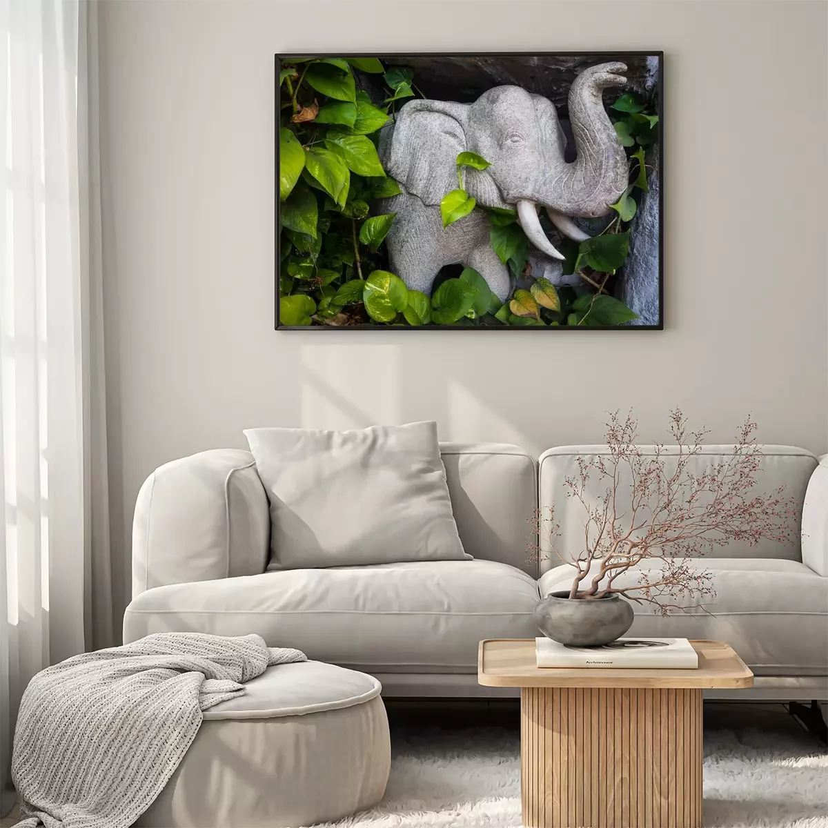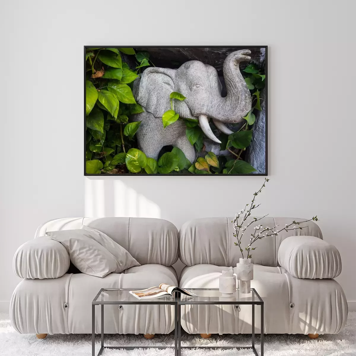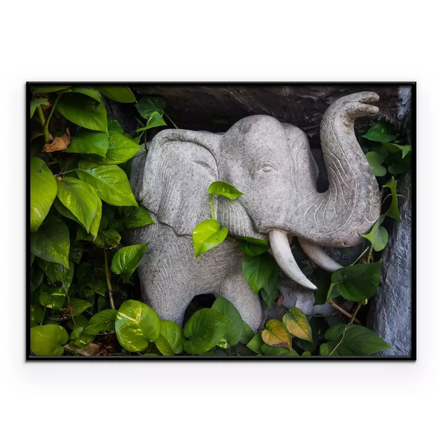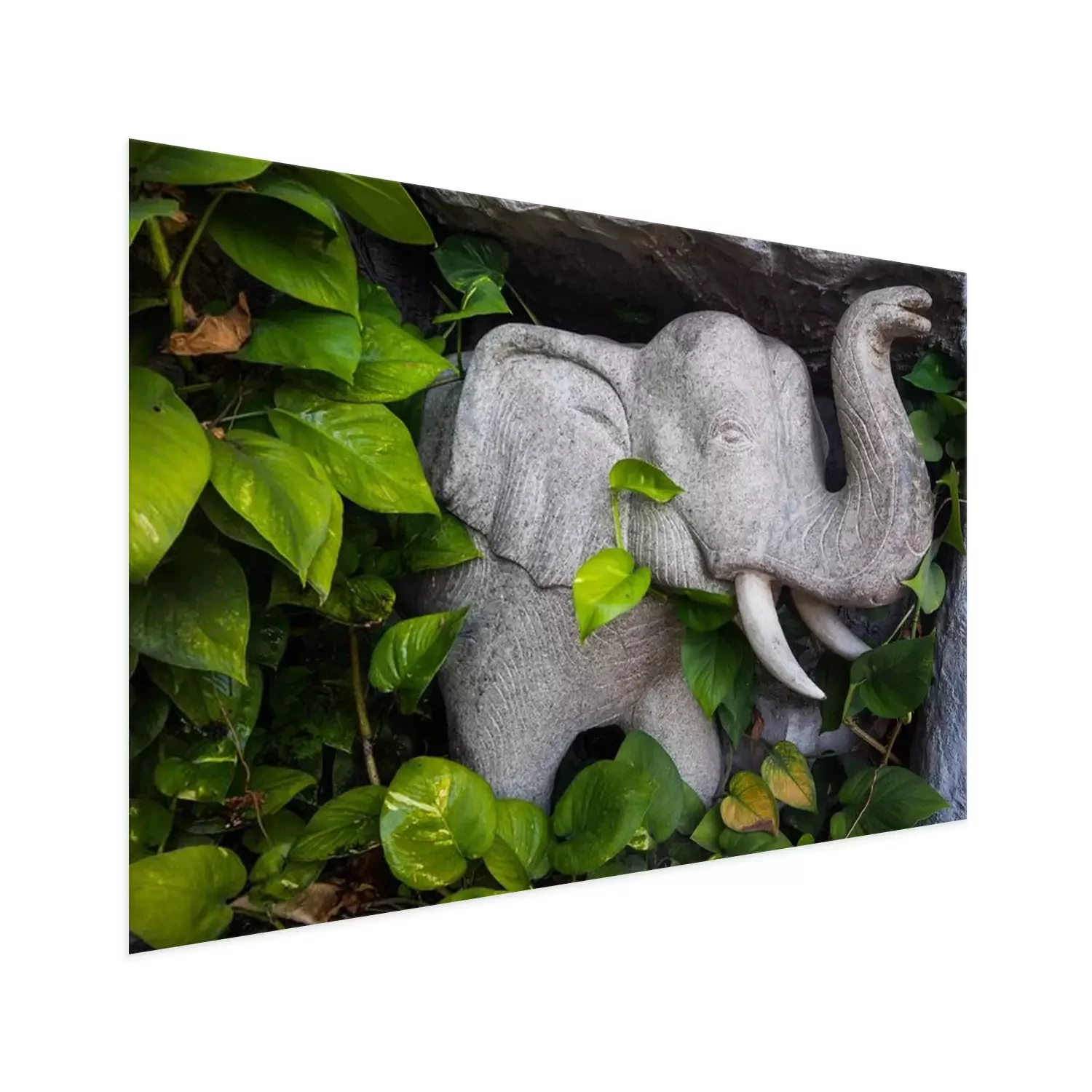Poster: Olifant gemaakt van steen tussen de bladeren