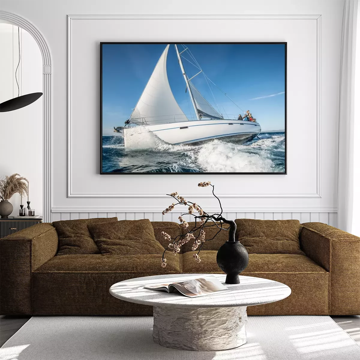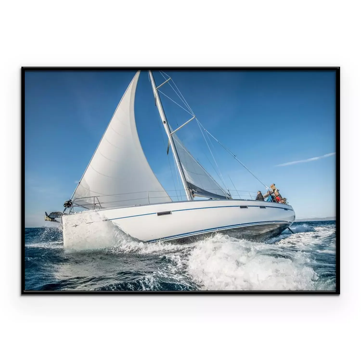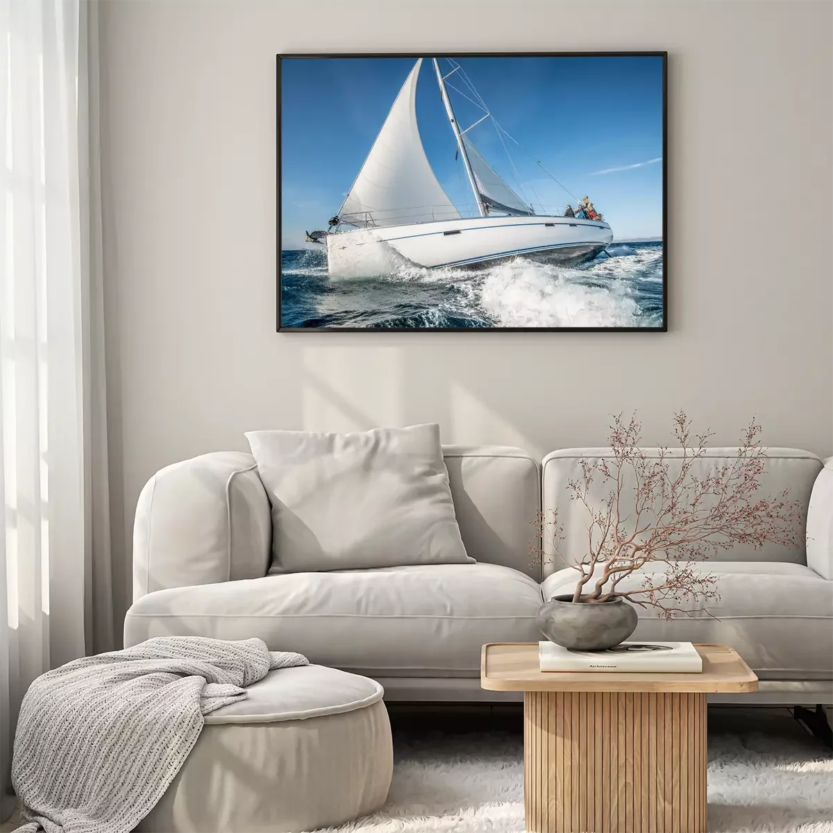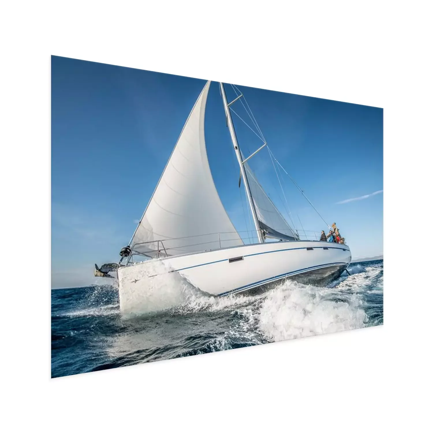 Poster One white sailing yacht floats on the sea with waves and spray. The view from the side