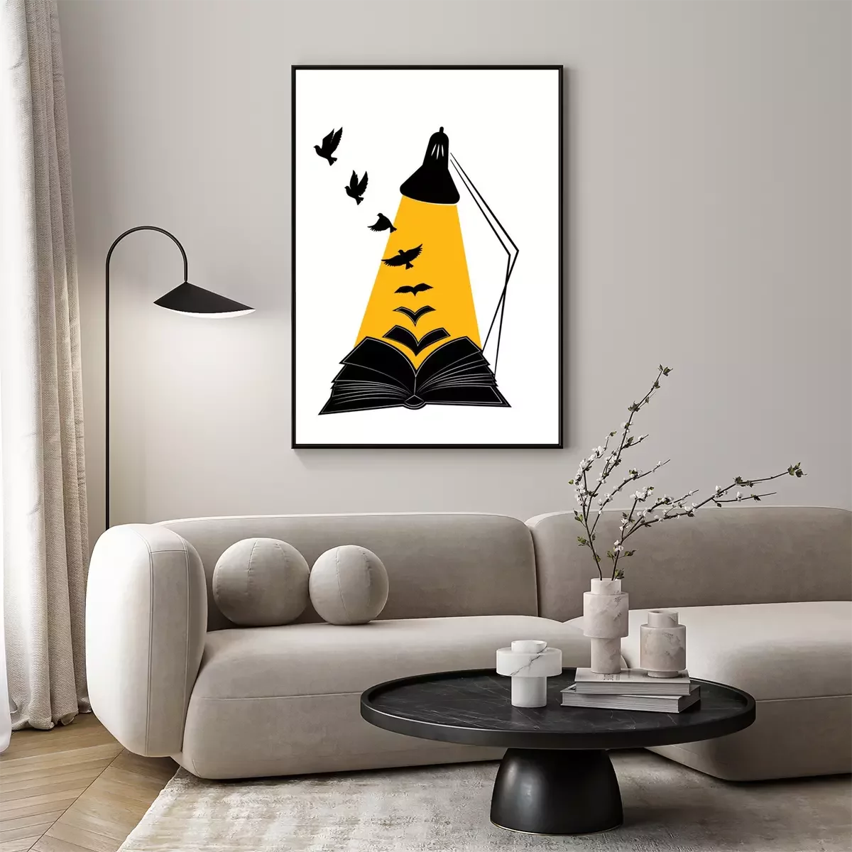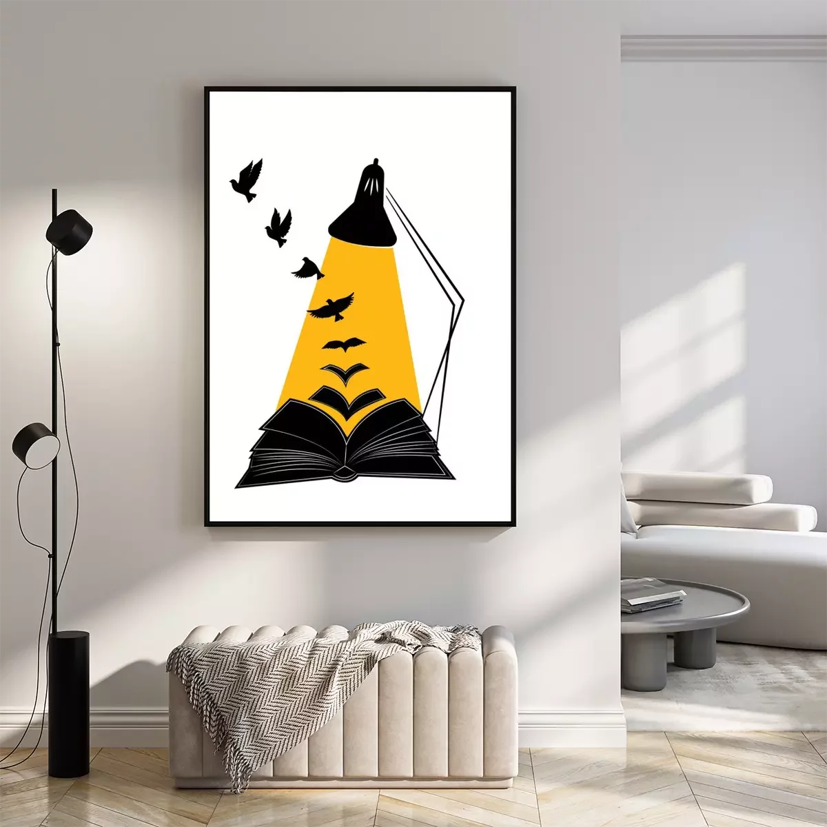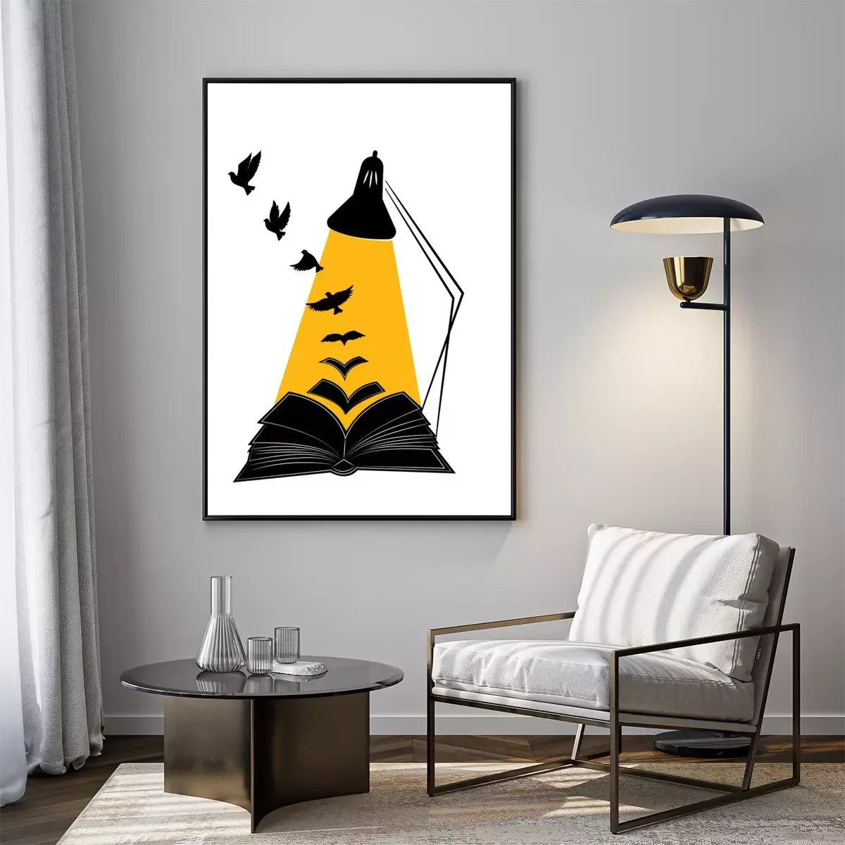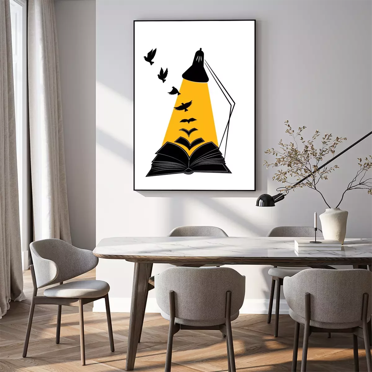 Poster: Open book illustration with flying birds silhouettes, vector. Synonym Education gives you wings. Poster design isolated on white background, graphic design, wall decals, wall artwork