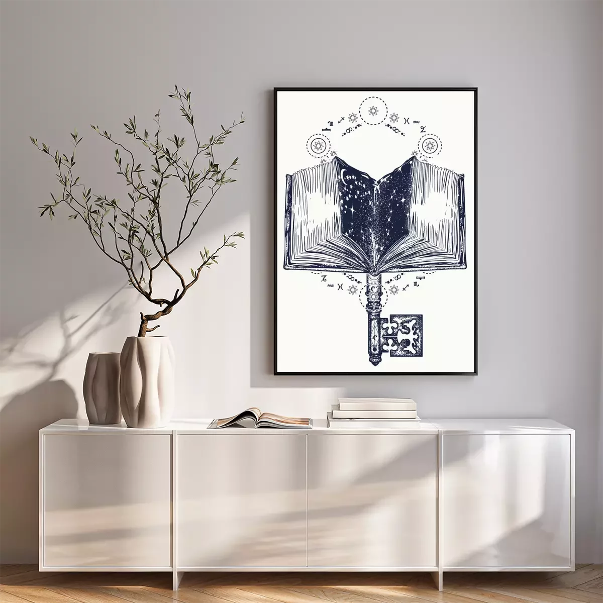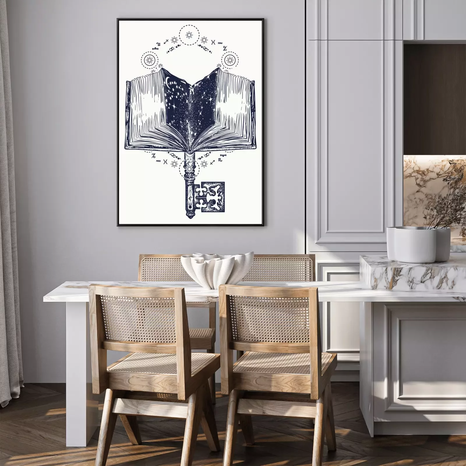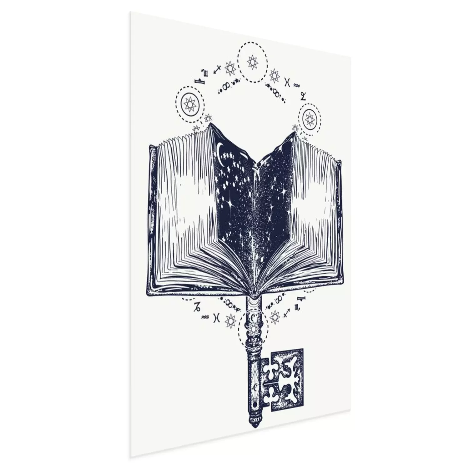 Poster Open een magisch boek en een vintage sleutelontwerp met tatoeages en t-shirts. Boeken en sleutel tot kennis. Symbool van wijsheid, leven en dood, onderwijs, literatuur, poëzie, lezen. Open boekkunst t