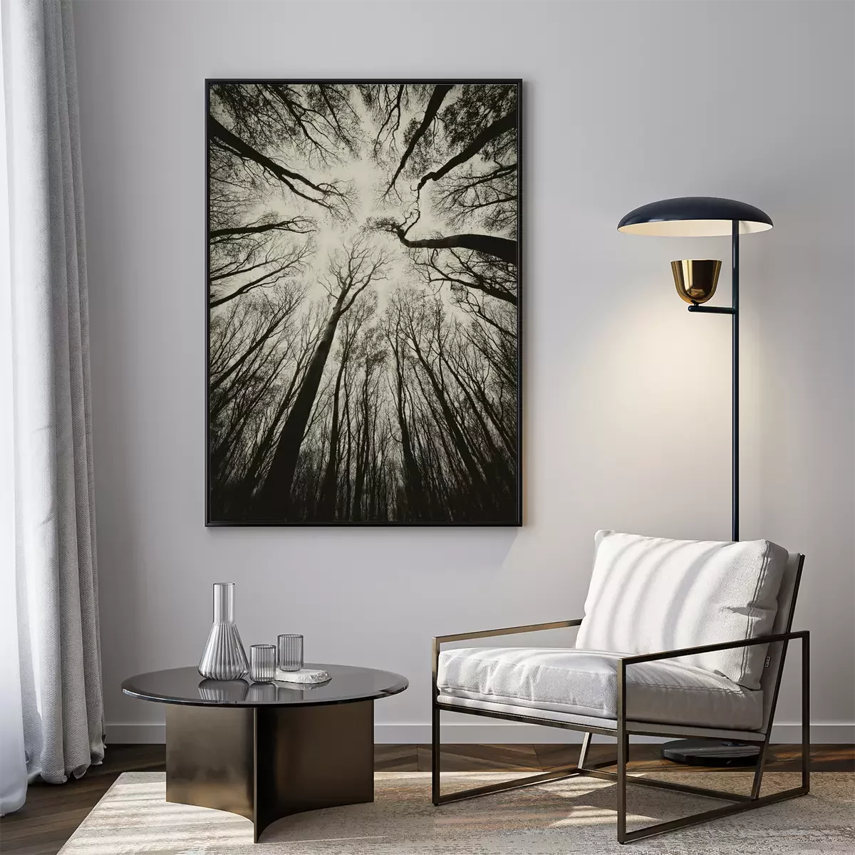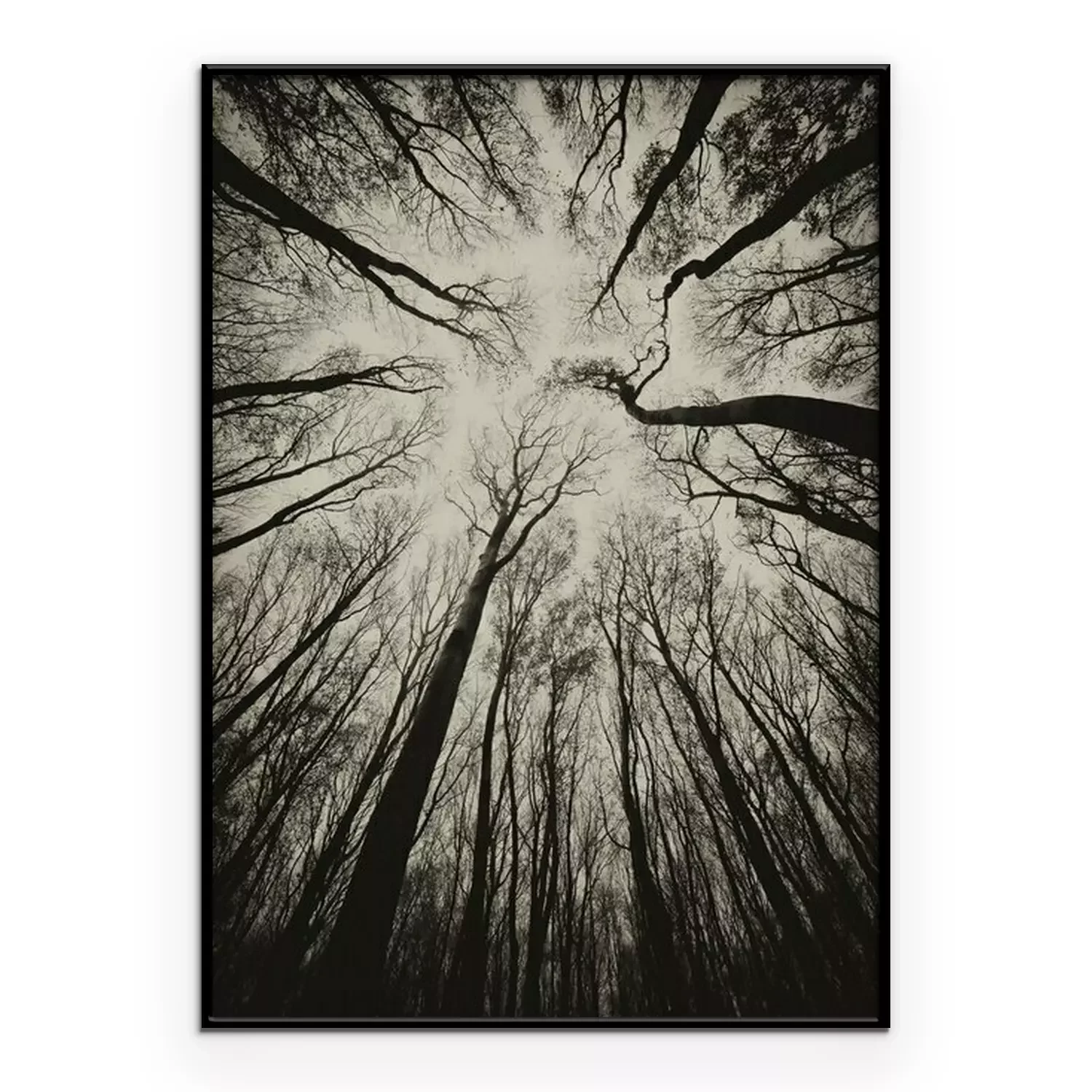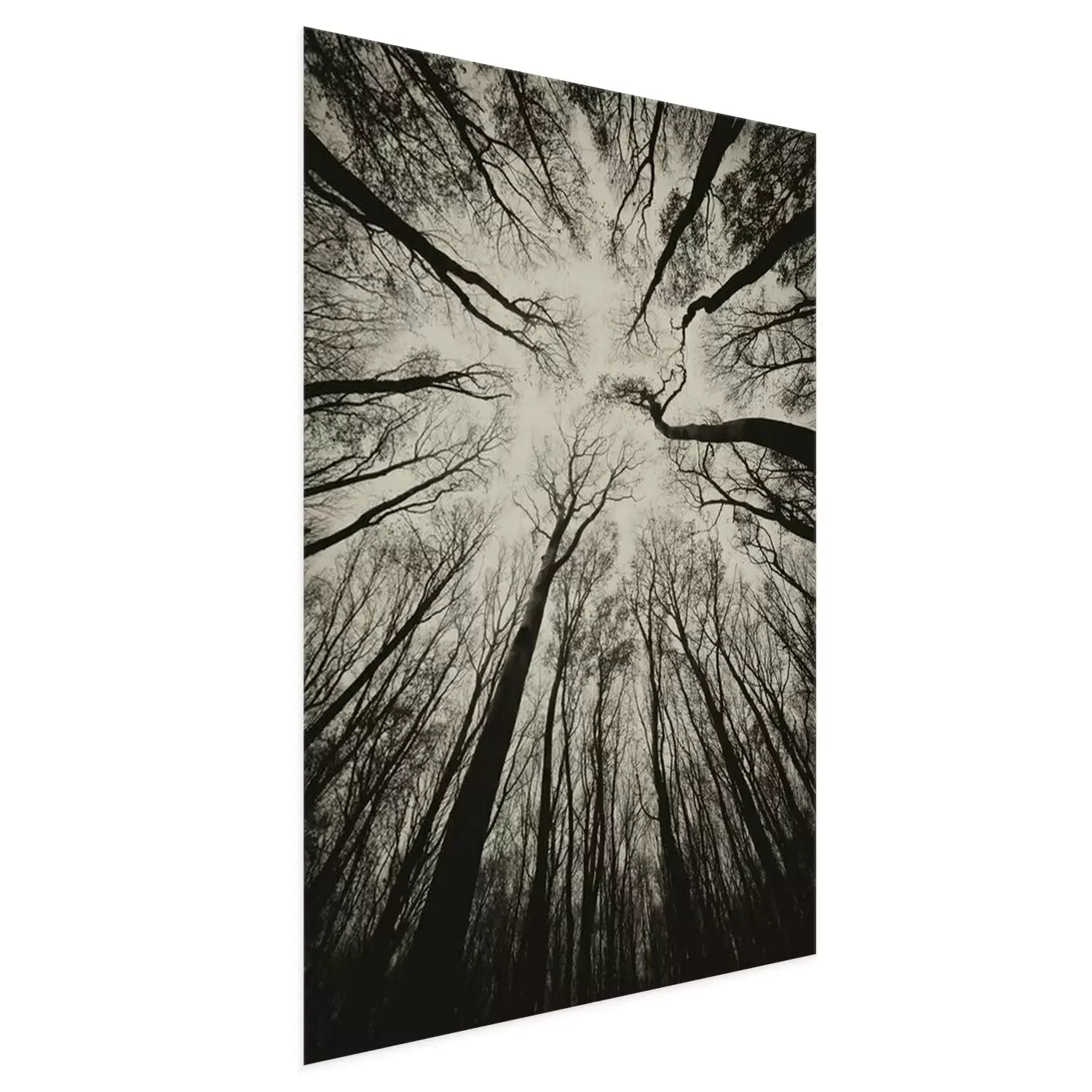 Poster: opwaartse weergave in een donkere spookachtige bos sepia