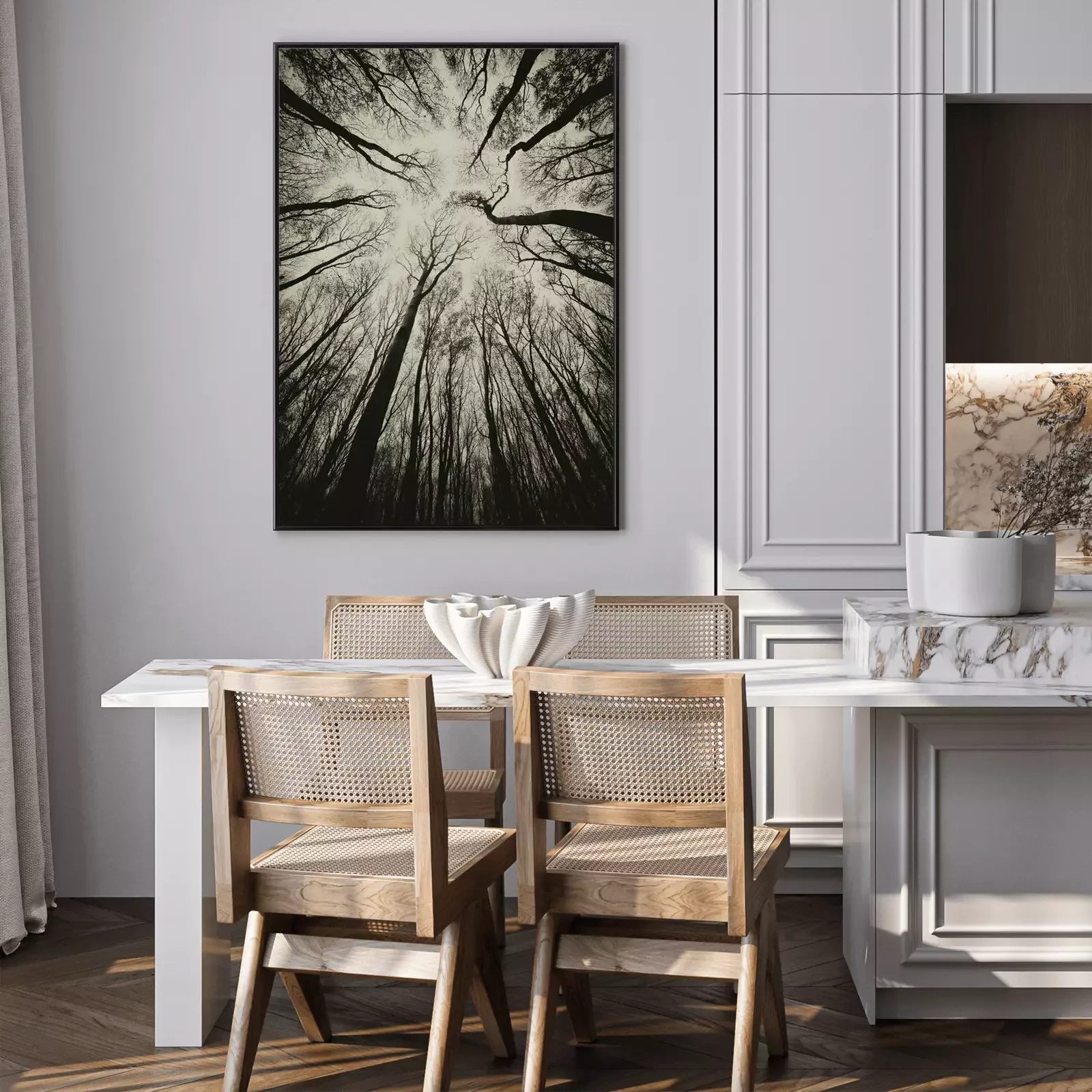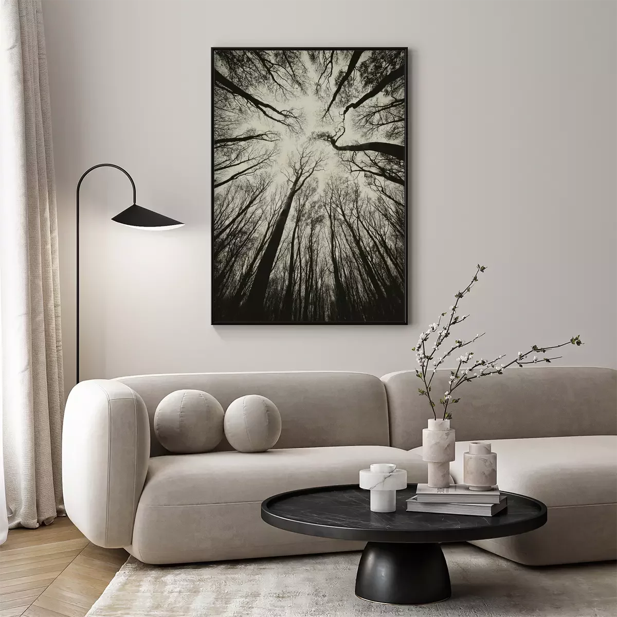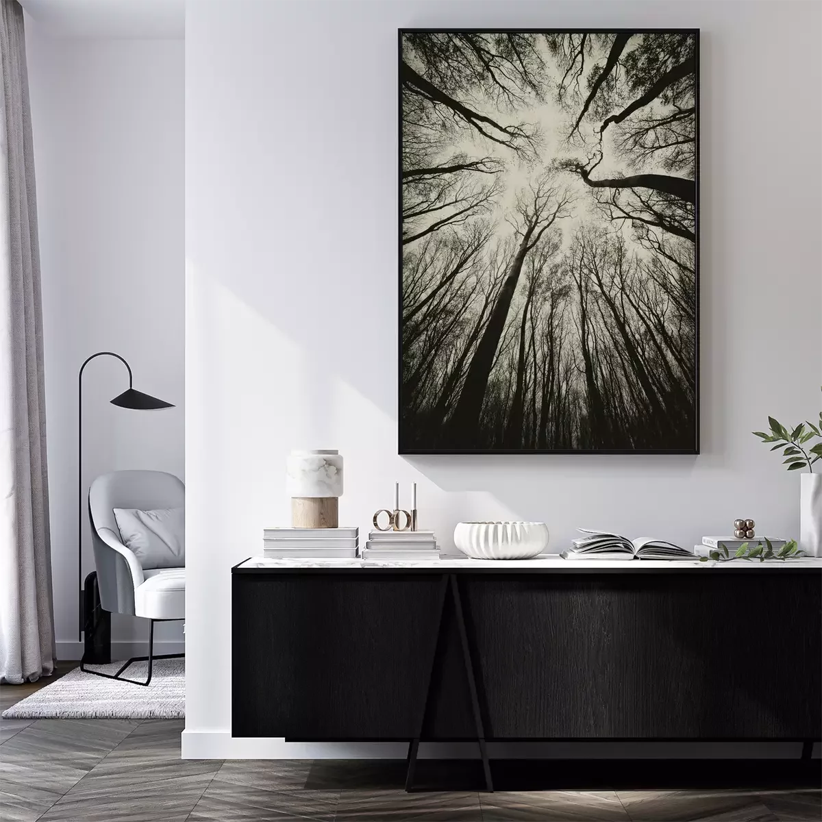 Poster: opwaartse weergave in een donkere spookachtige bos sepia