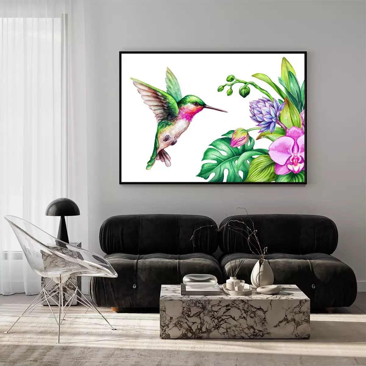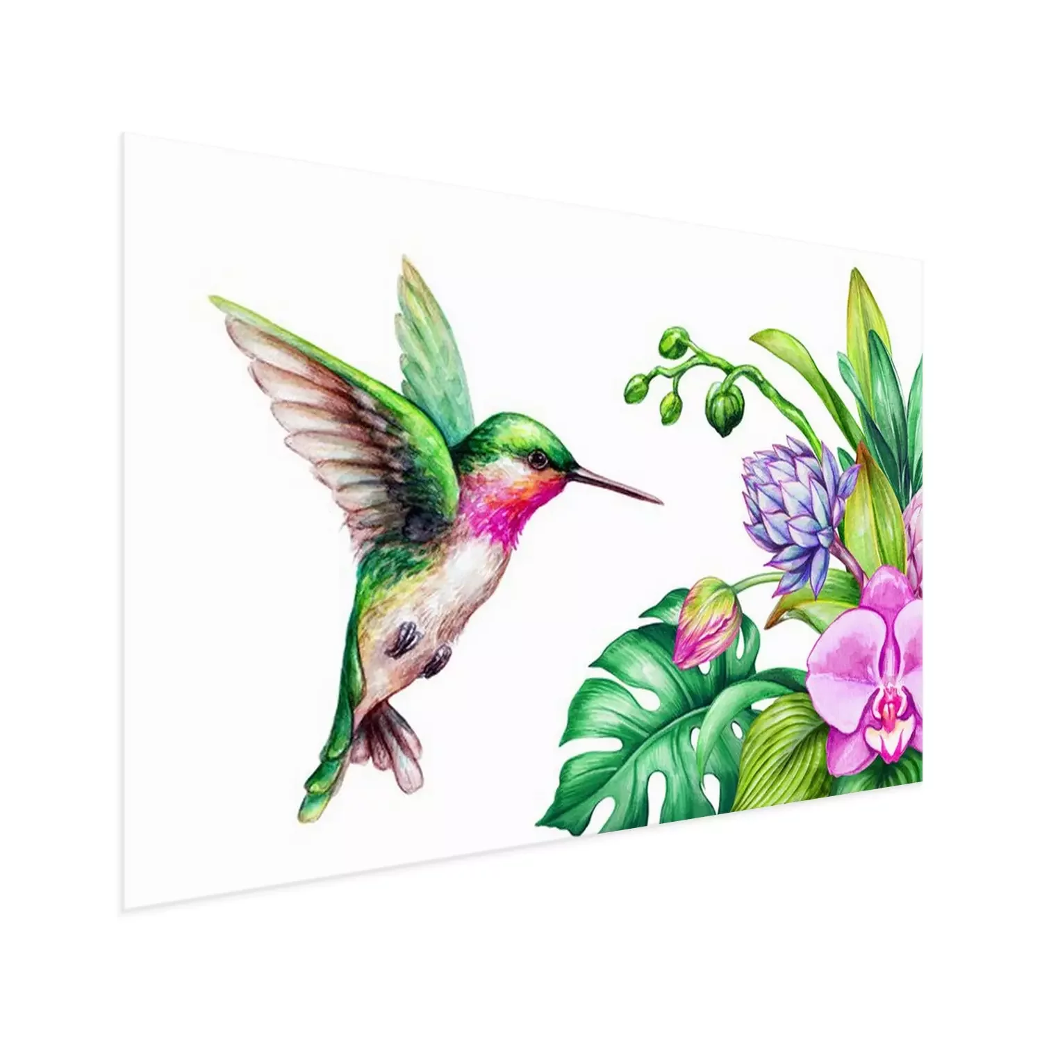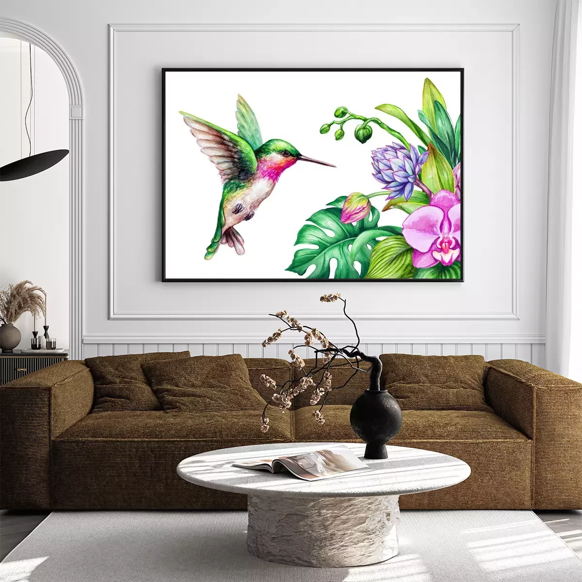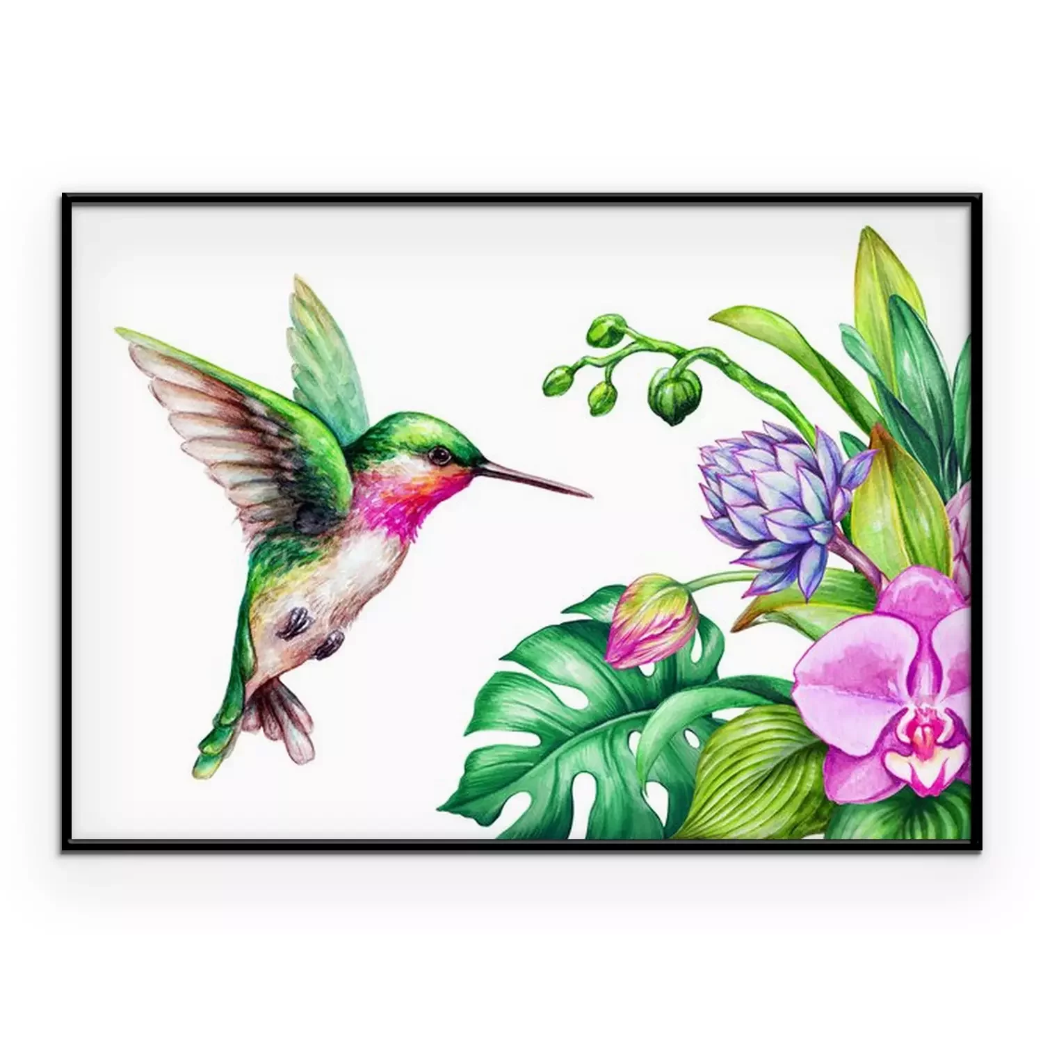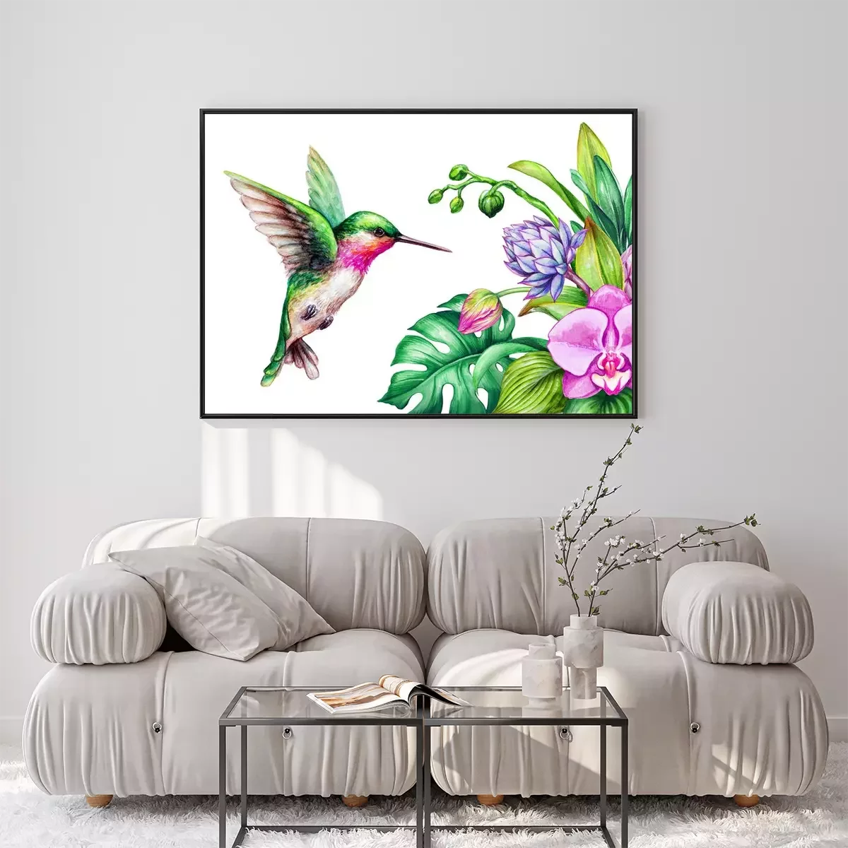 Poster: Orchidee in een boeket en een kleurrijke kolibrie