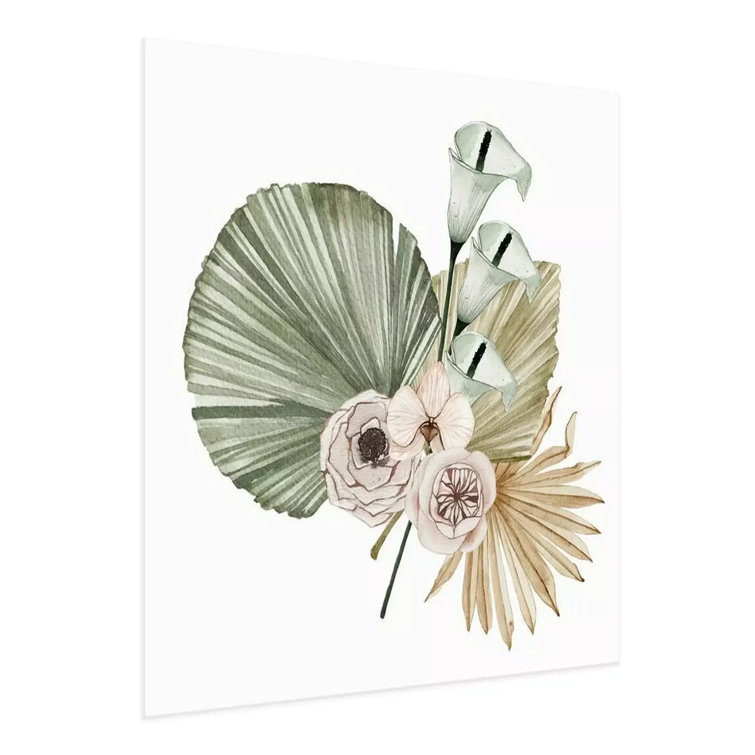 Watercolor summer floral tropical bouquet with rose flowers dried palm leaves isolated. Floral spring arrangement blossom boho wedding invitation save the date card illustration