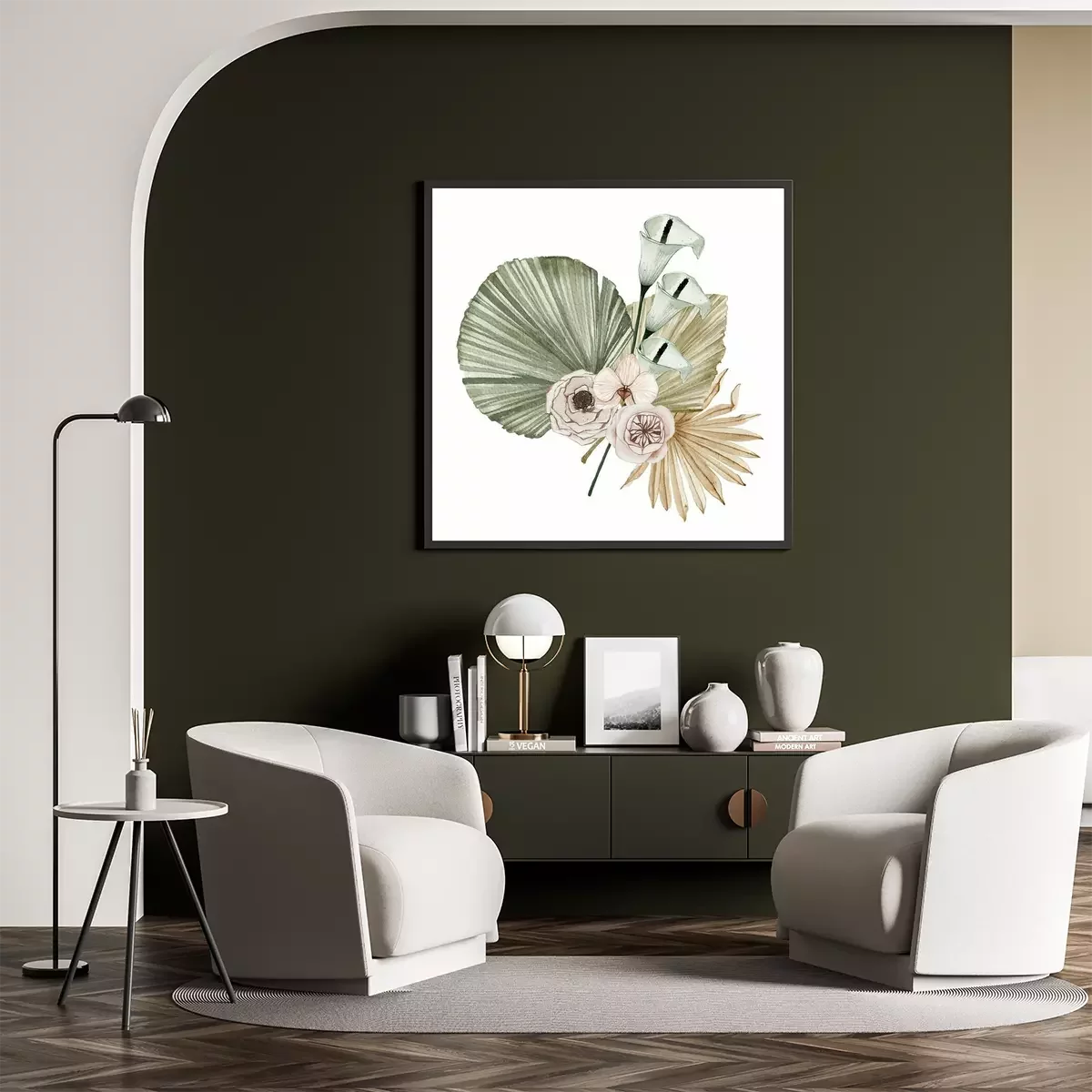 Watercolor summer floral tropical bouquet with orchid rose flowers dried palm leaves isolated. Floral spring arrangement blossom boho wedding invitation save the date card illustration