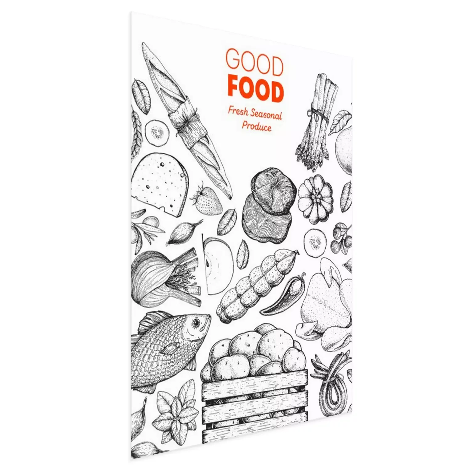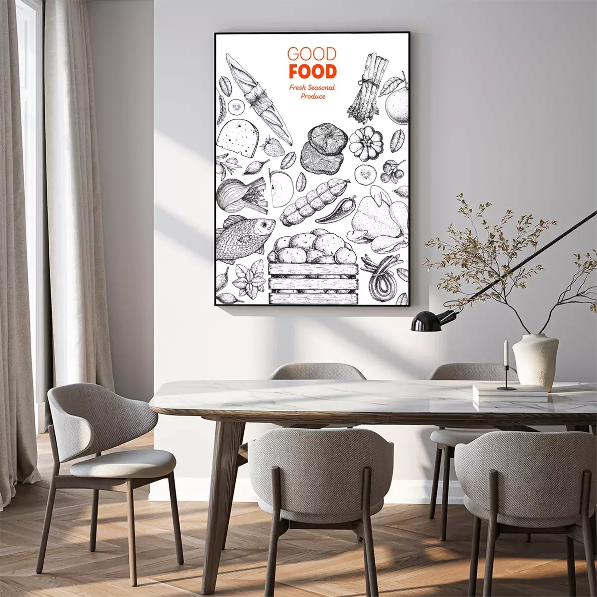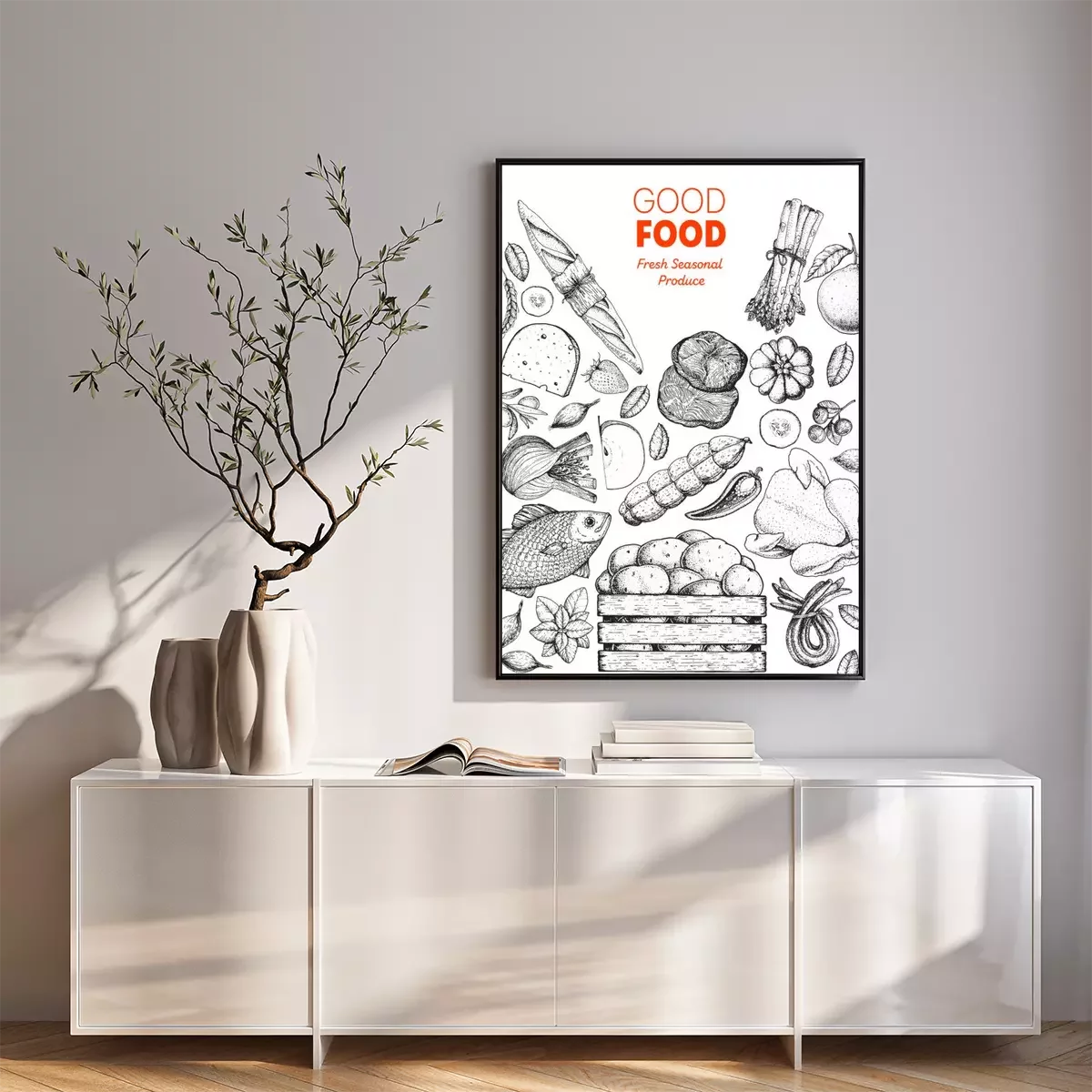 Poster Organic food illustration. Farmers market design elements. Hand drawn sketch. Various food frame. Good food store concept.