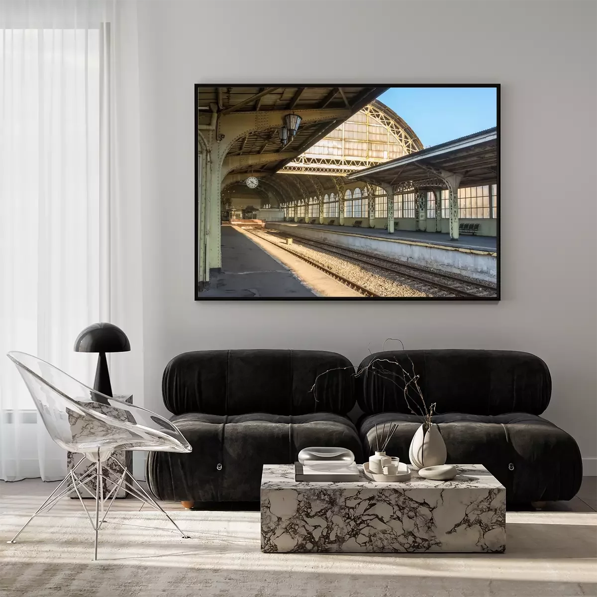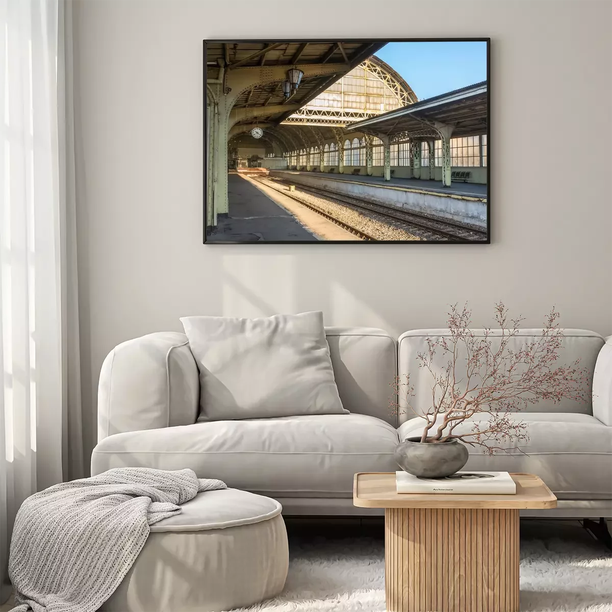 Poster: Oud station met een platformklok leeg zonder mensen.