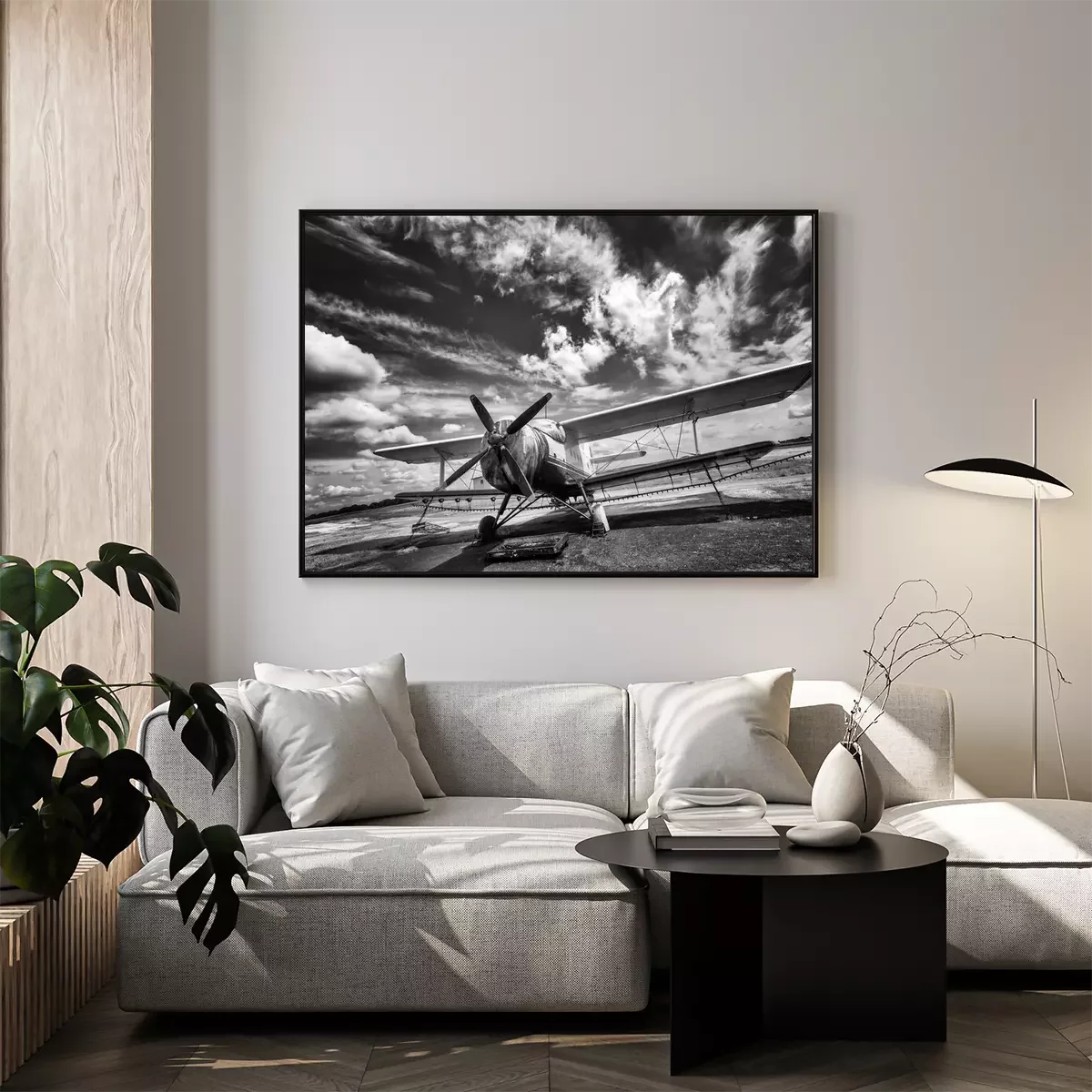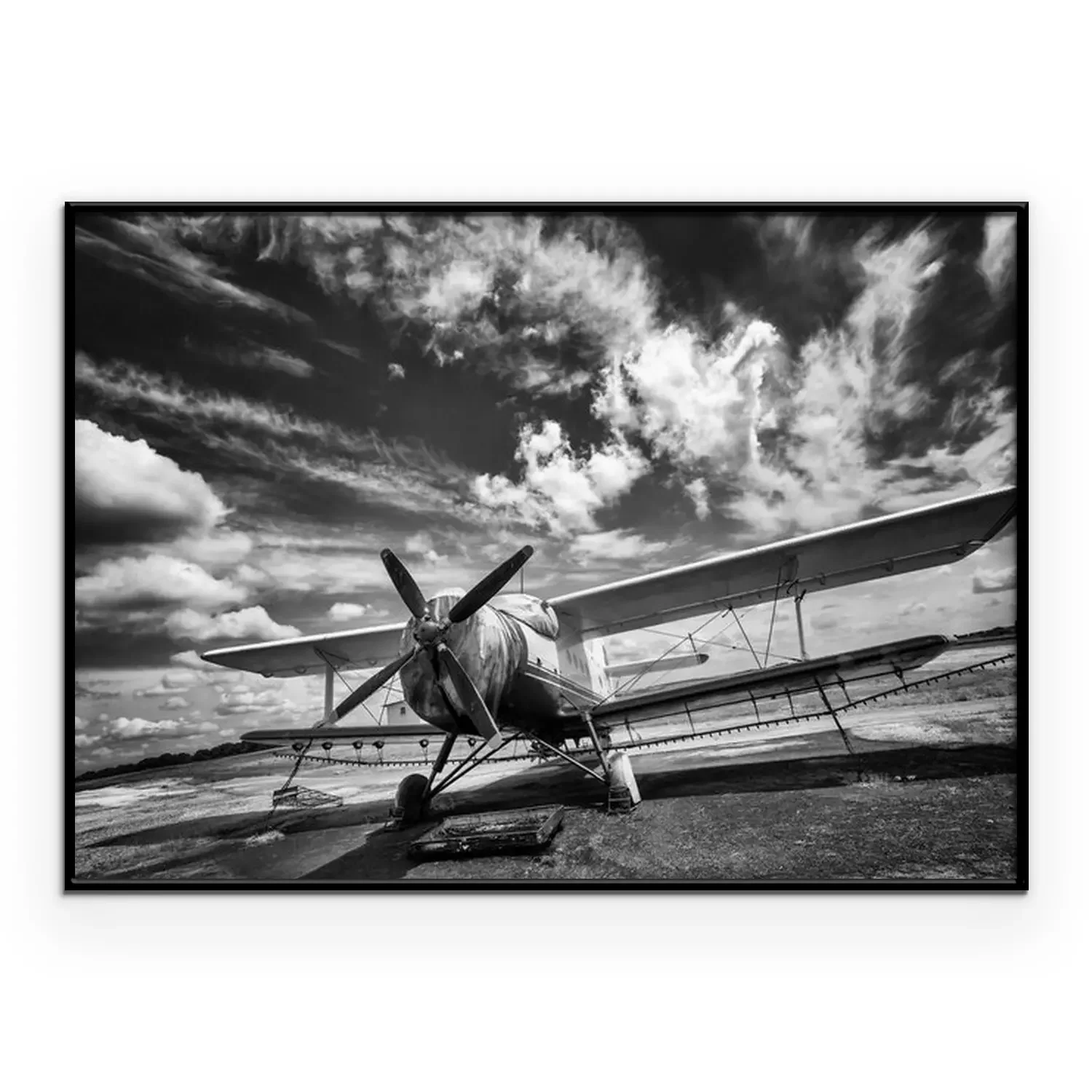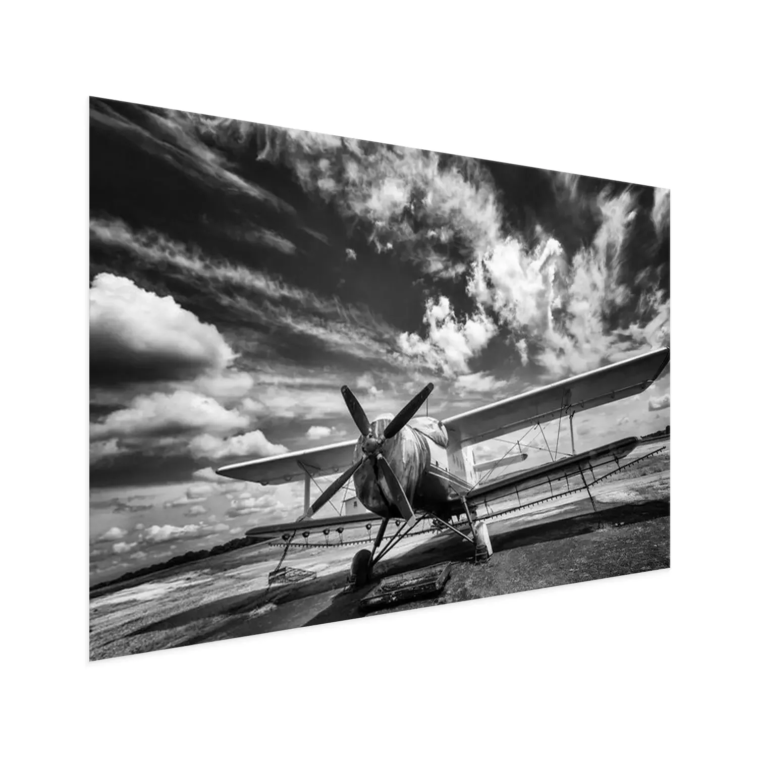 Poster: Oud vliegtuig op het veld in zwart en wit