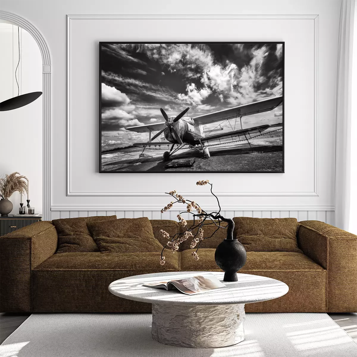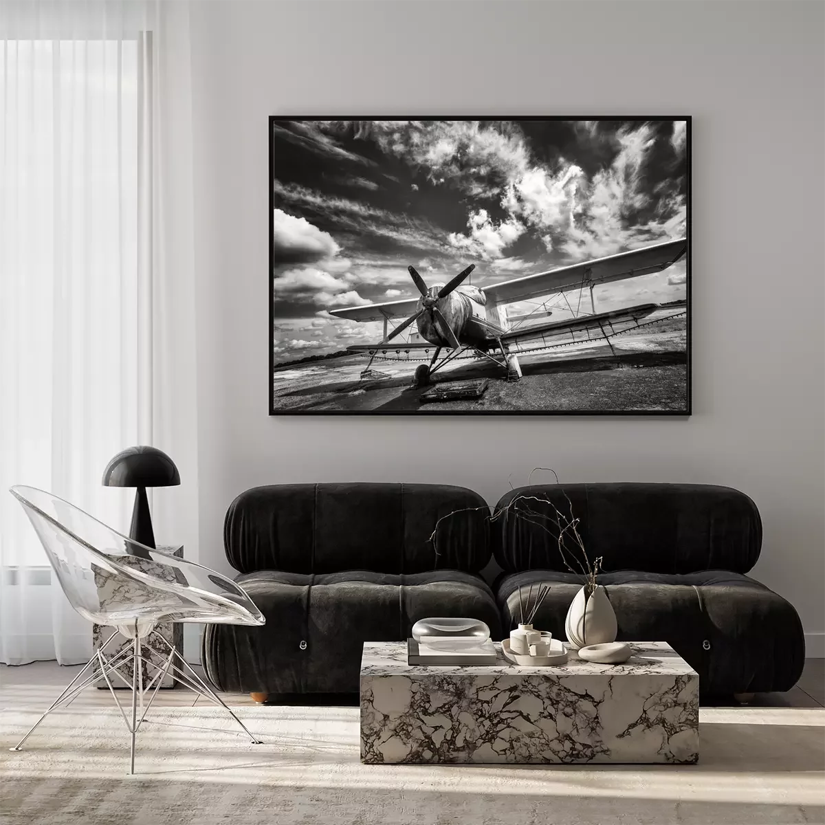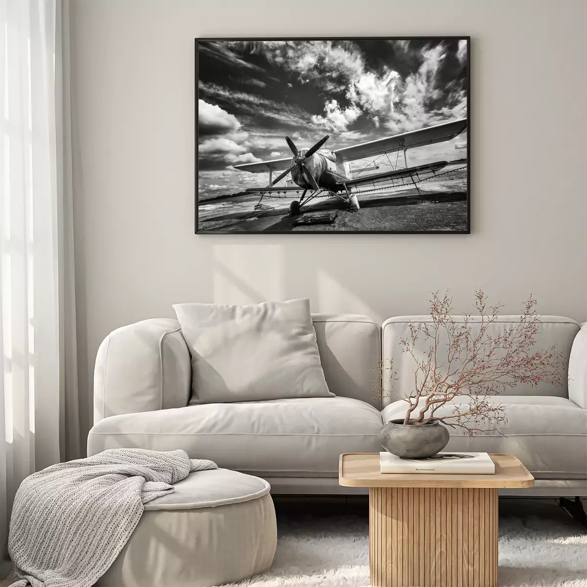 Poster: Oud vliegtuig op het veld in zwart en wit