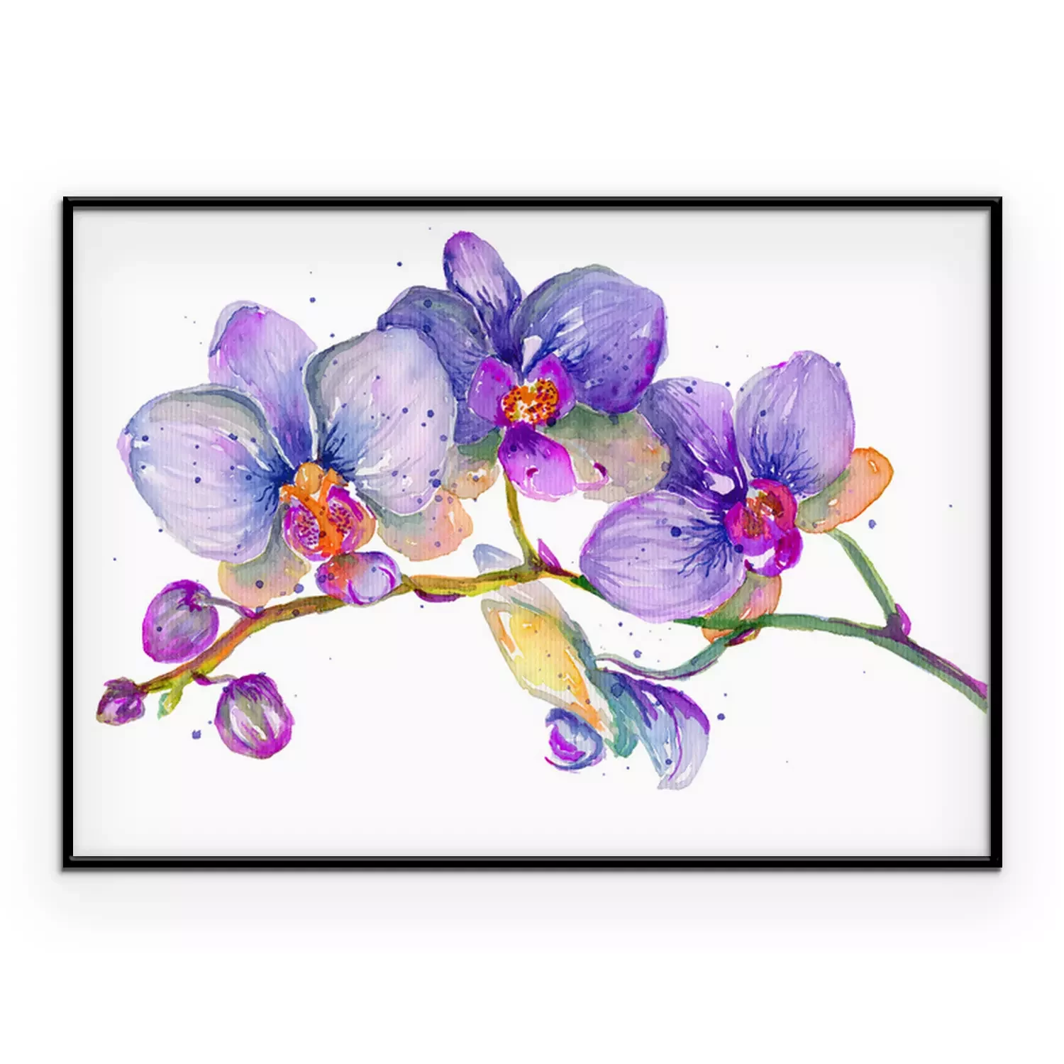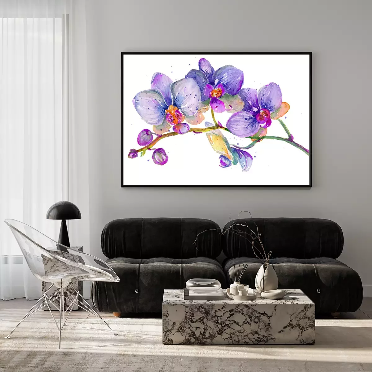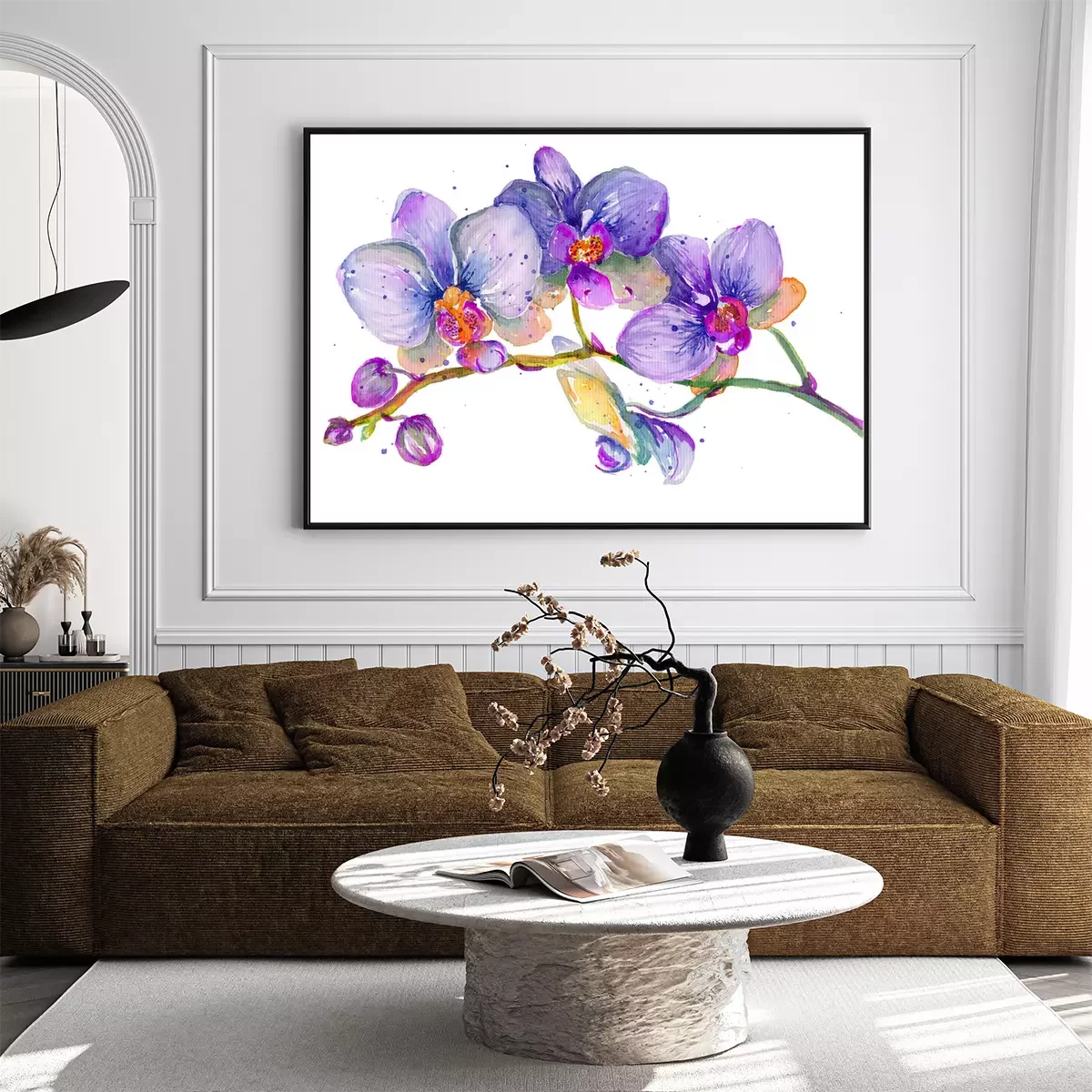 Drie paarse orchidee, tak, bloem, waterverf schets op een witte achtergrond