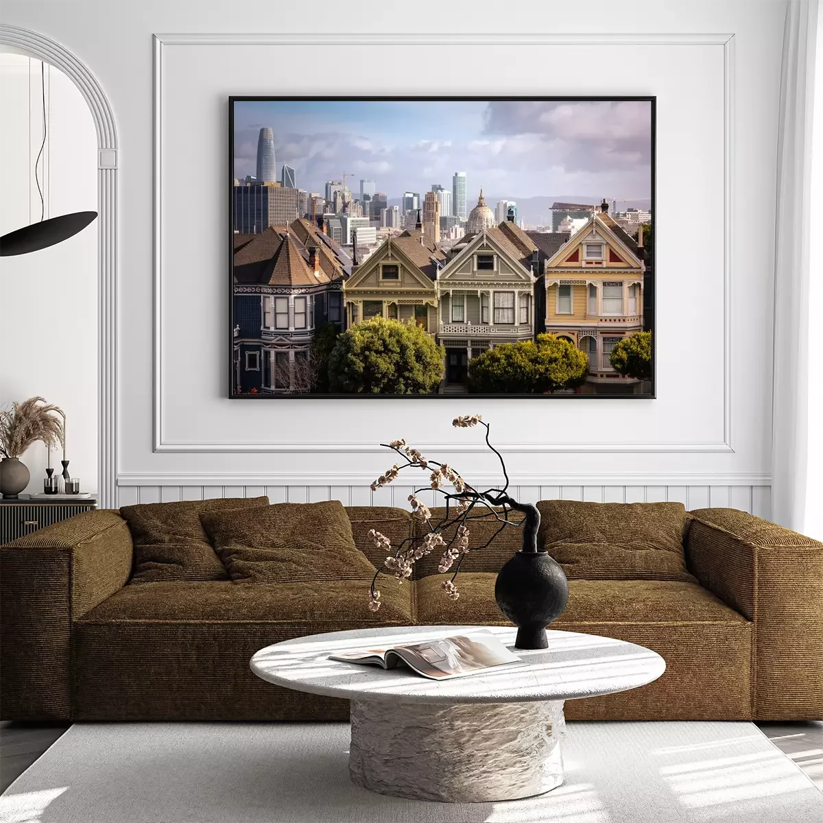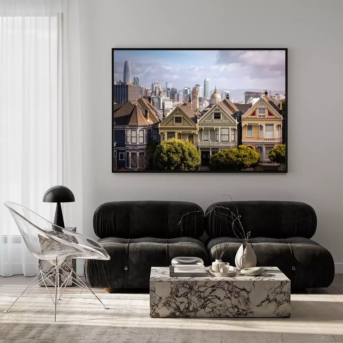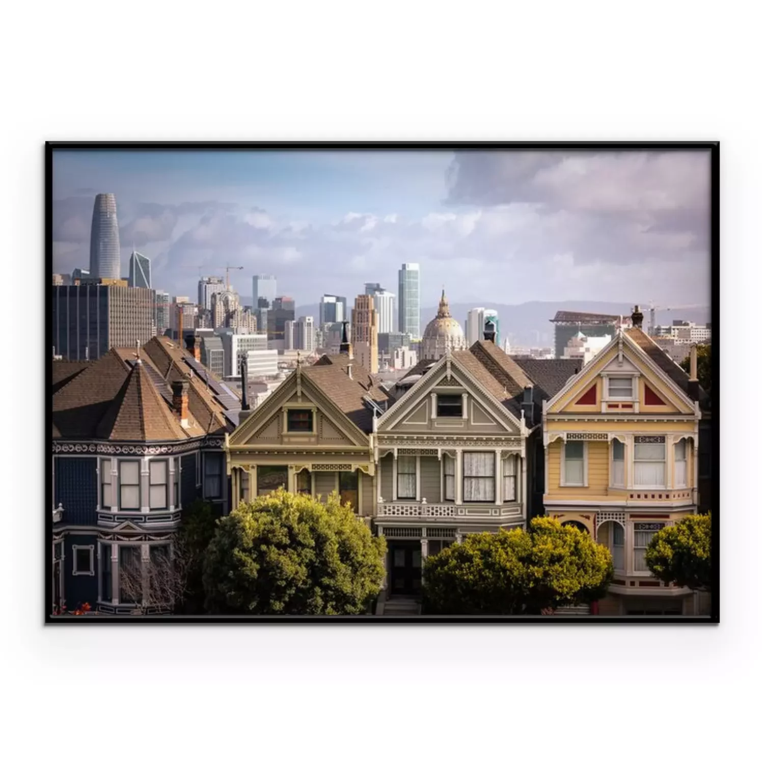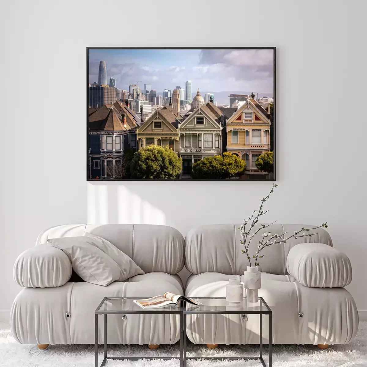 Poster Painted Ladies houses and San Francisco's skyline at the back, California State, United States.