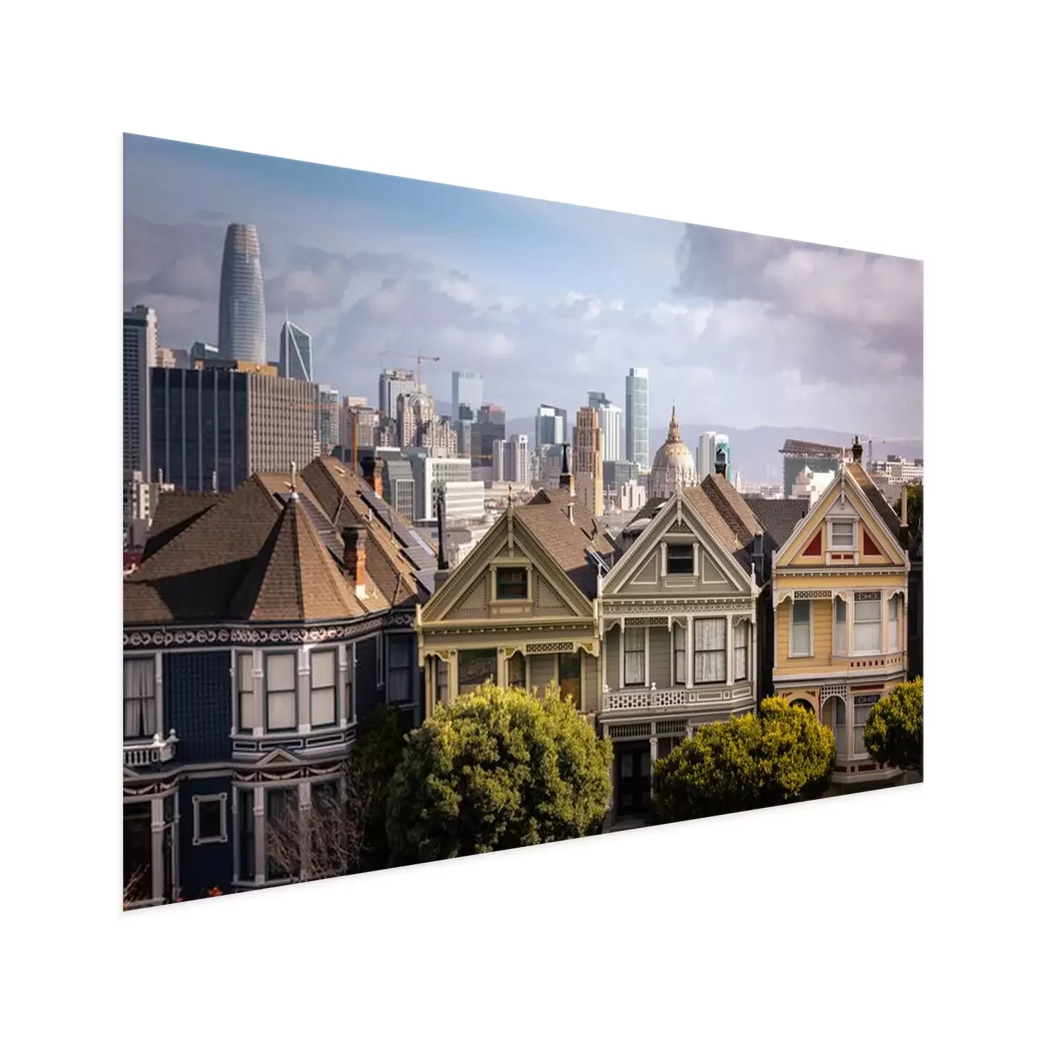 Poster: Painted Ladies houses and San Francisco's skyline at the back, California State, United States.