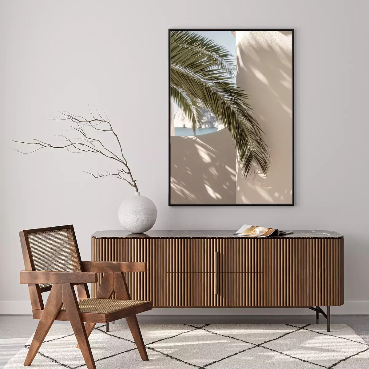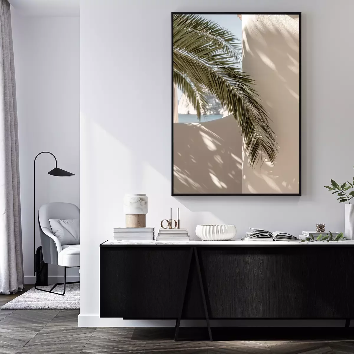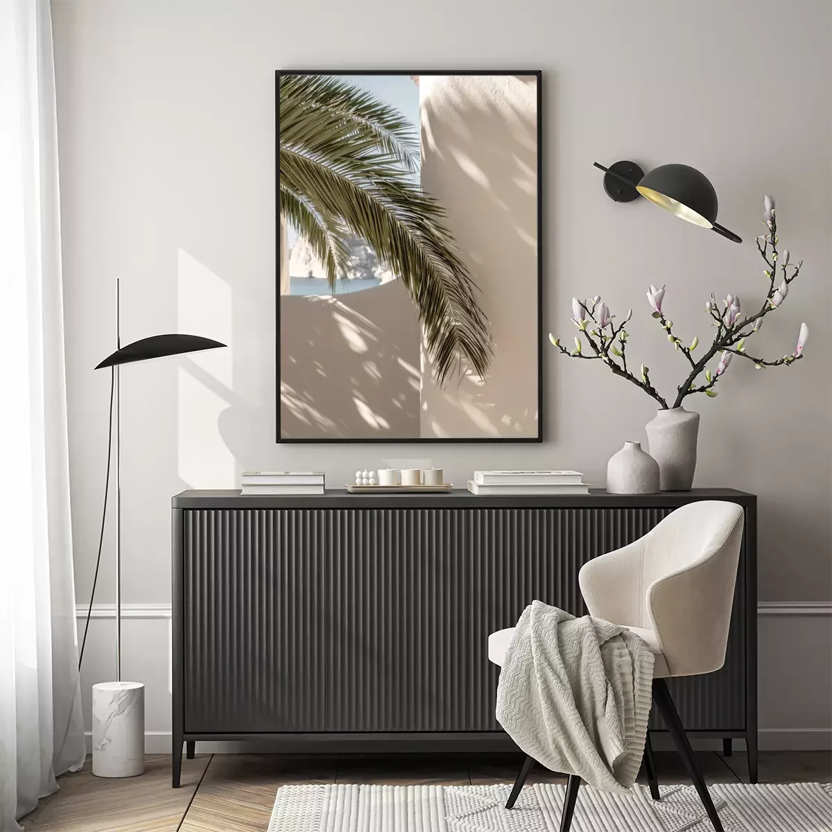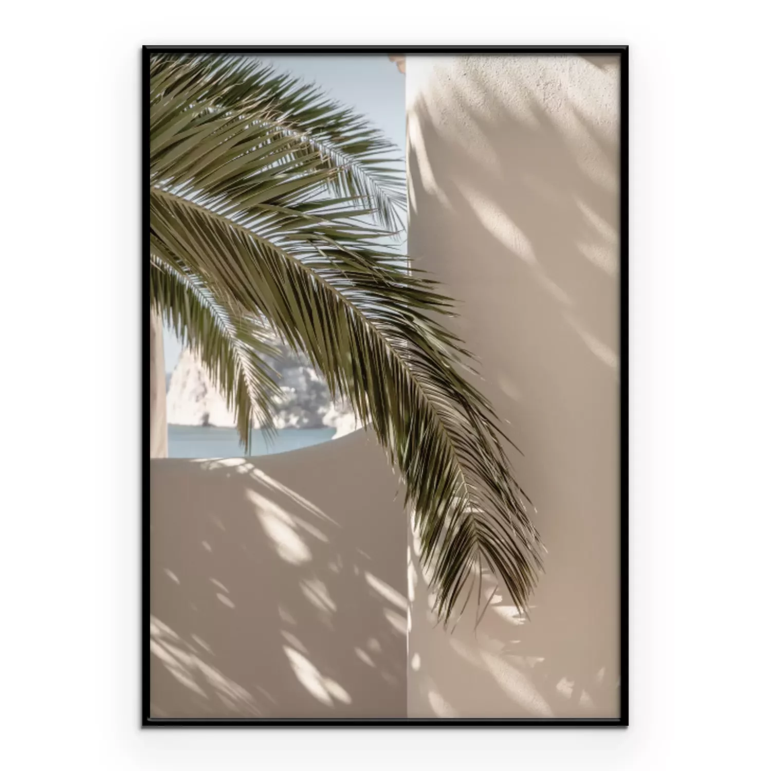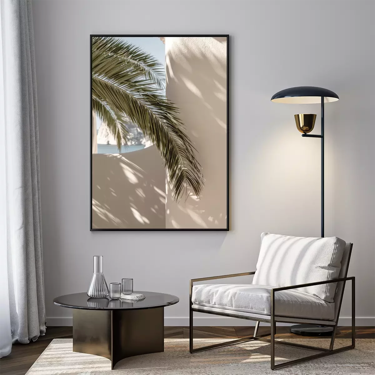 Poster: Palm leaf beautiful shadows on the wall. Creative, minimal, bright and airy styled concept.