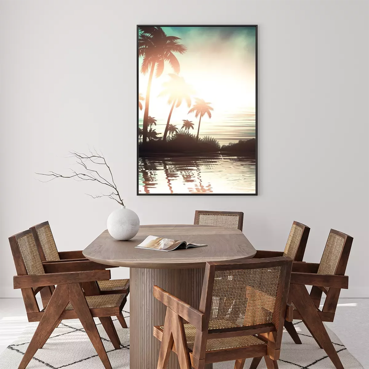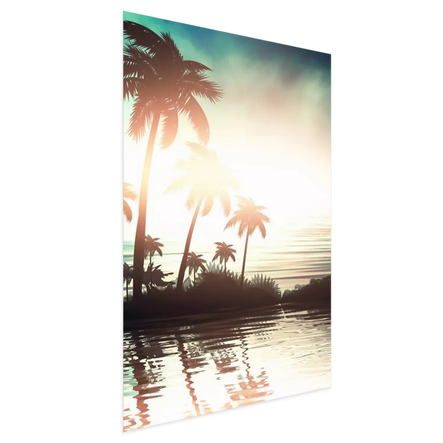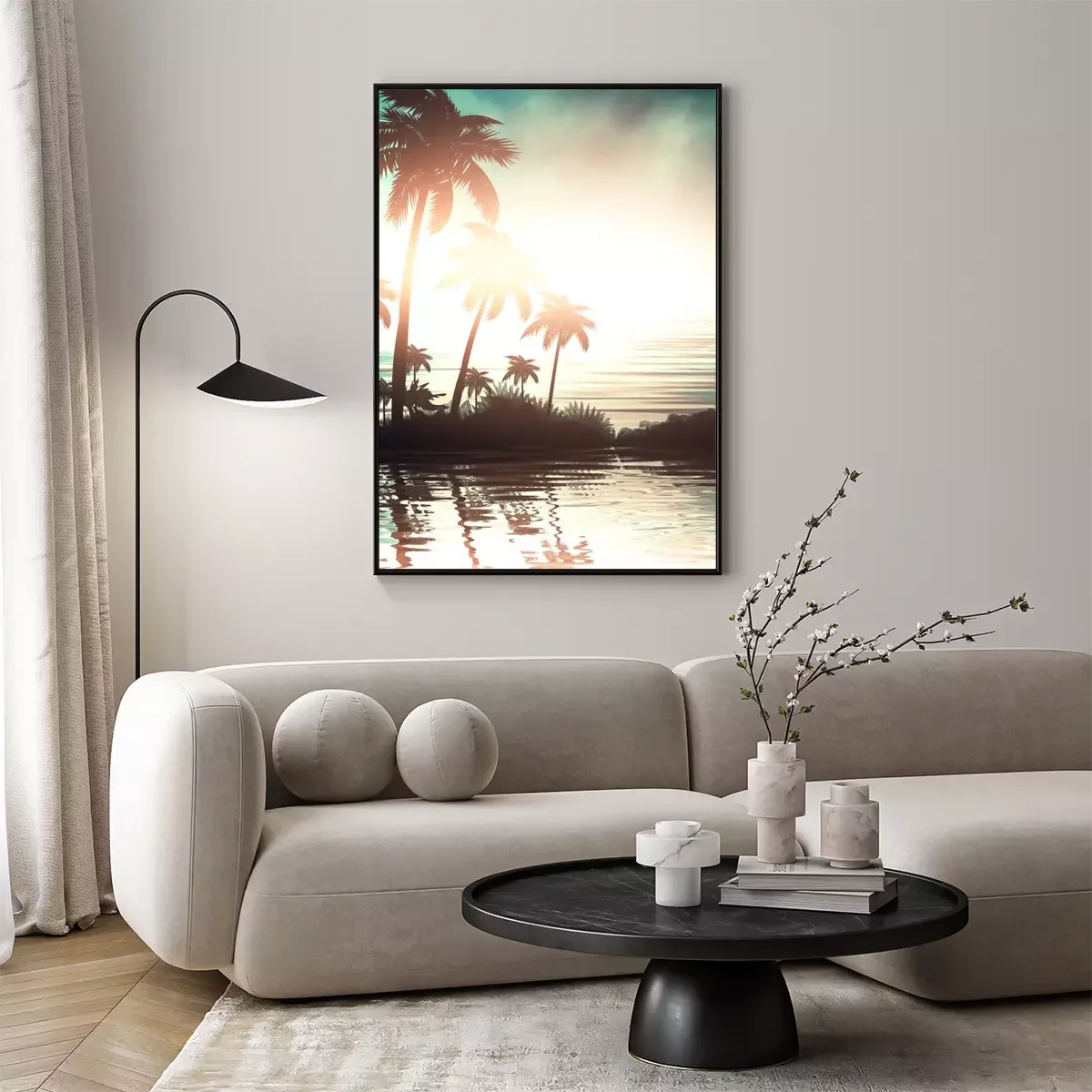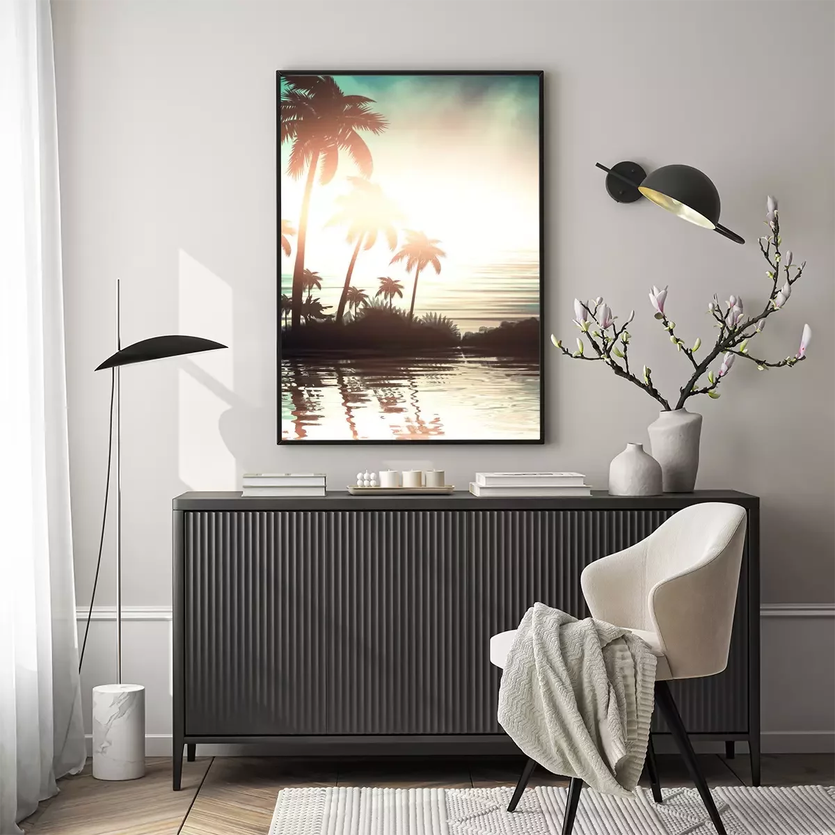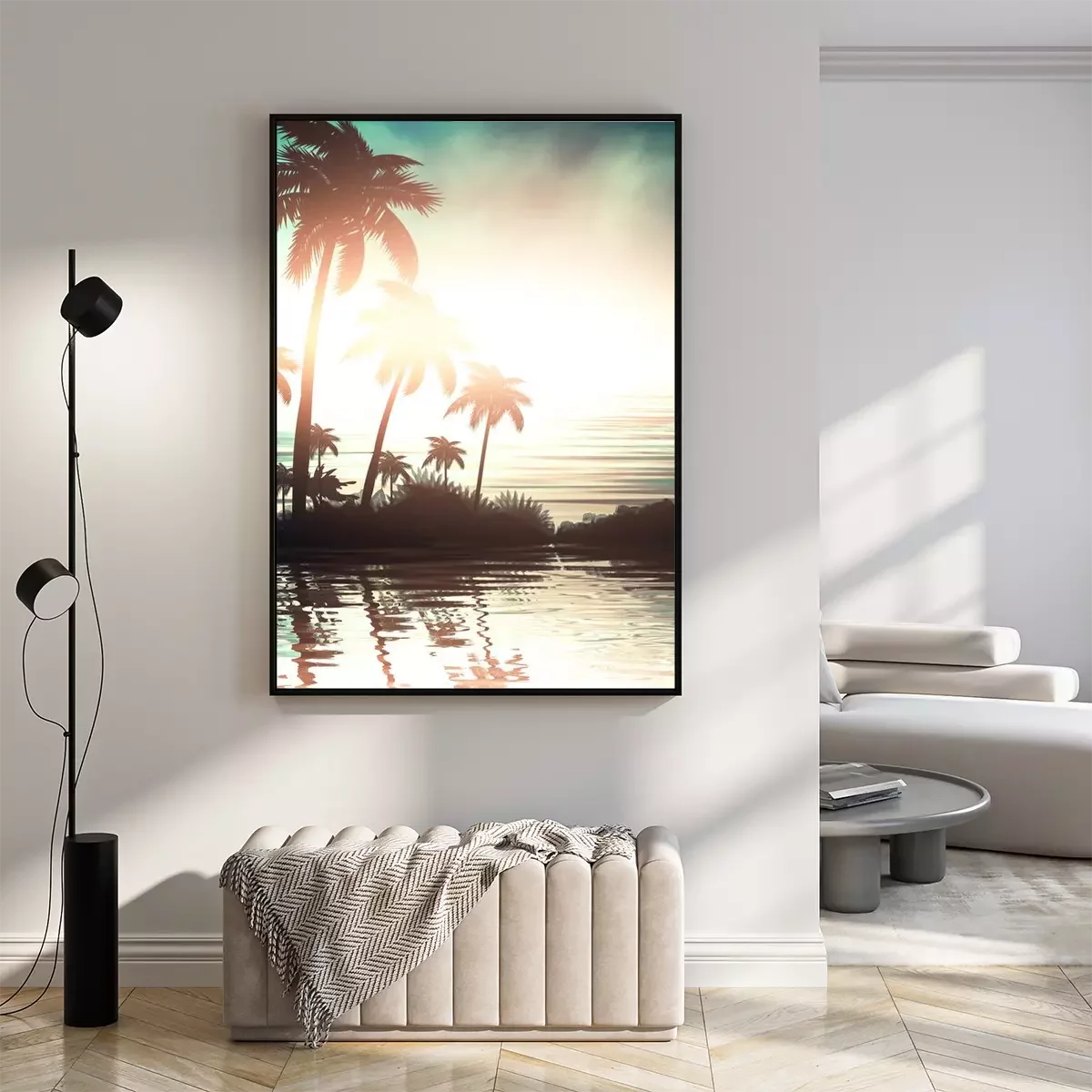 Empty tropical background of night sea beach. Silhouettes of tropical palm trees on a background of bright sunset. 3d illustration
