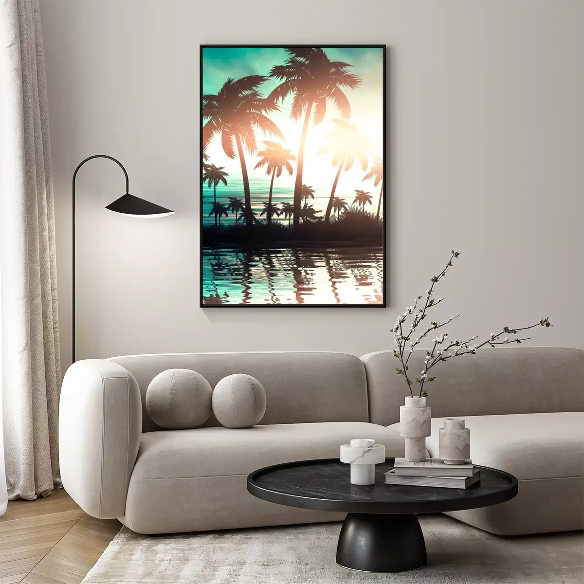 Empty tropical background of night sea beach. Silhouettes of tropical palm trees on a background of bright sunset. 3d illustration