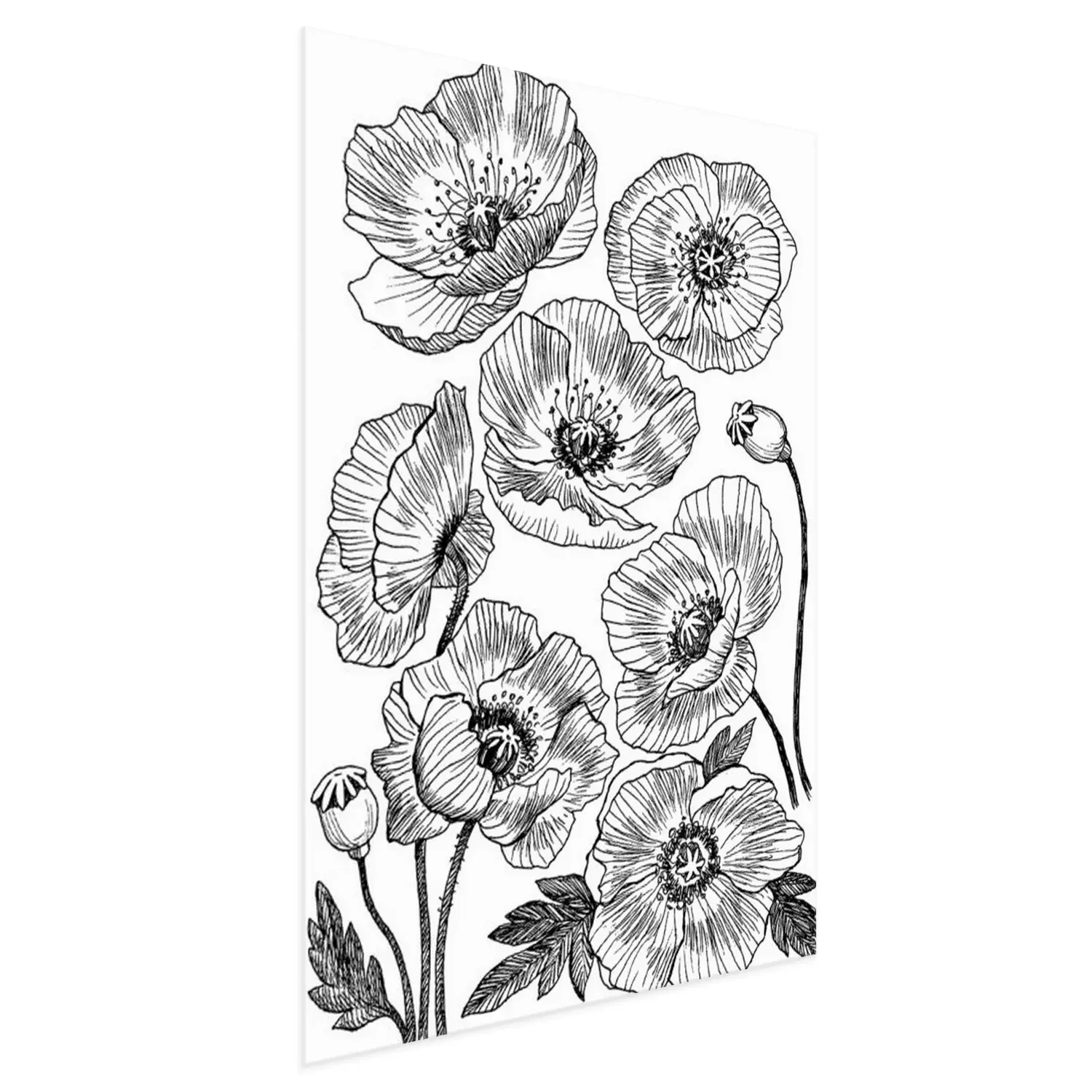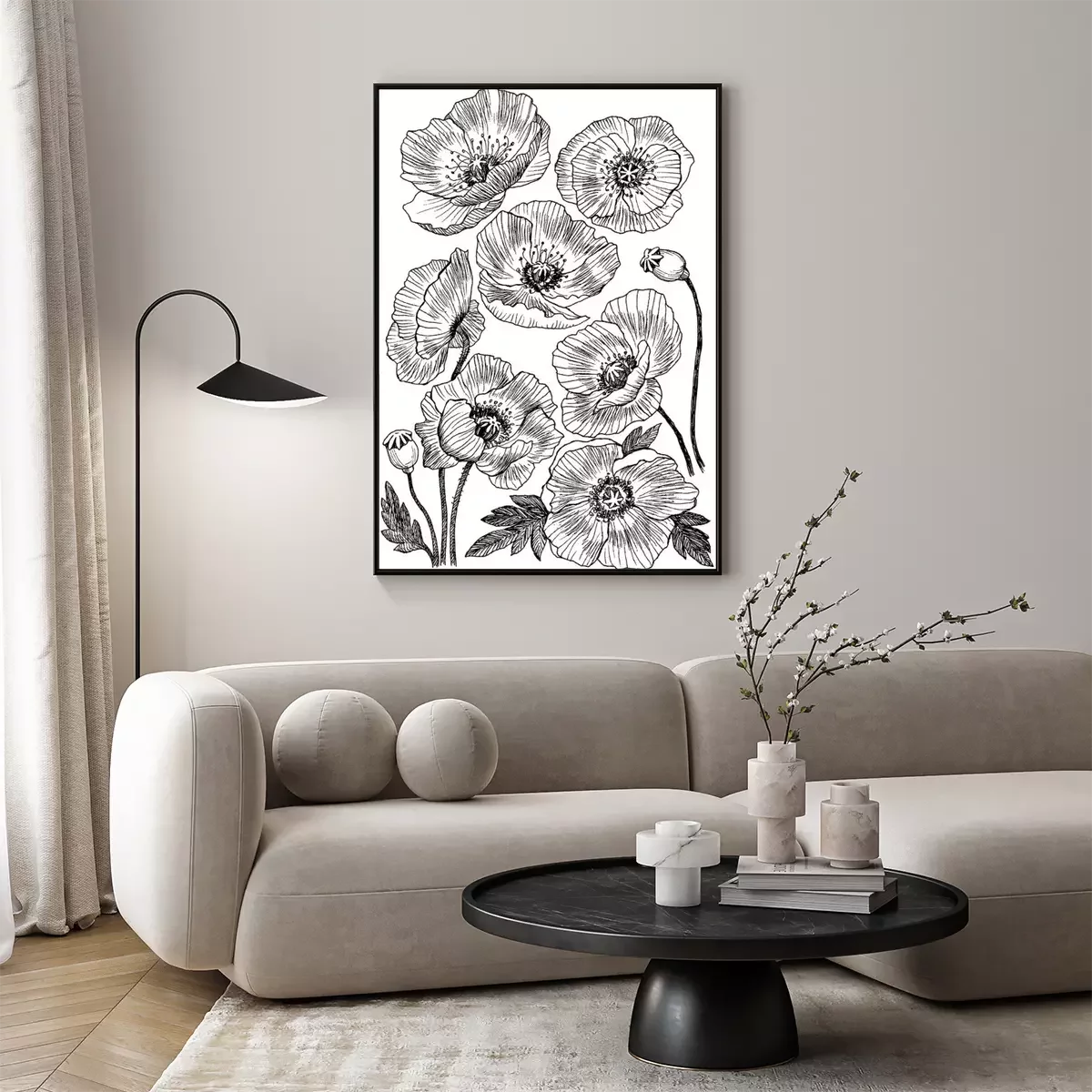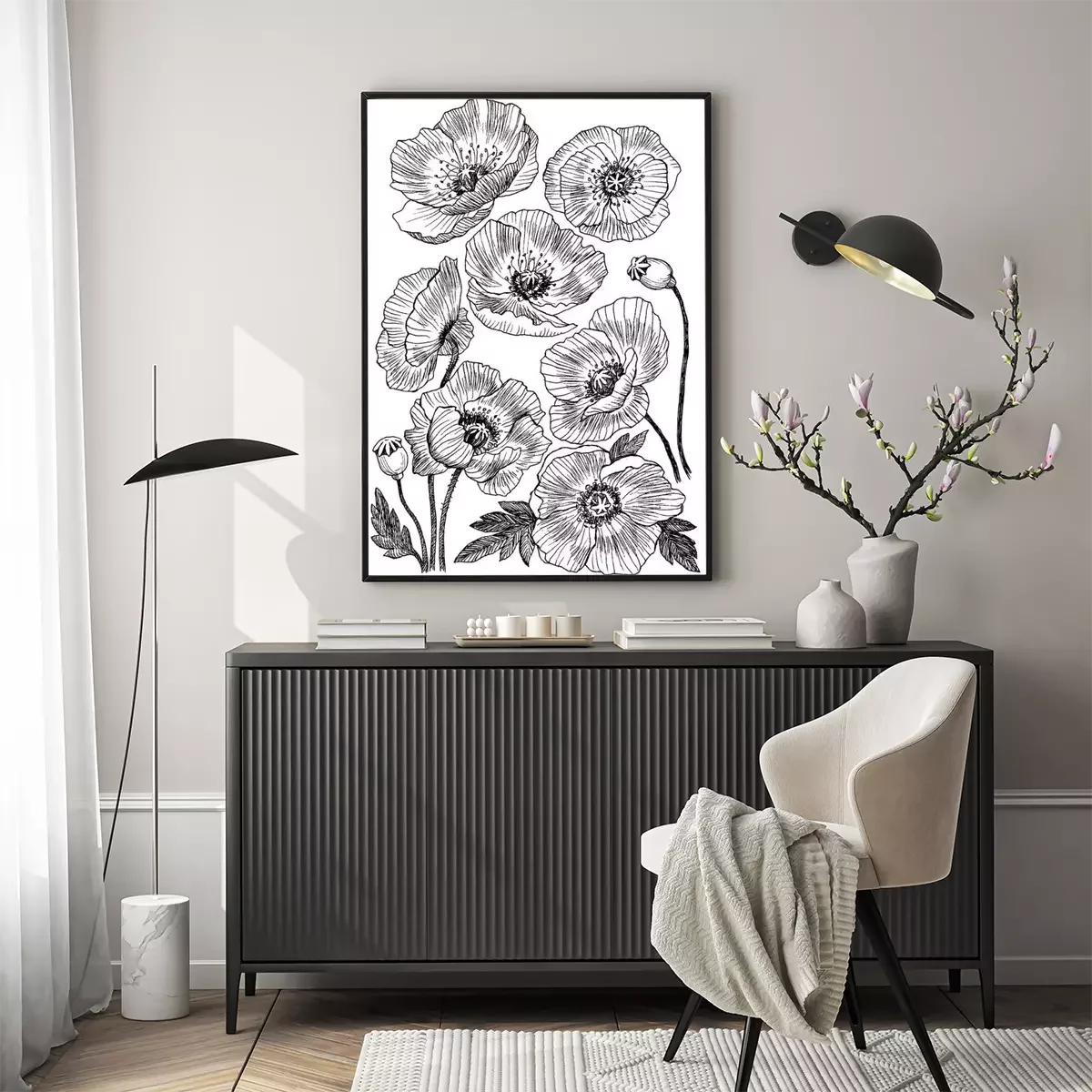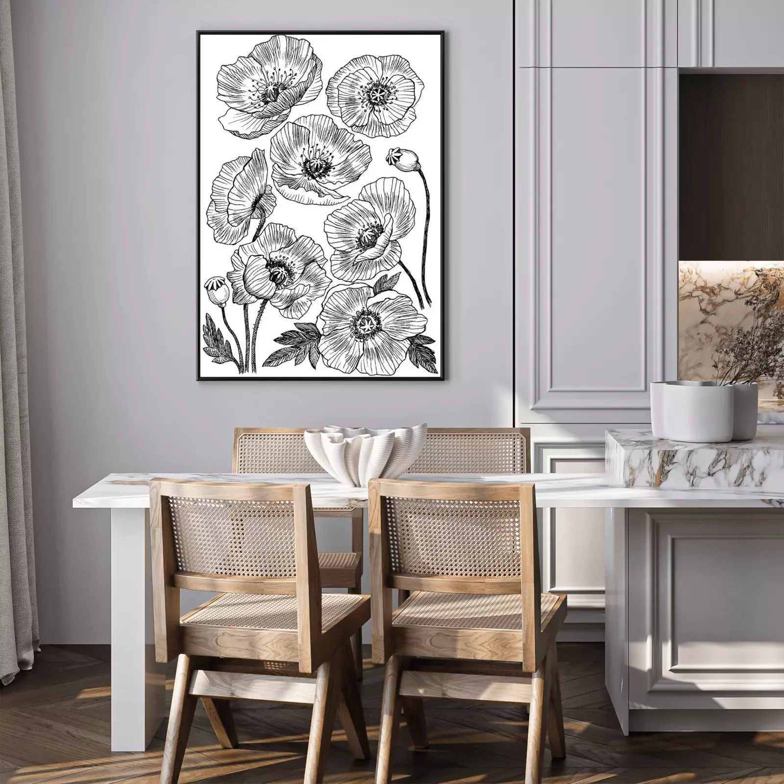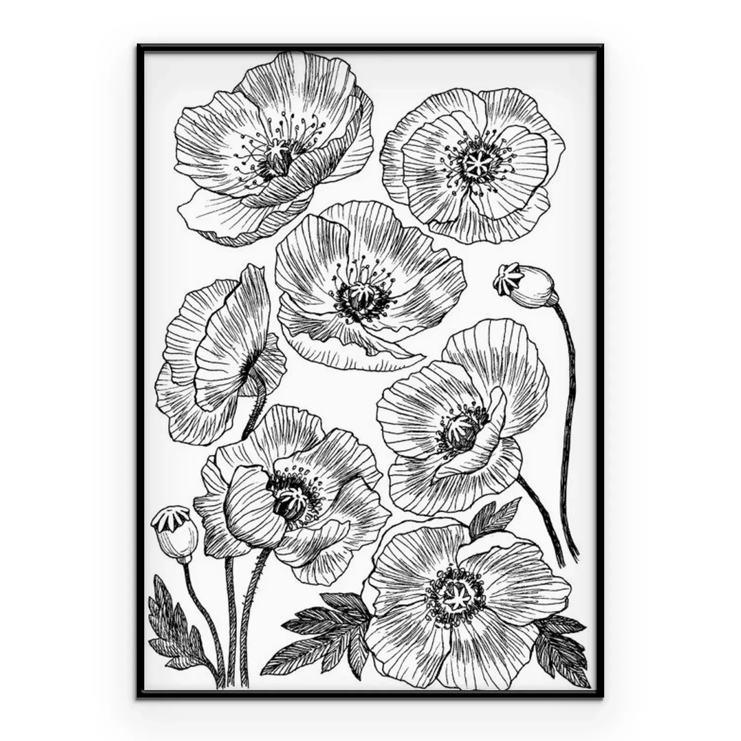 Poster: Papavers op een witte achtergrond geschetst met een potlood