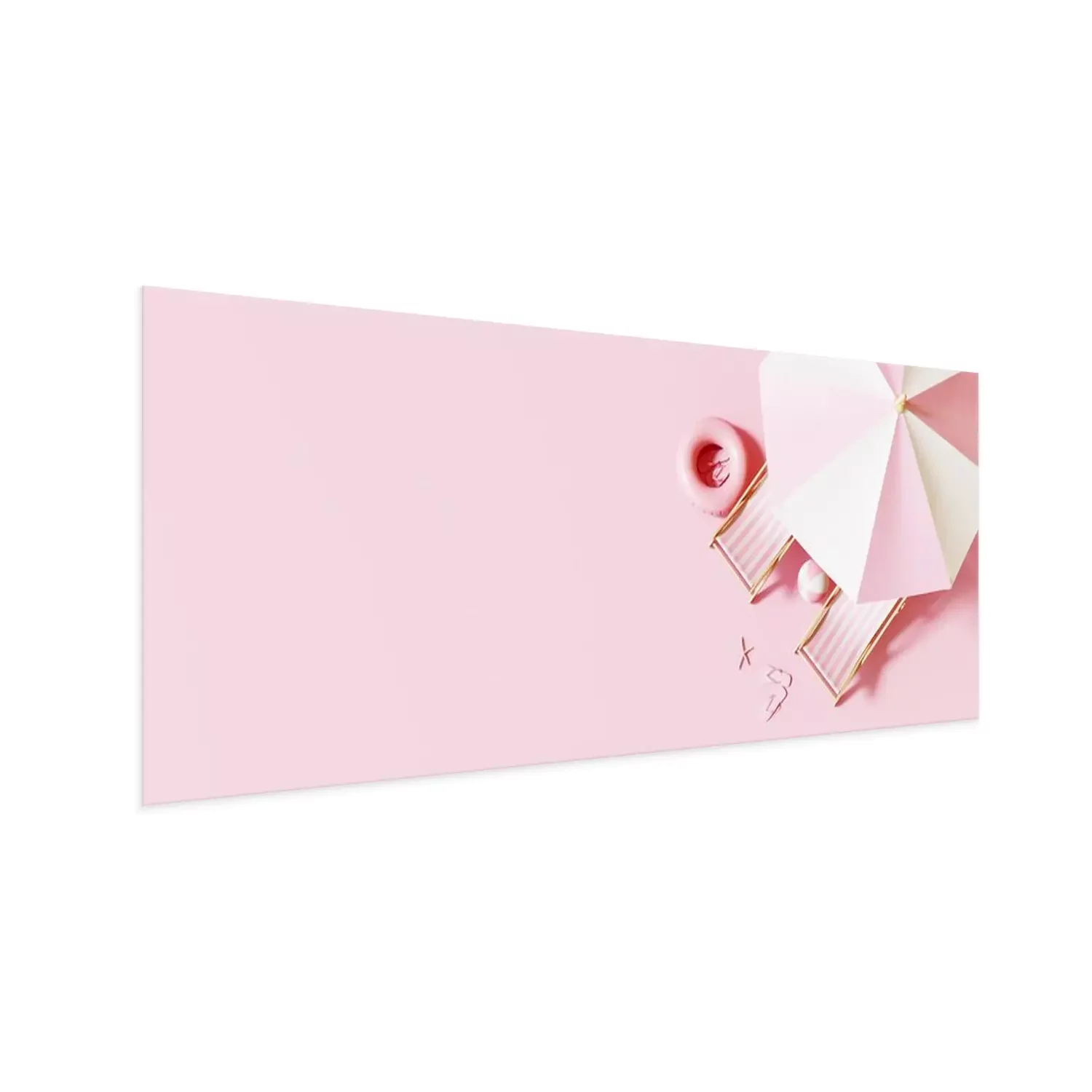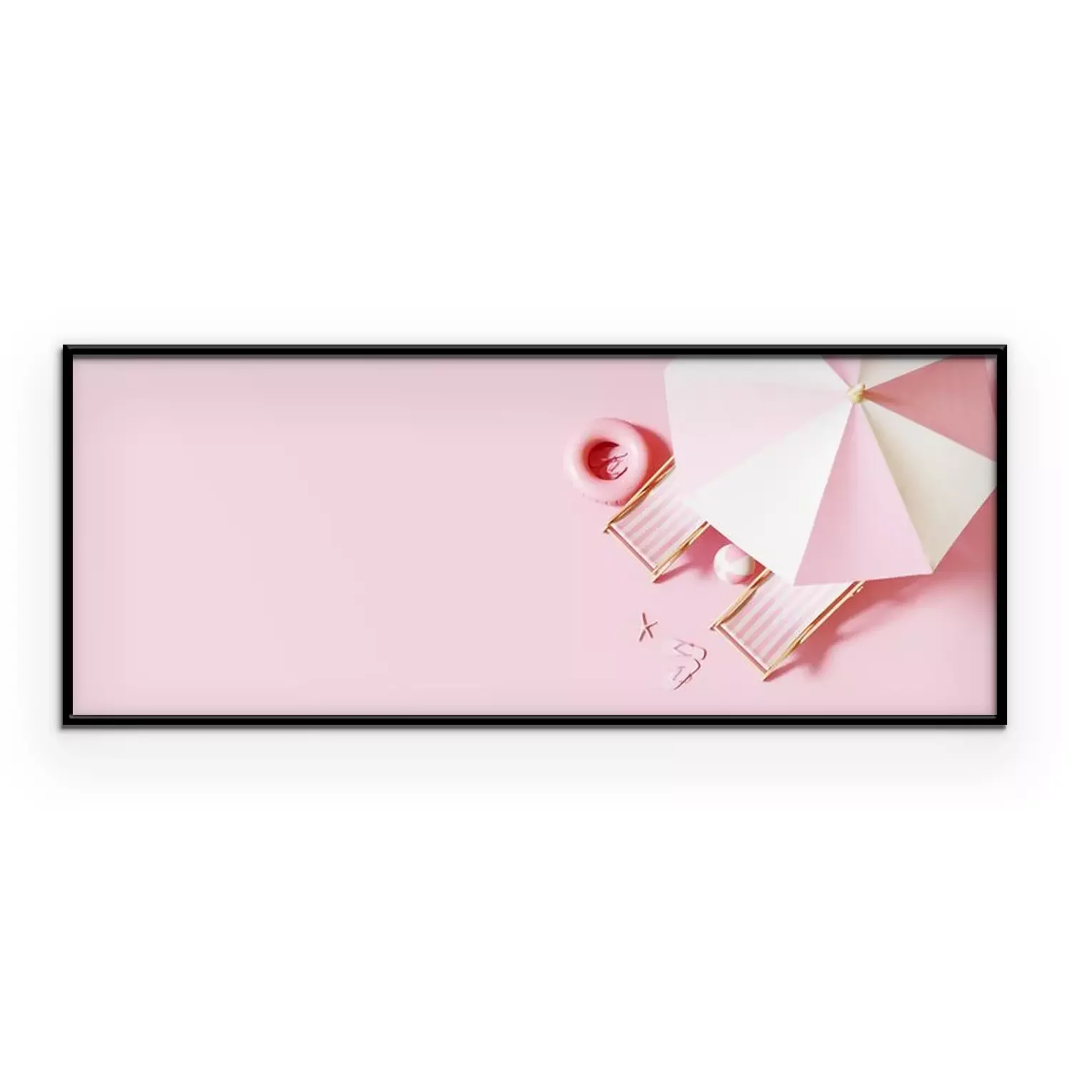 Poster: Paraplu en ligbedden in een roze esthetiek