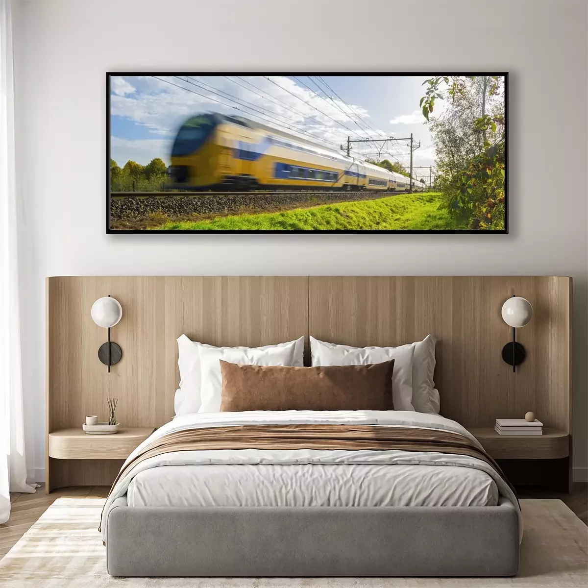 Poster: Passagierstrein rijdt met hoge snelheid in het zonlicht