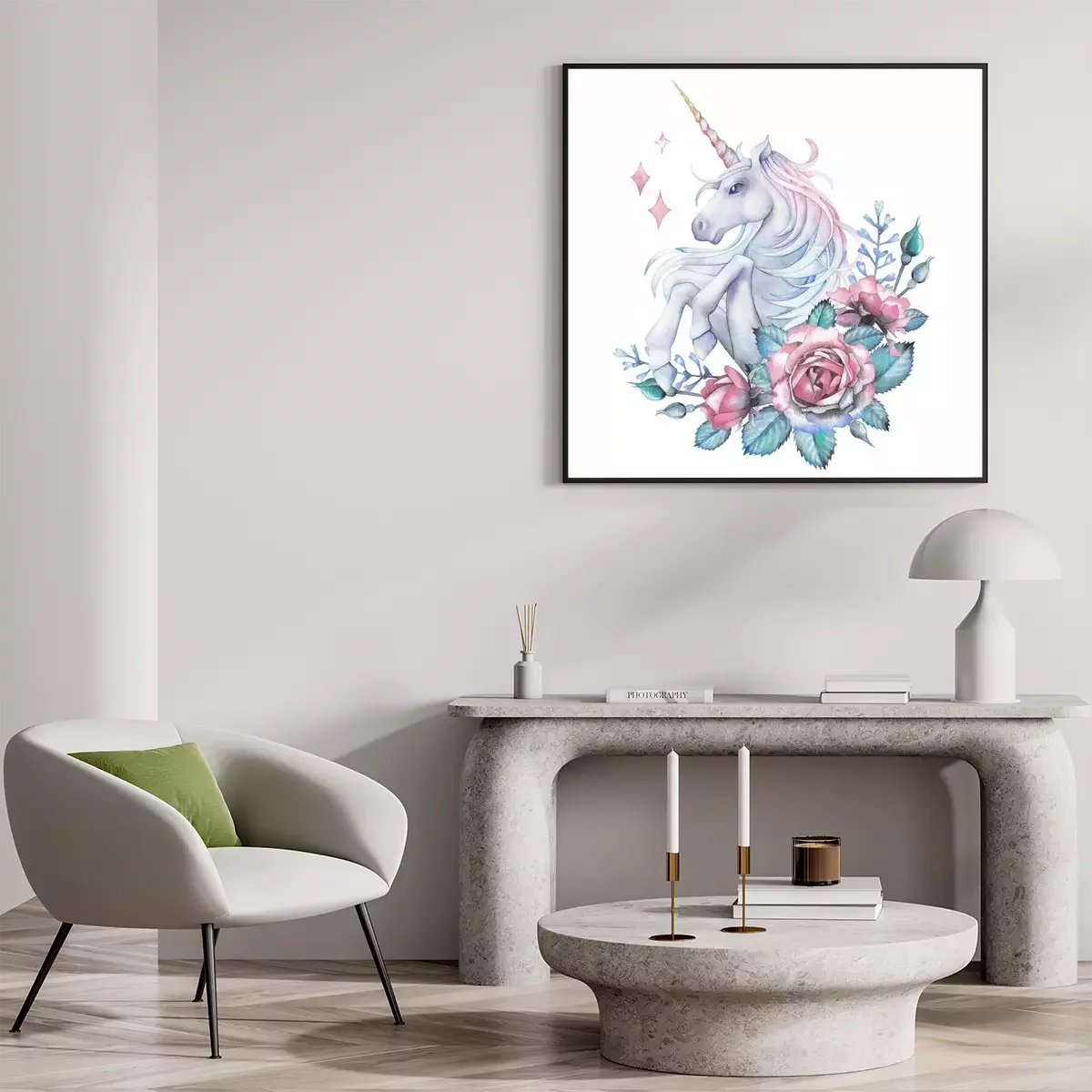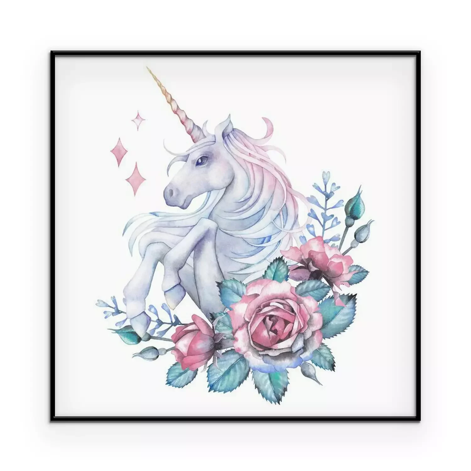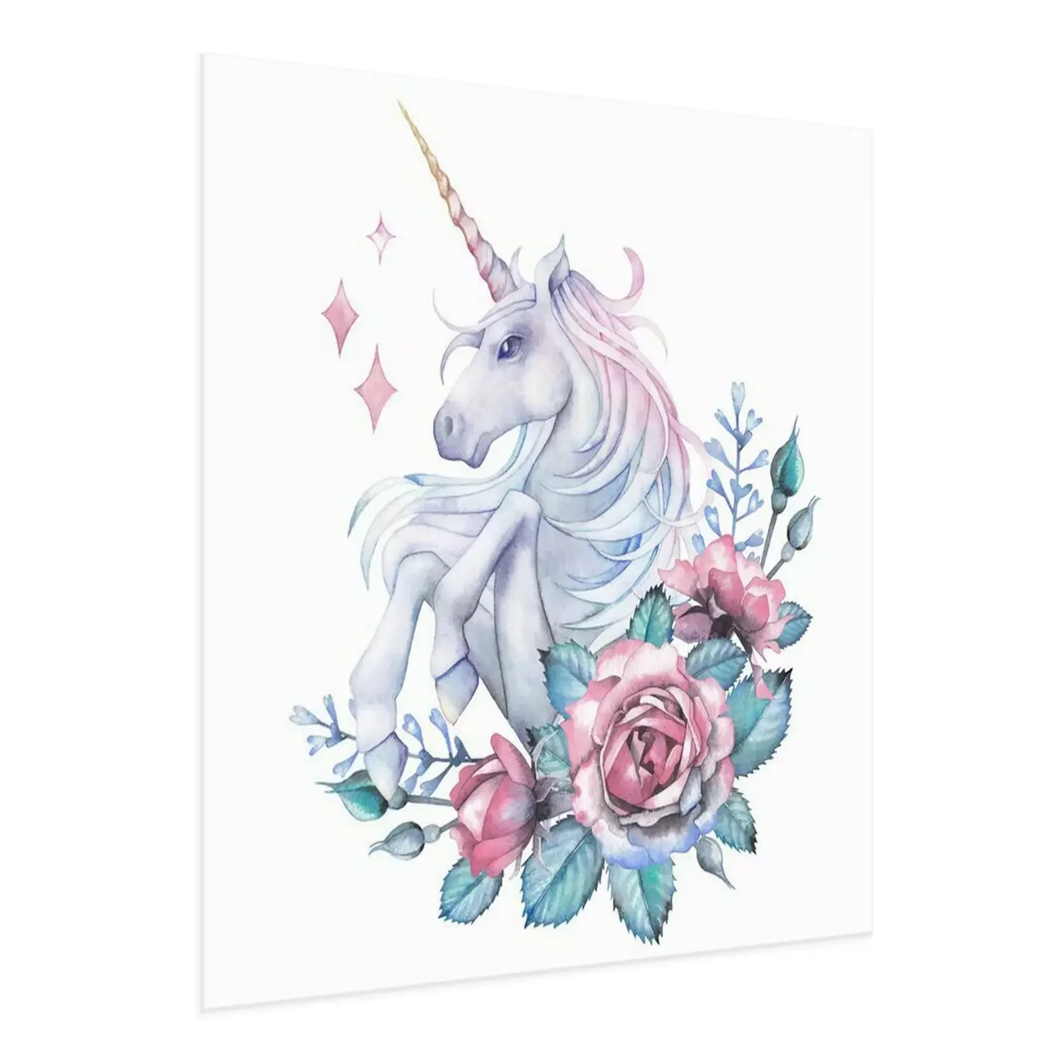 Poster: Pastel eenhoorn met verhoogde hoeven en rozen