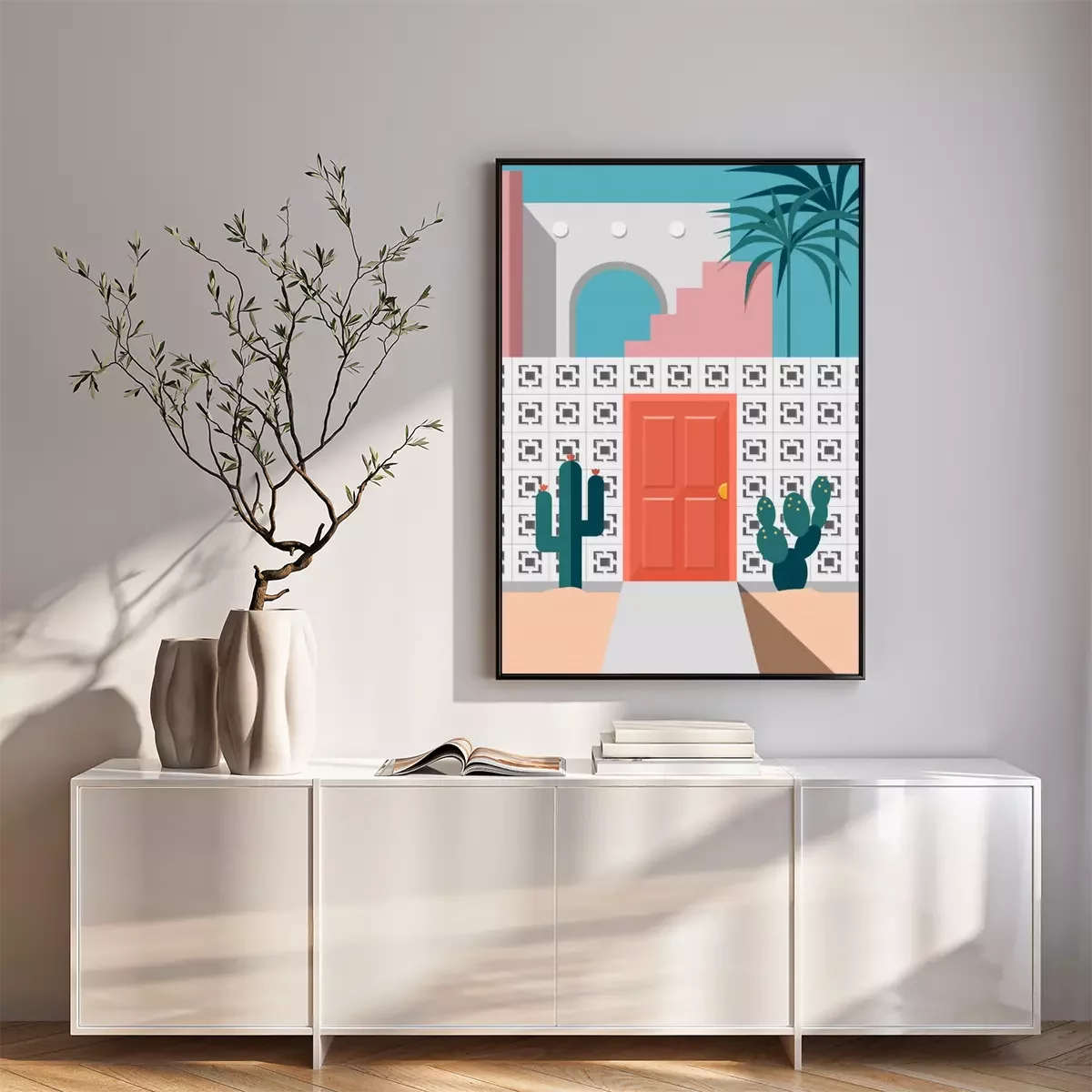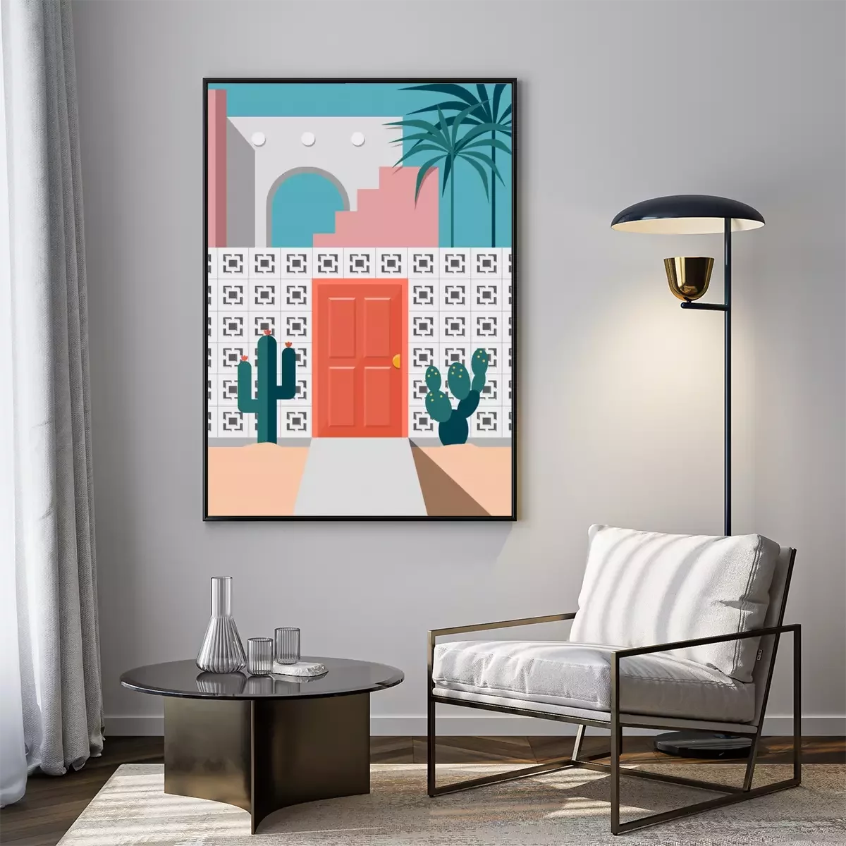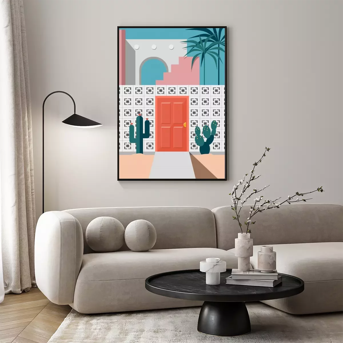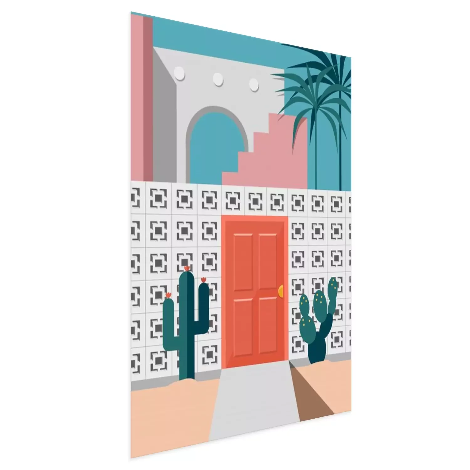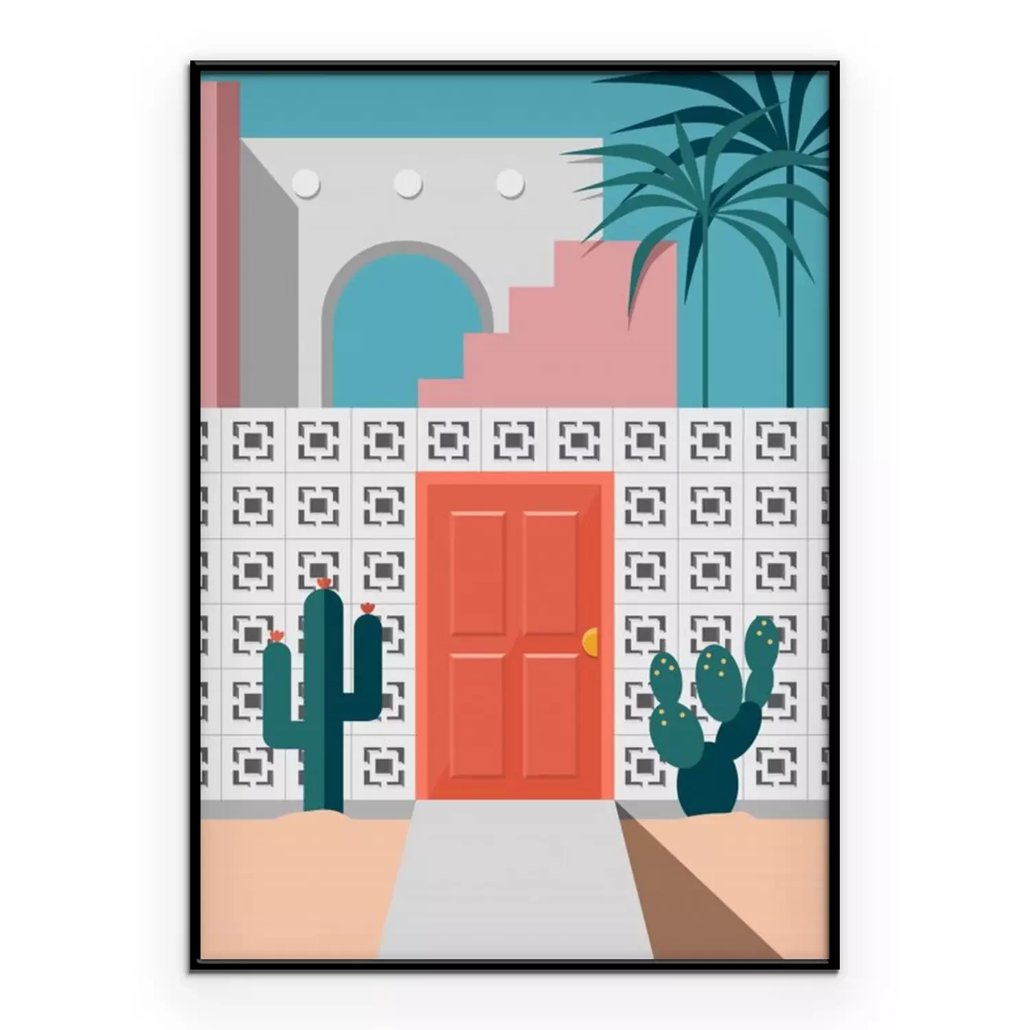 Poster: Pastel modern mid century building faced with red door and cactus coconut trees