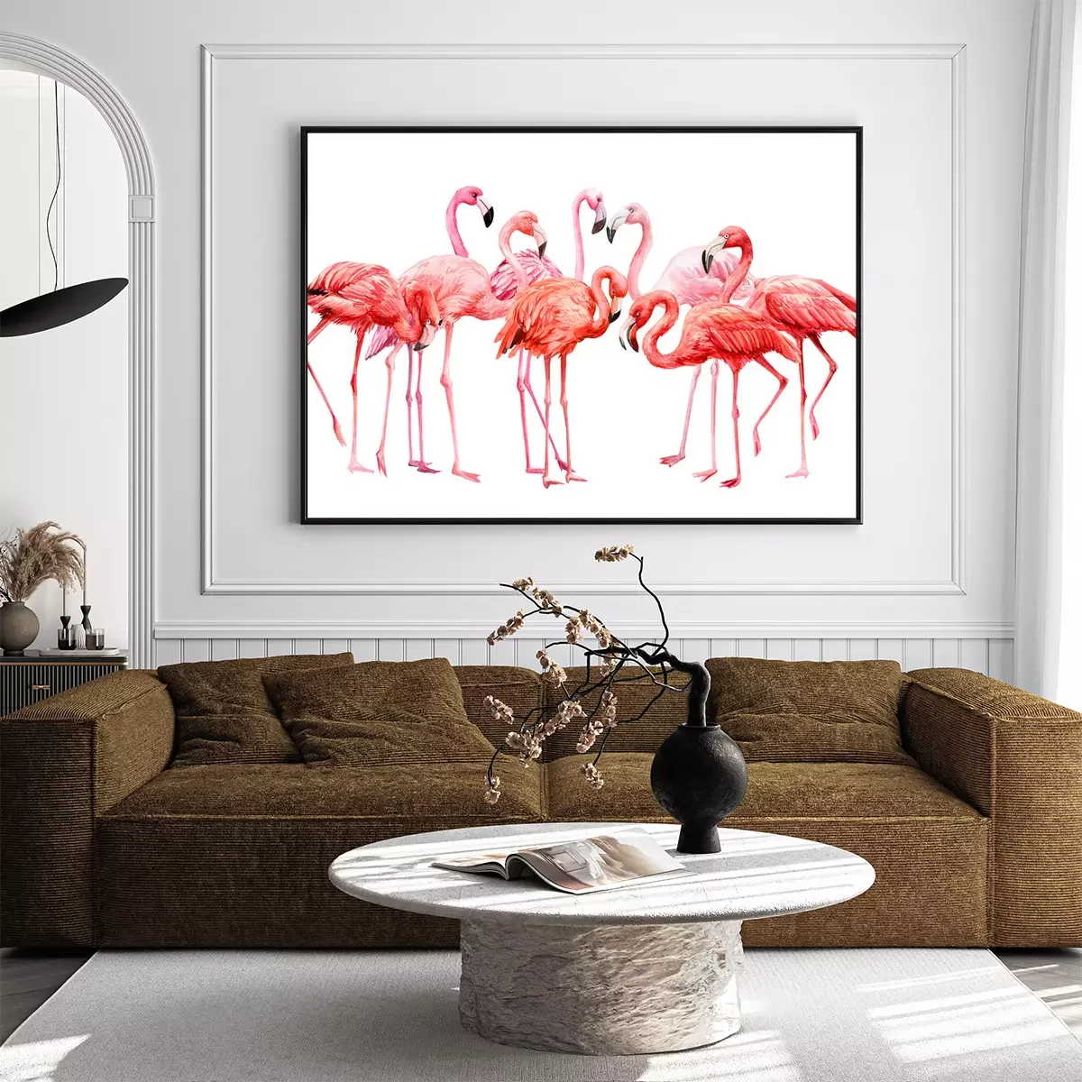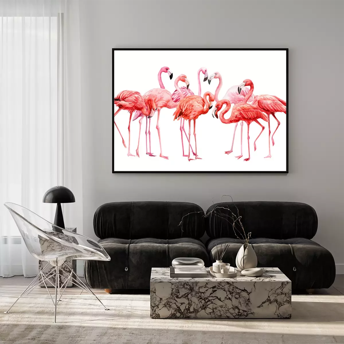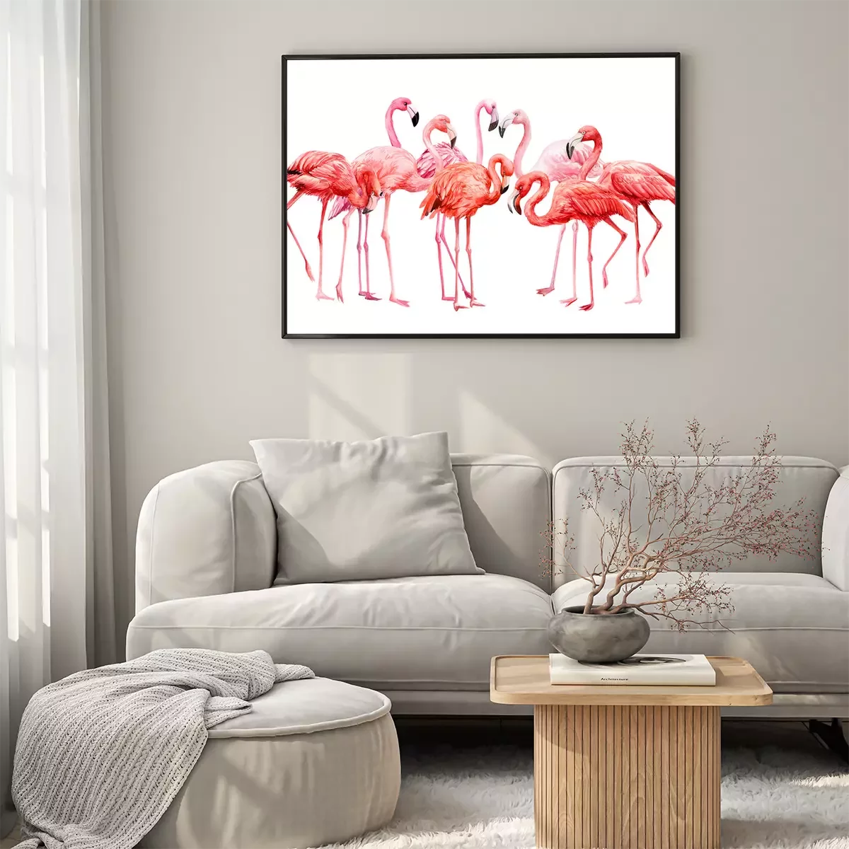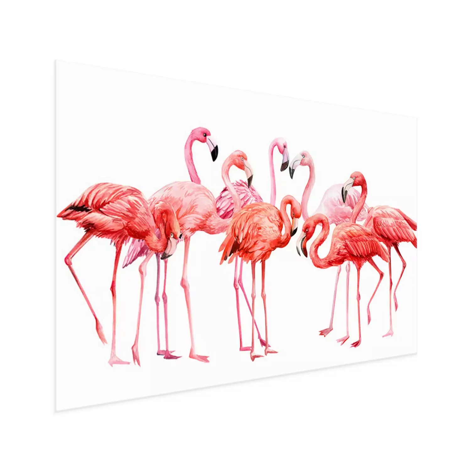 Poster: Pastelkleurige flamingo's op een witte achtergrond