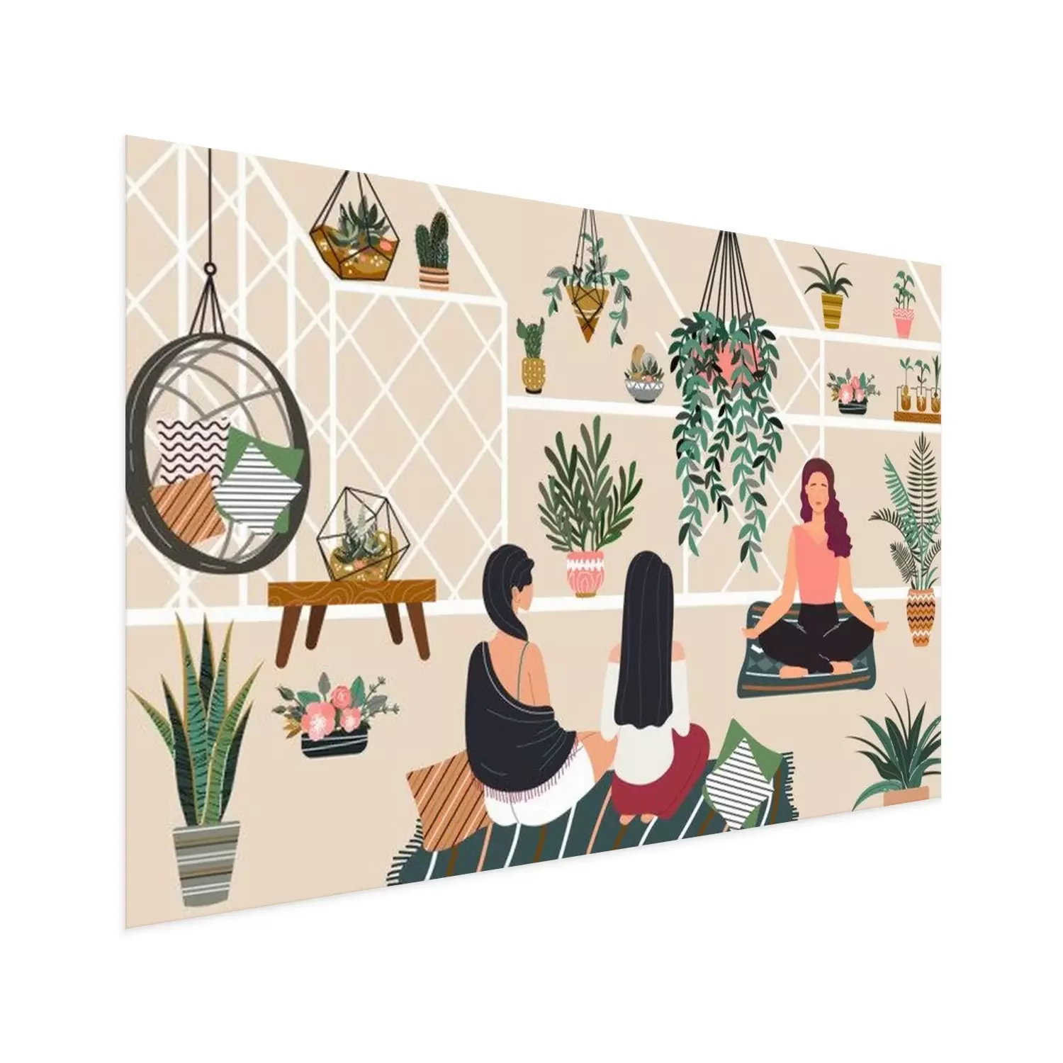 Poster: People relax yoga and meditation in greenhouse hygge home, women siiting in scandinavian style room with green plants relaxing flat vector illustration. Relaxation in greenery home garden.