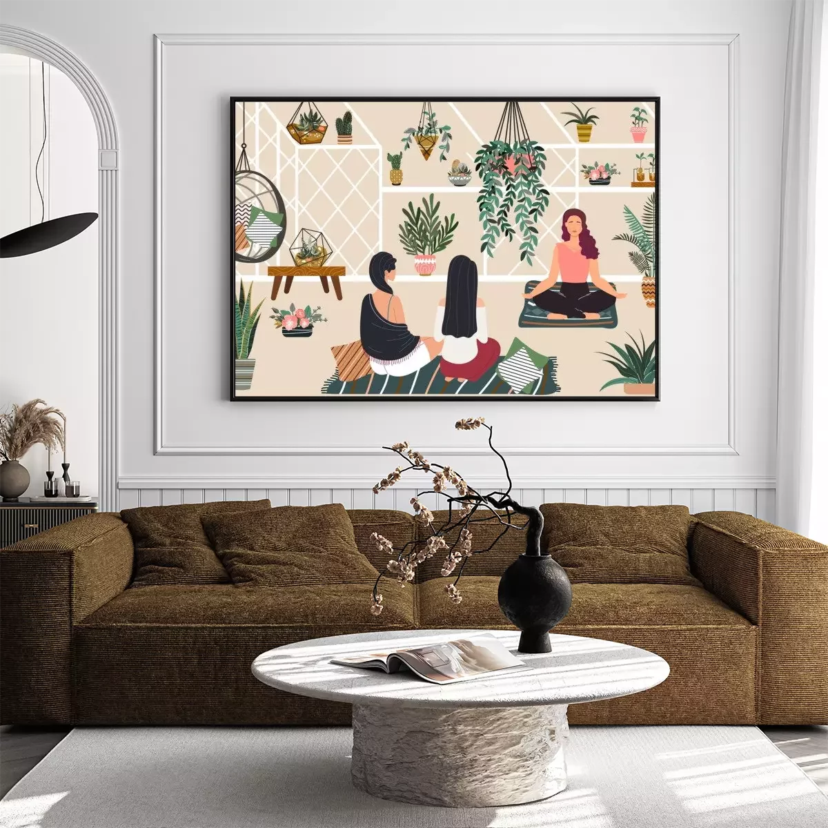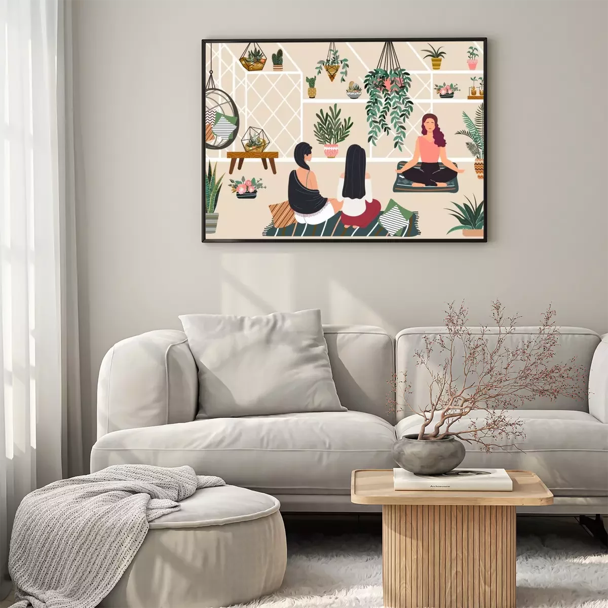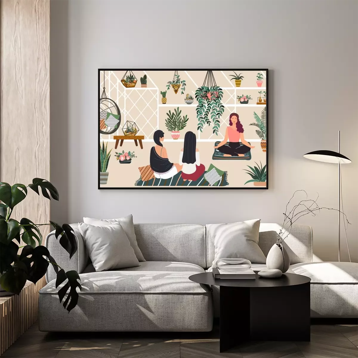 Poster People relax yoga and meditation in greenhouse hygge home, women siiting in scandinavian style room with green plants relaxing flat vector illustration. Relaxation in greenery home garden.