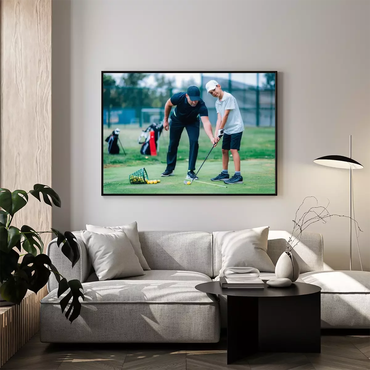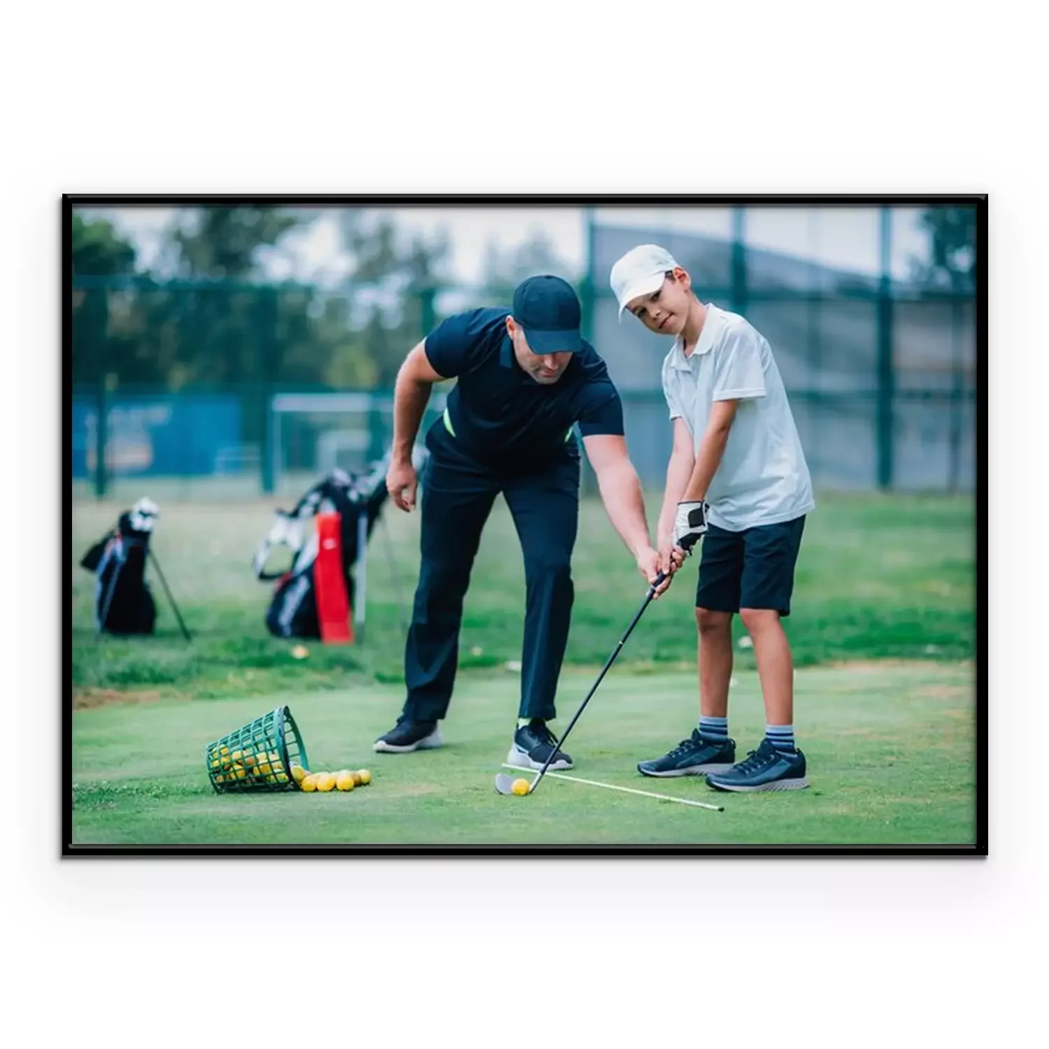 Poster: Personal golf lesson. Golf instructor with young boy on a golf driving range.