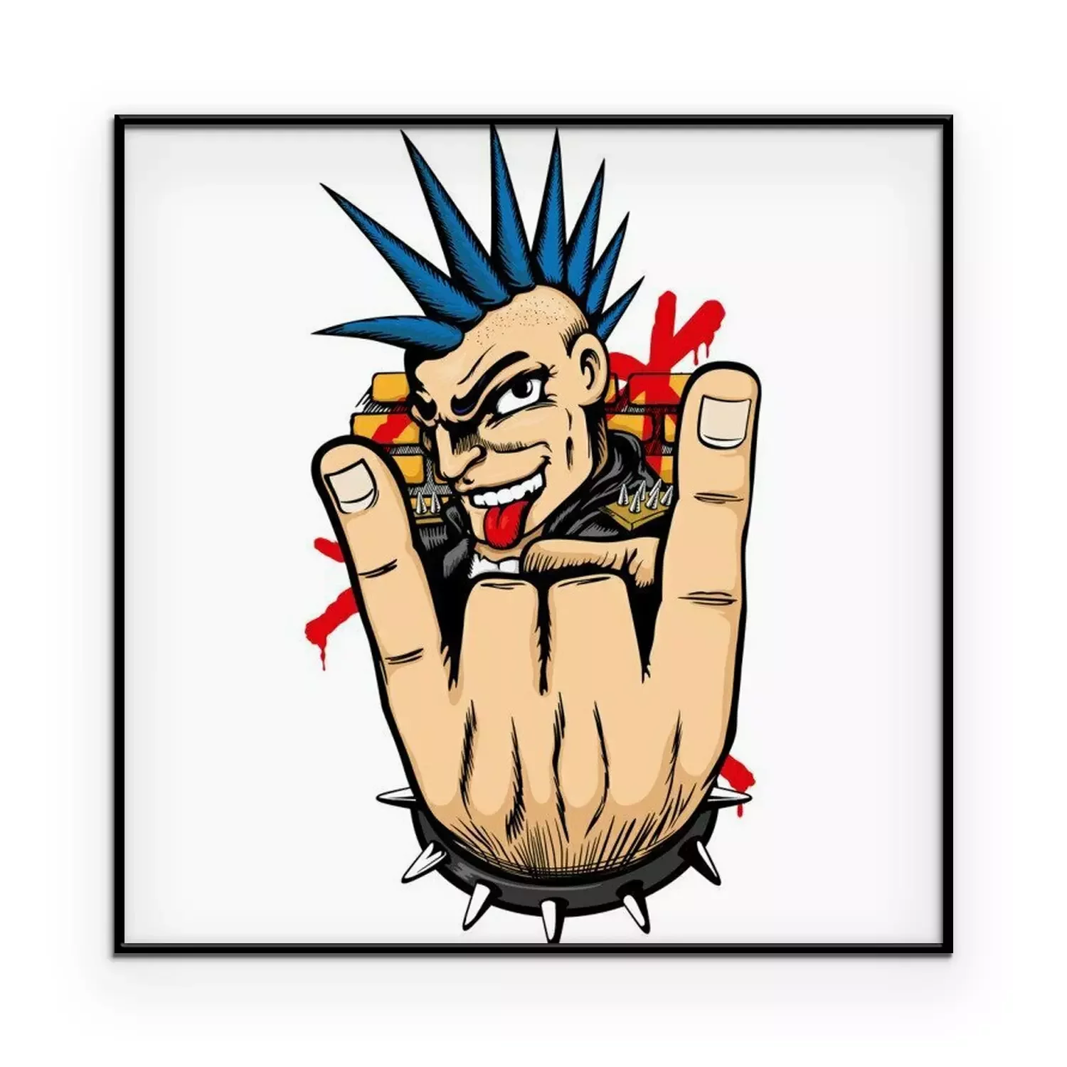 Poster: Persoon die de punkbeweging vertegenwoordigt, met mohawk-haar dat horens maakt met zijn vingers en tong. Ideaal voor materialen op cultuur en sociale bewegingen