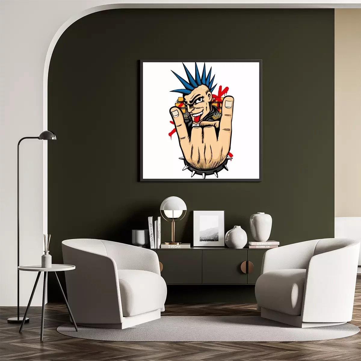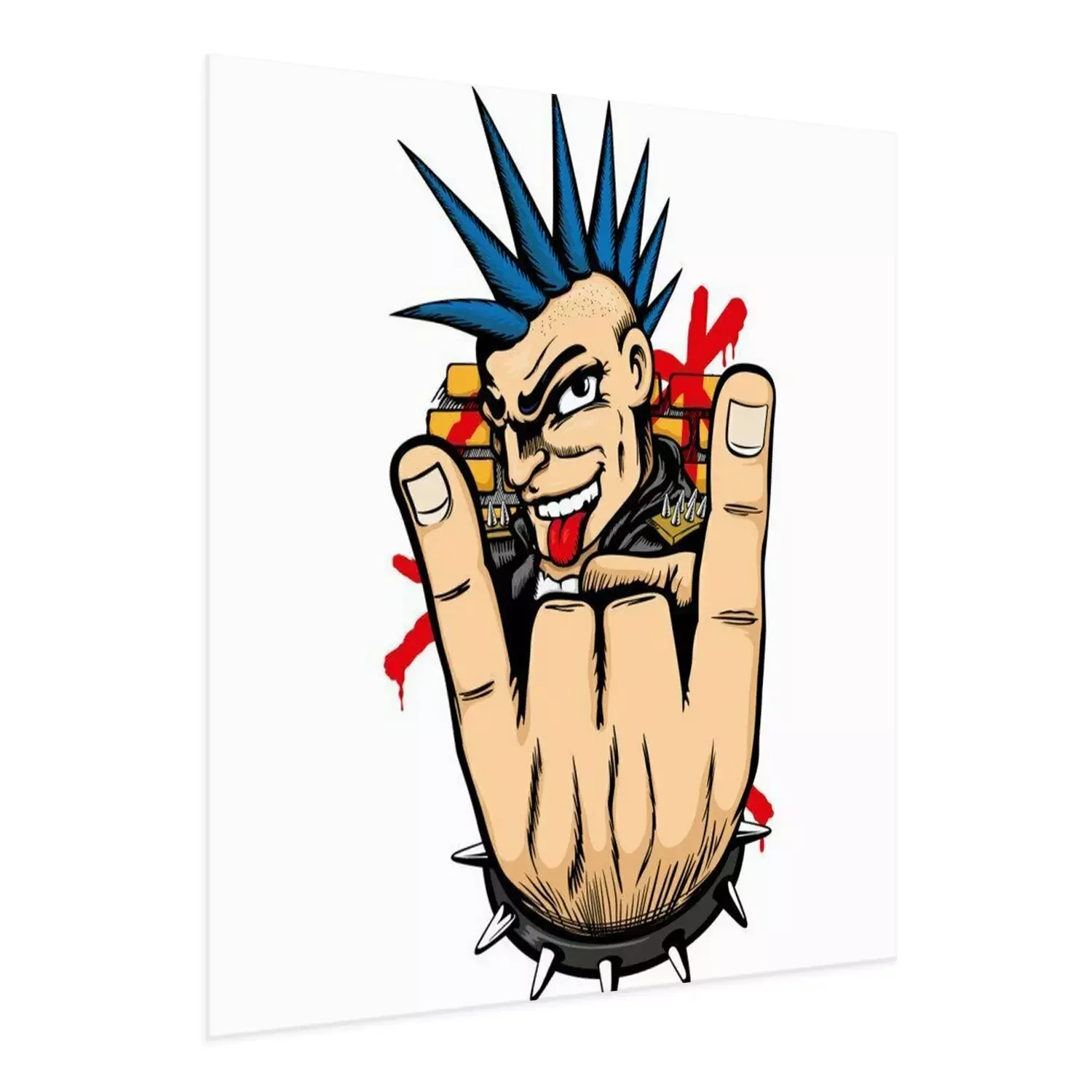 Poster Persoon die de punkbeweging vertegenwoordigt, met mohawk-haar dat horens maakt met zijn vingers en tong. Ideaal voor materialen op cultuur en sociale bewegingen