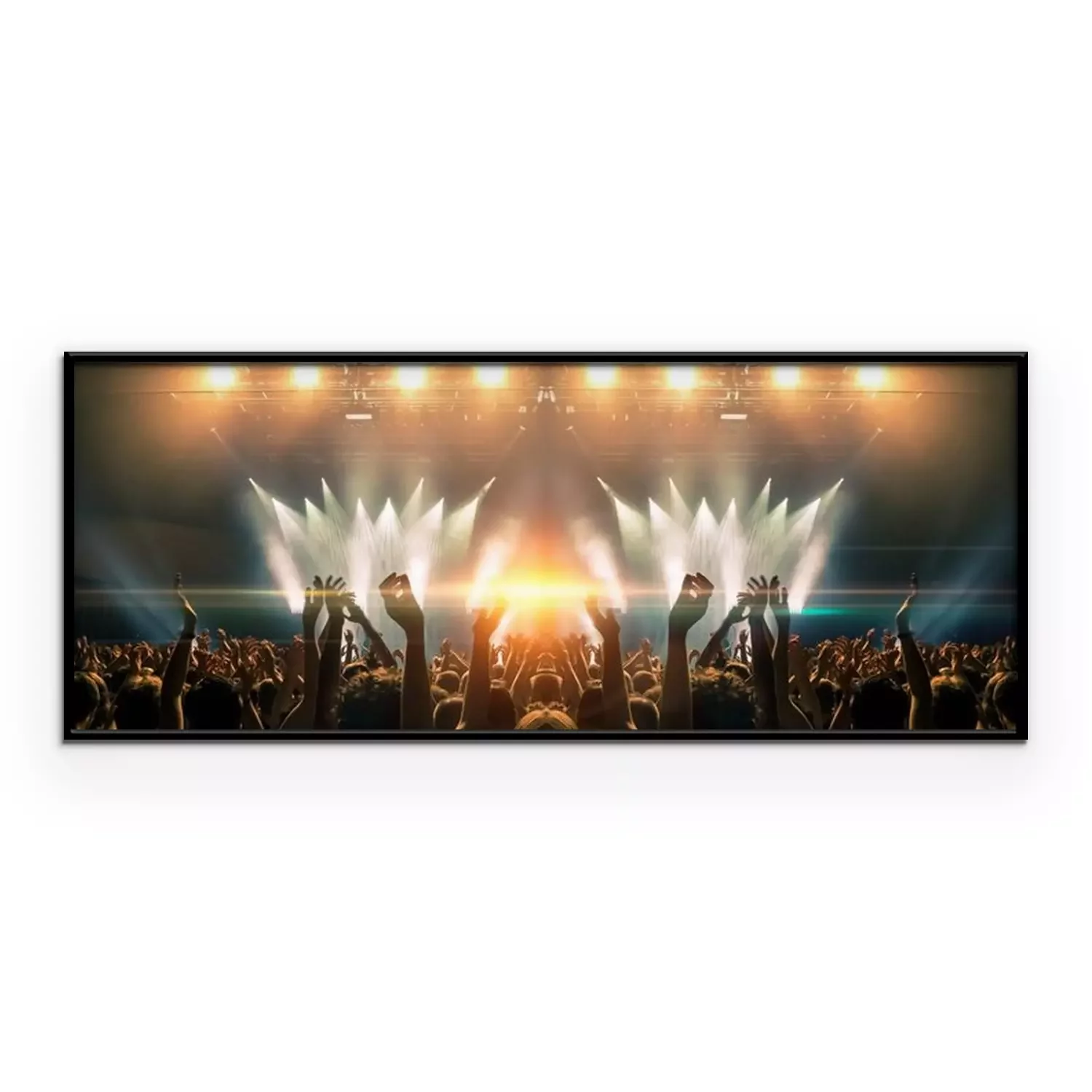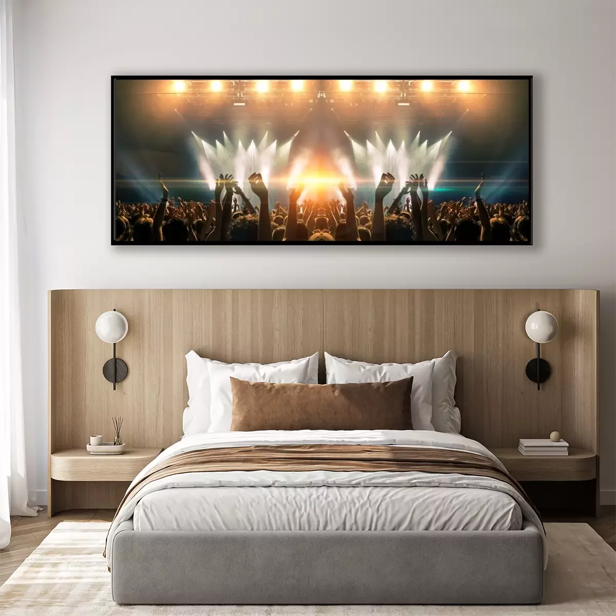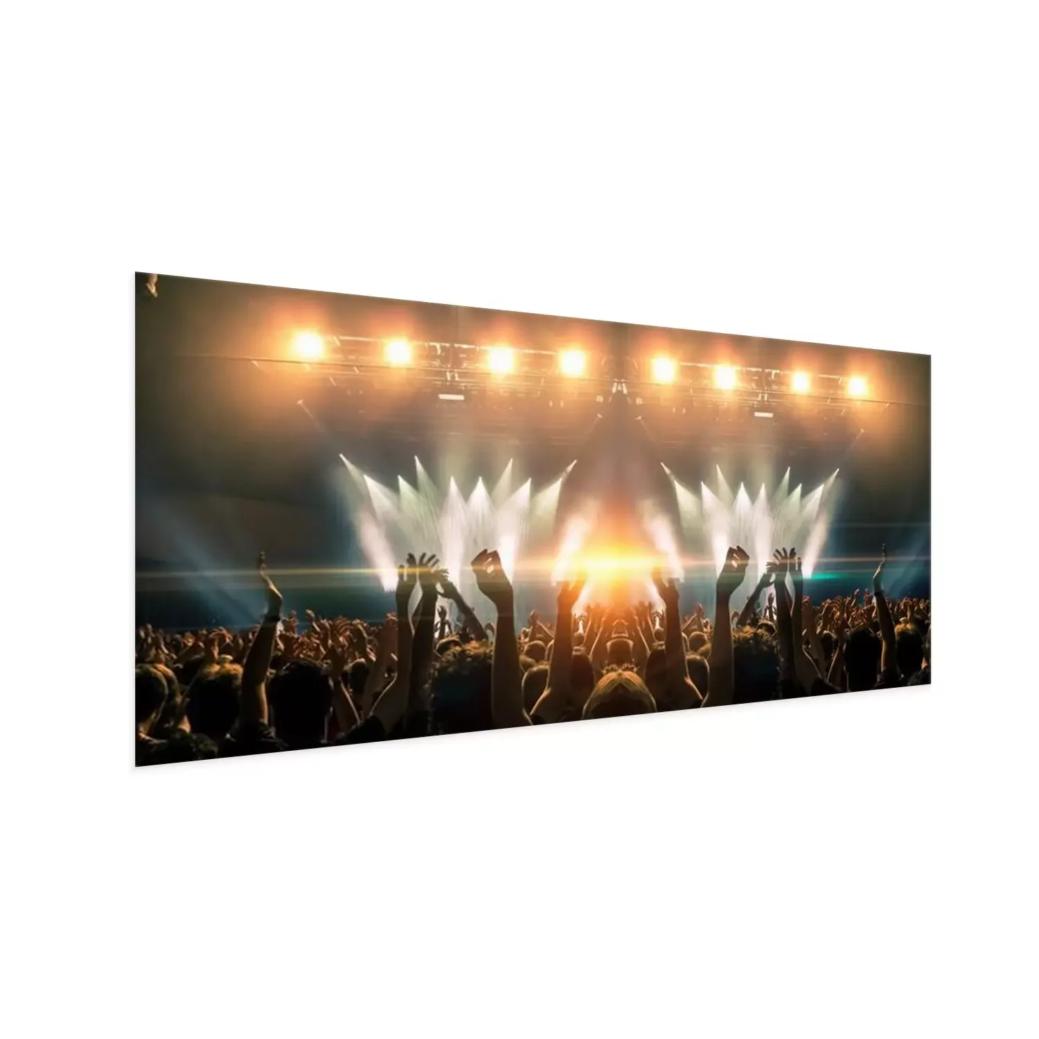 Poster Photo of a concert hall with people silhouettes clapping in front of a big stage lit by spotlights. Shot is taken from concert crowd point of view, lens flare is visible.