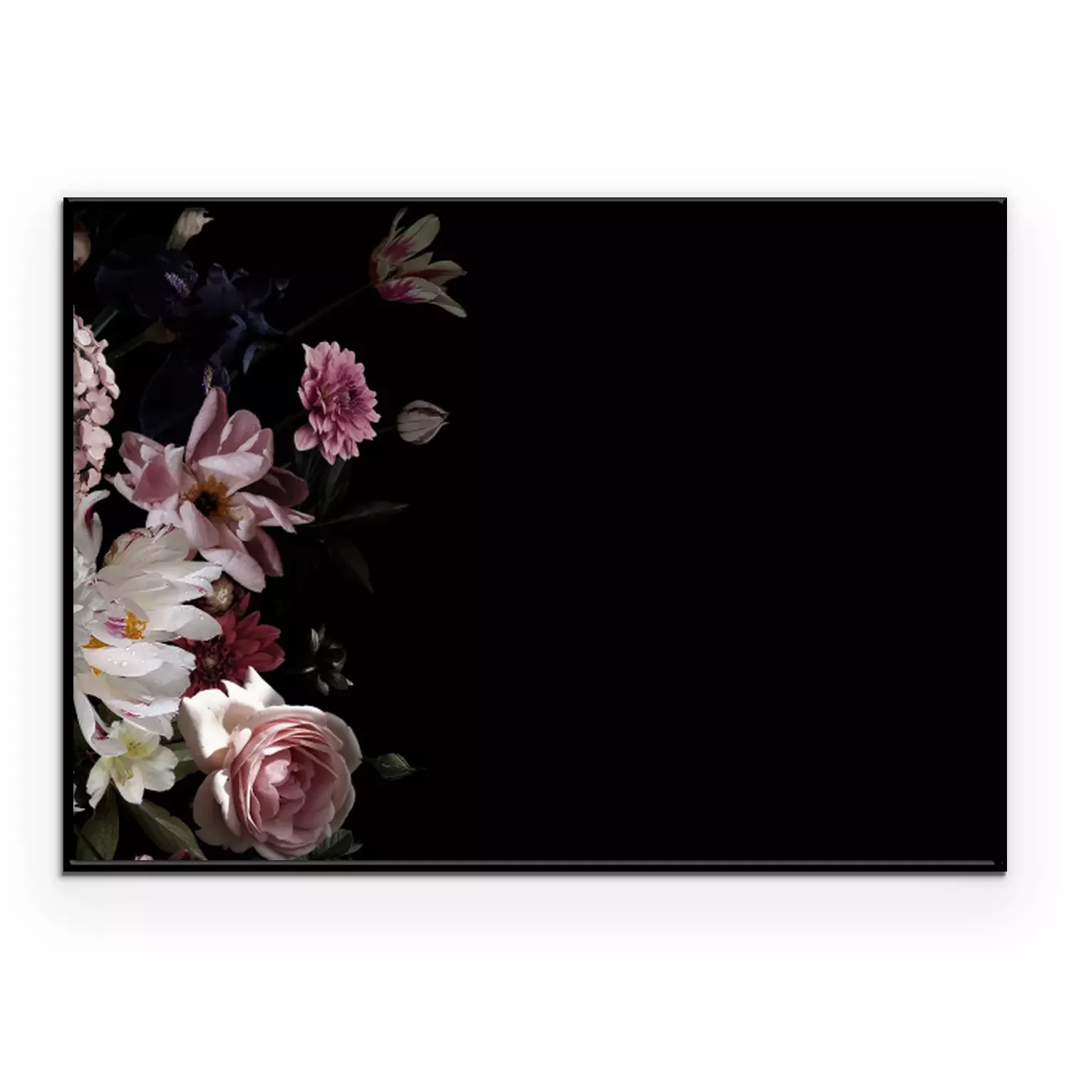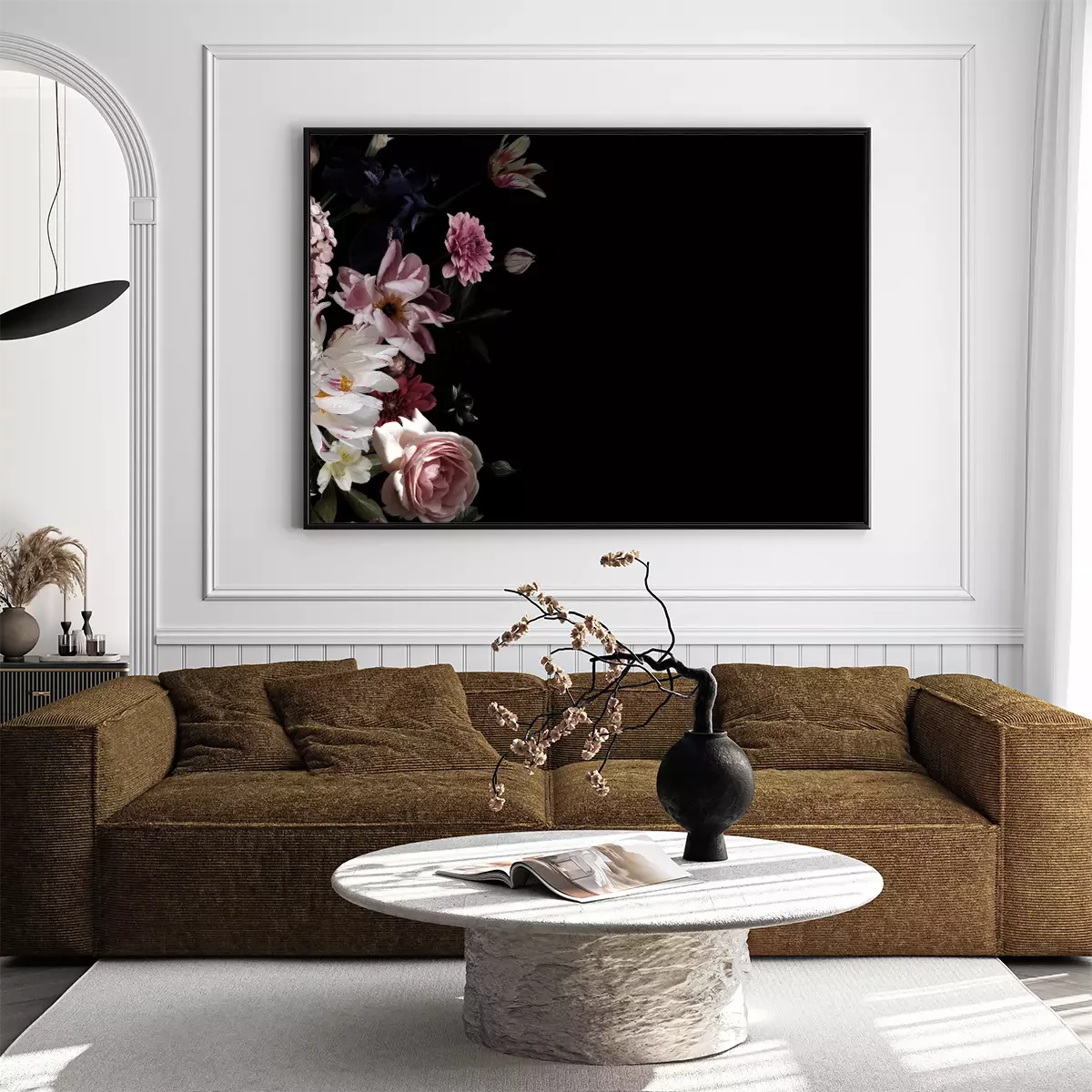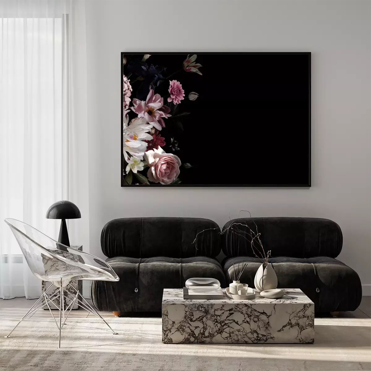 Een elegante compositie van tuinbloemen op een zwarte achtergrond