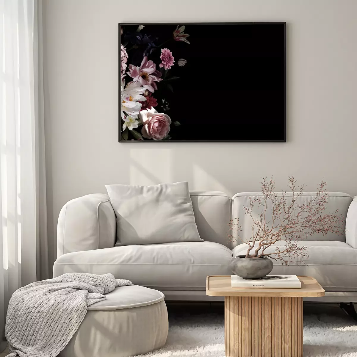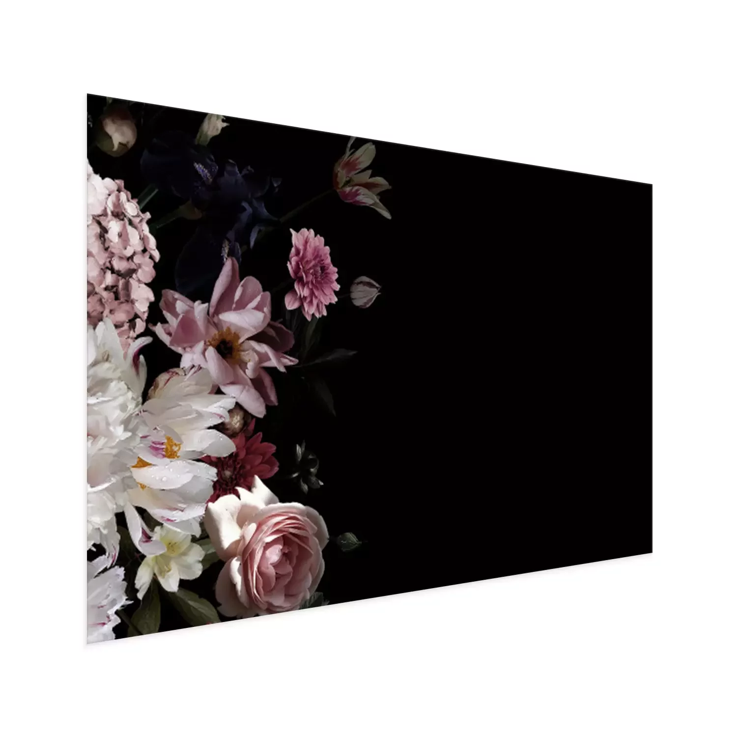 Poster: Pioenrozen in de duisternis van omhullende zwartheid
