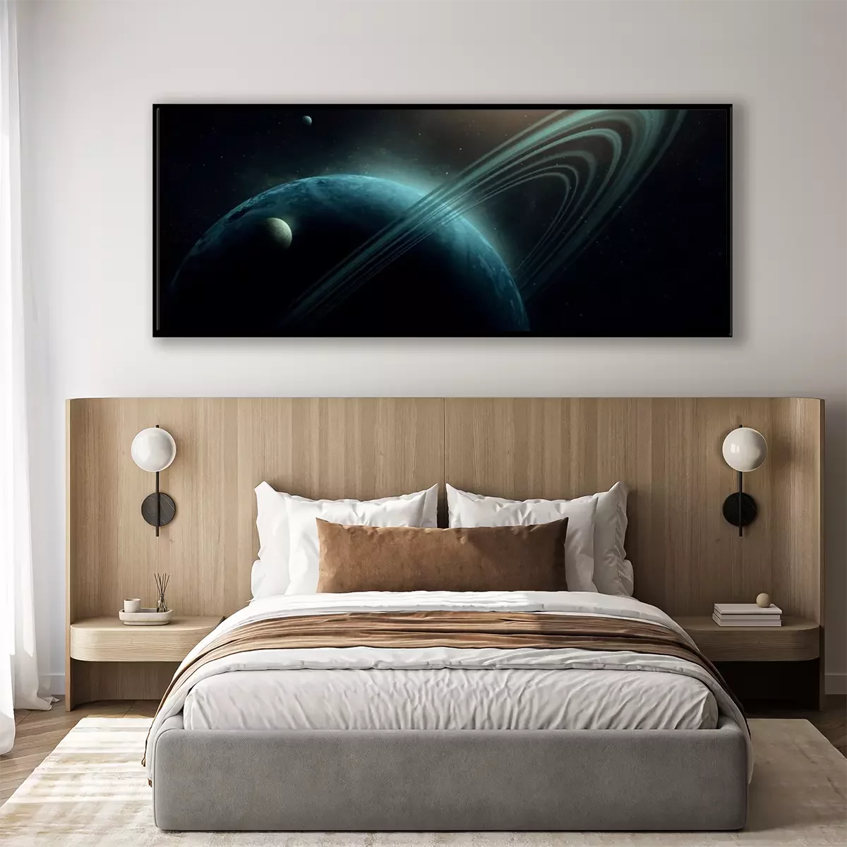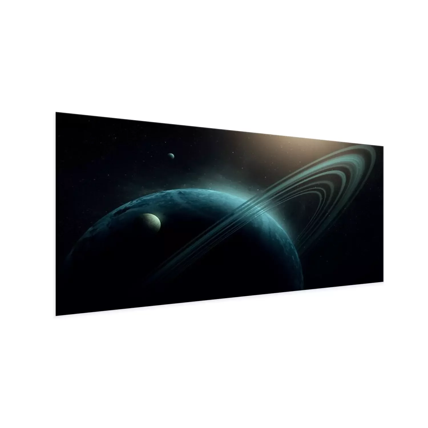 Poster: planet with rings and moons, planet and satellites sci fi space background realistic illustration (no NASA images used)
